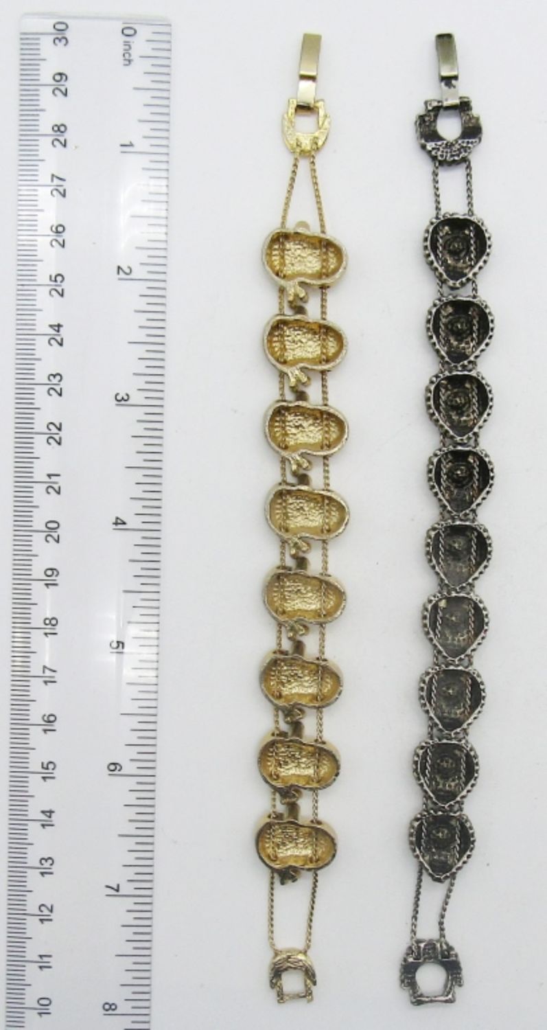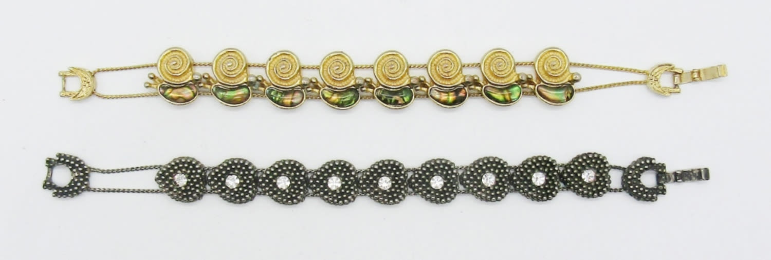 7 1/2IN LONG FOR BOTH, 1 GOLD TONE SNAIL WITH ABALONE INLAY, 1 SILVER TON HEART WITH CLEAR STONES IN THE MIDDLE OF EACH, OPEN BOX CLASP FOR BOTH,