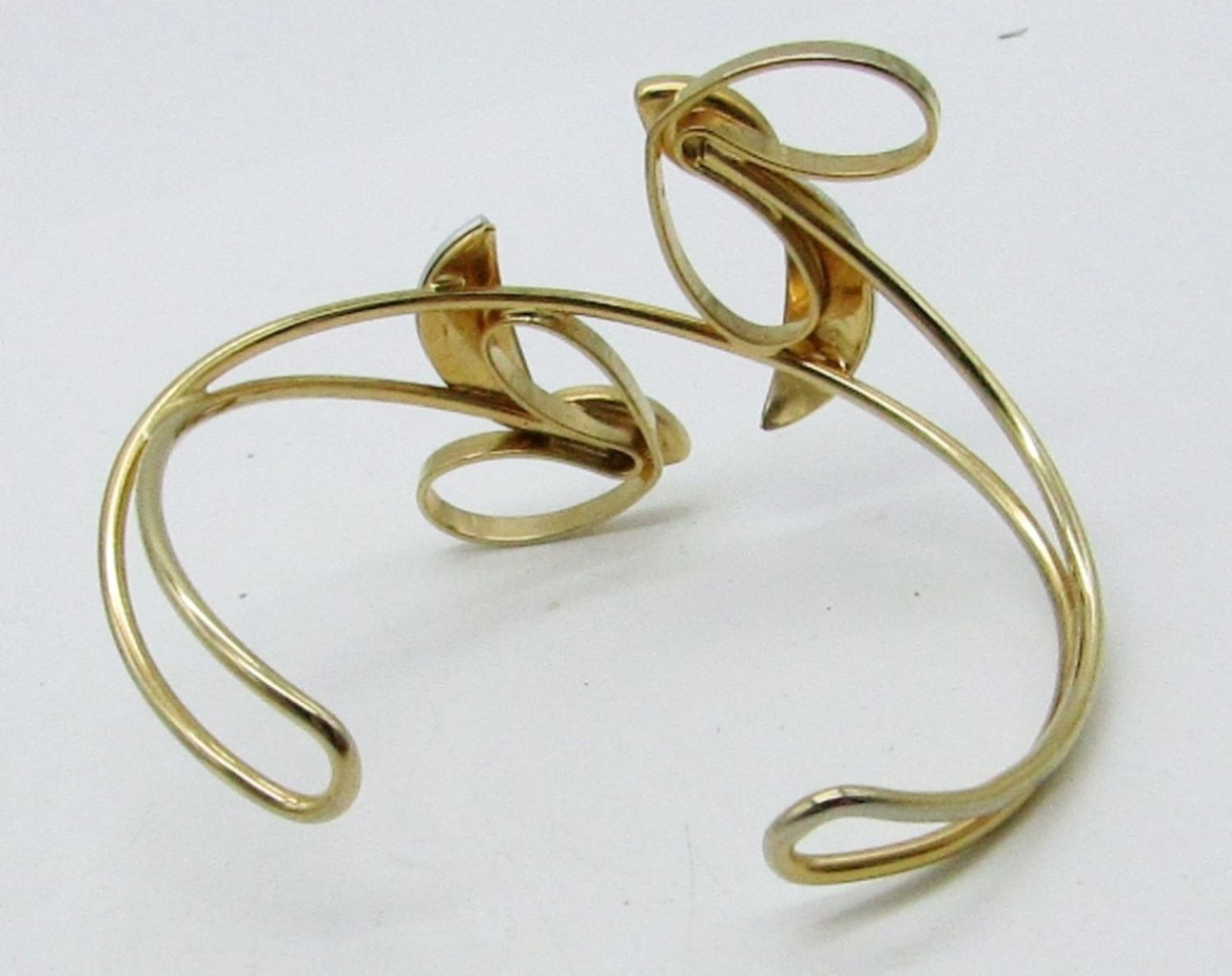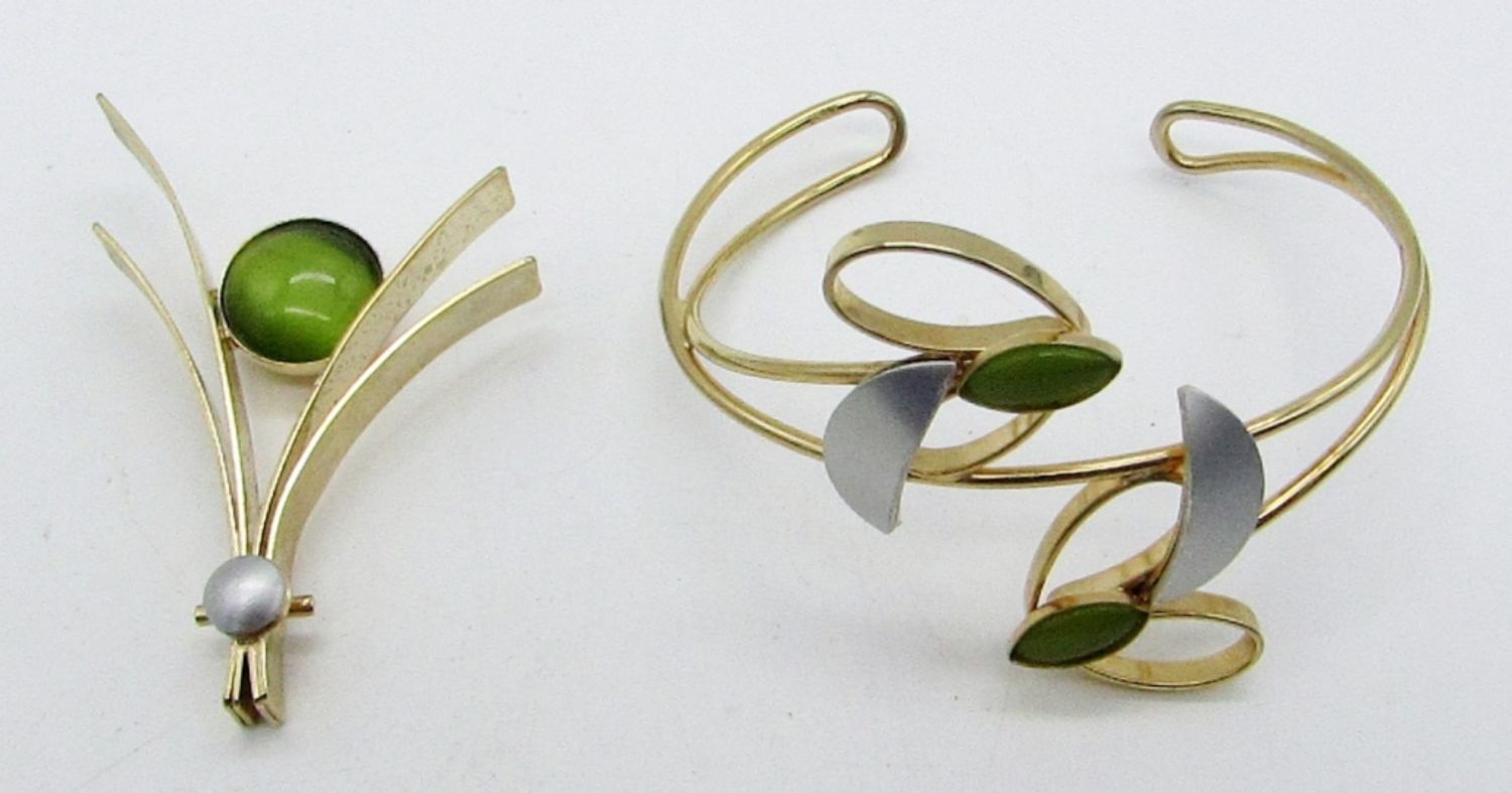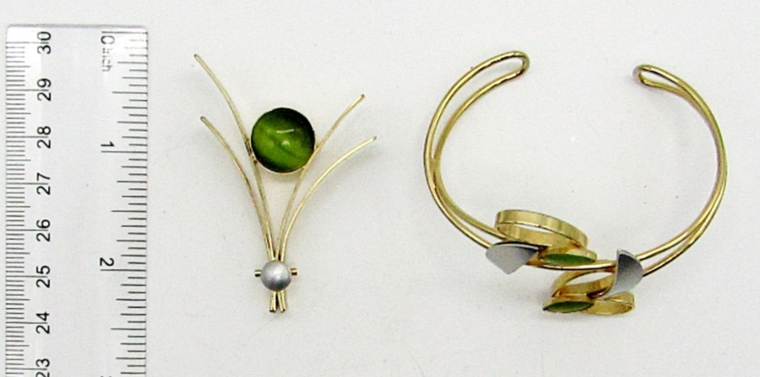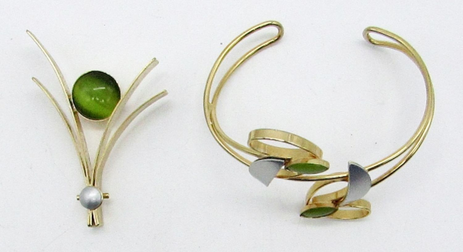 GOLD TONE WITH SILVER OVERLAY AND GREEN STONES ON PENDANT AND BRACELET, PENDANT IS 2IN LONG ,AND CUFF IS 6IN OVER GAP,