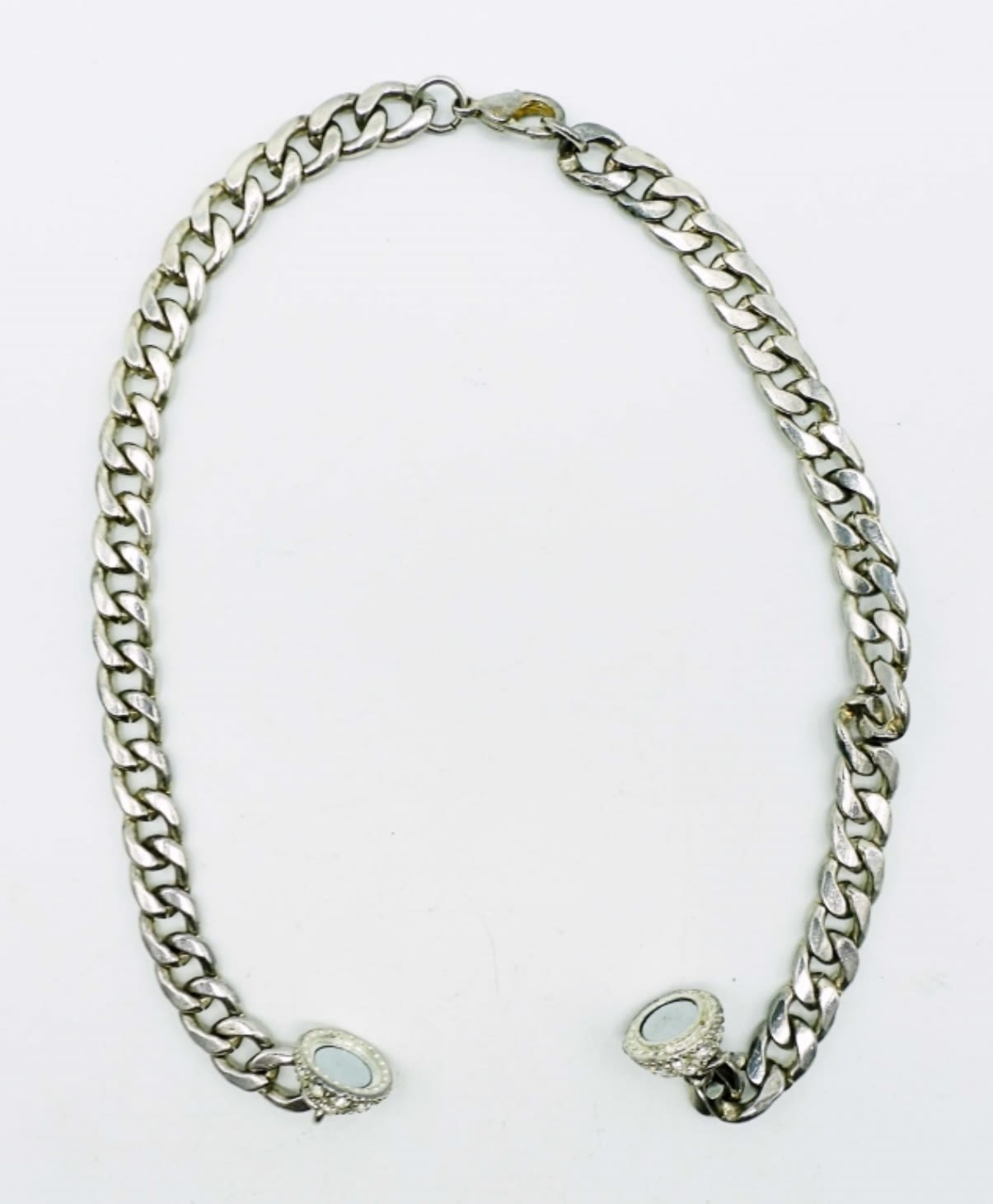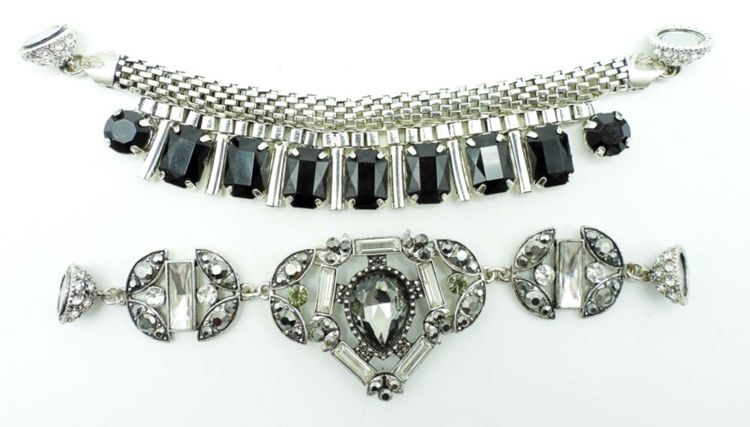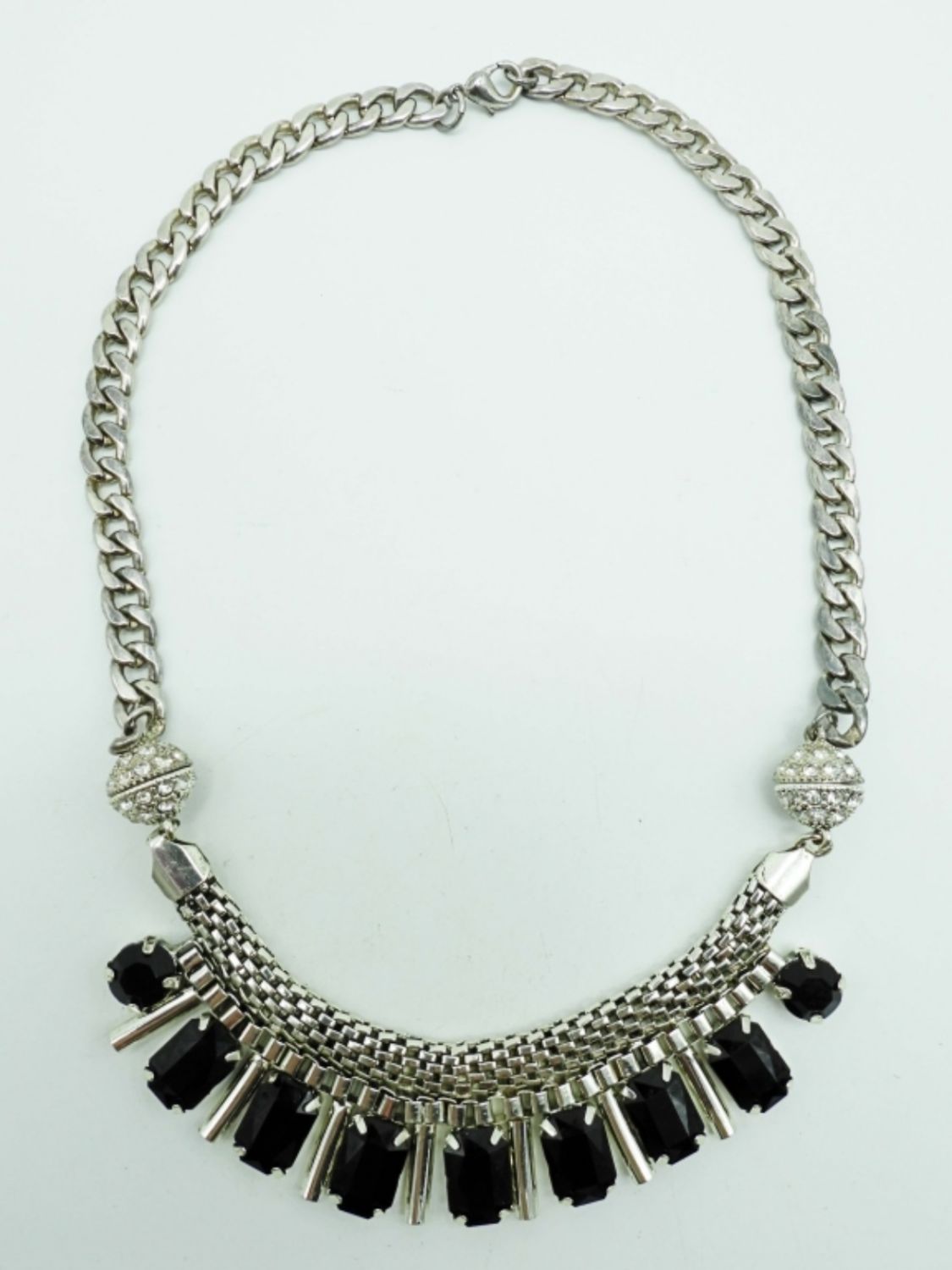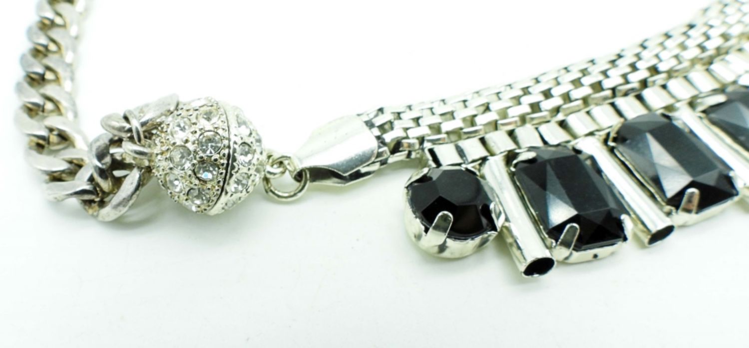 19IN LONG, THE CENTER ON THE NECKLACE IS HELD BY MAGNETS THAT CAN BE CHANGED, 1 CENTER HAS BLACK CLEAR STONES, THE OTHER IS BLACK ONYX STONES, STUNNING UNIQUE