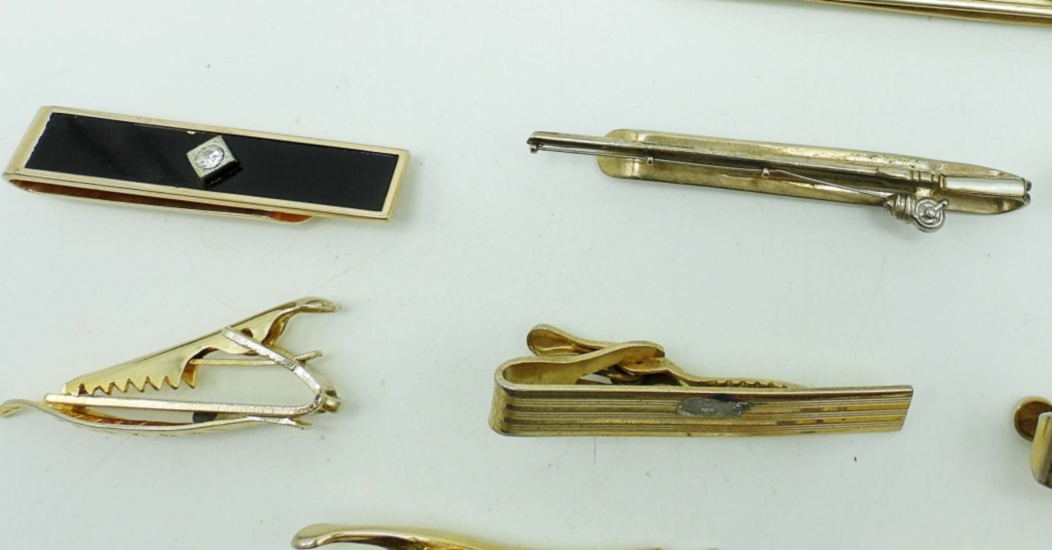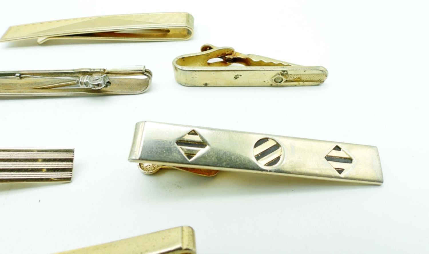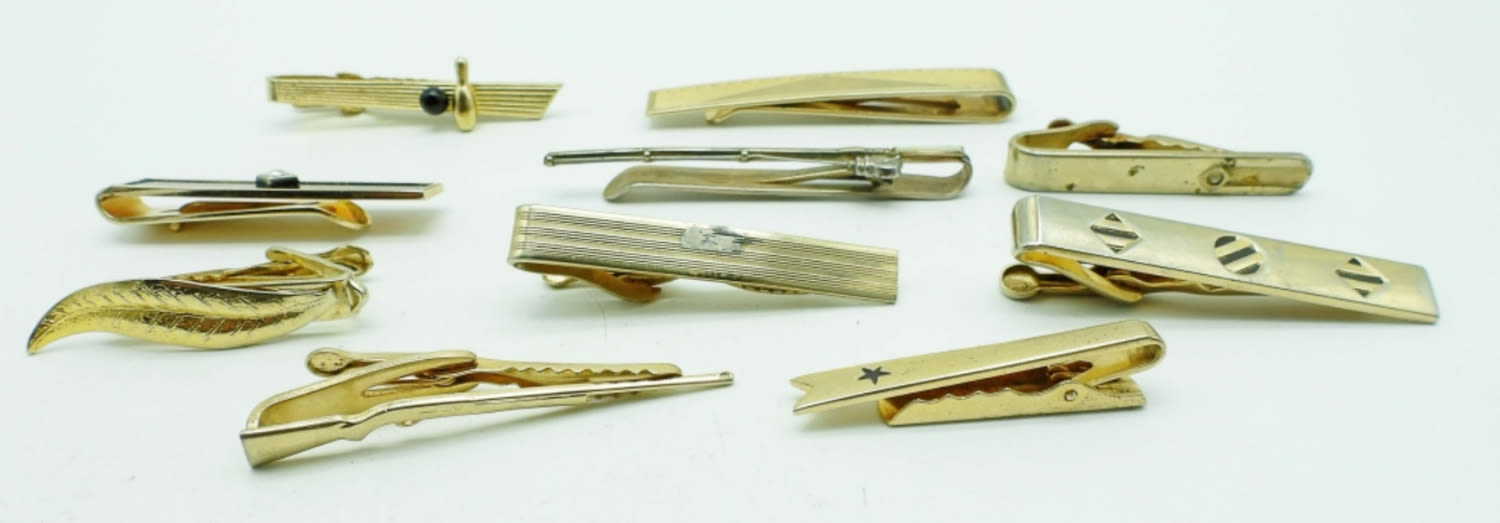 ALL GOLD TONE LOT, 3- SWANK CLIPS IN THIS MIX, ALL DIFFERENT FISHING POLES, BOWLING THEME TO NAME SOME