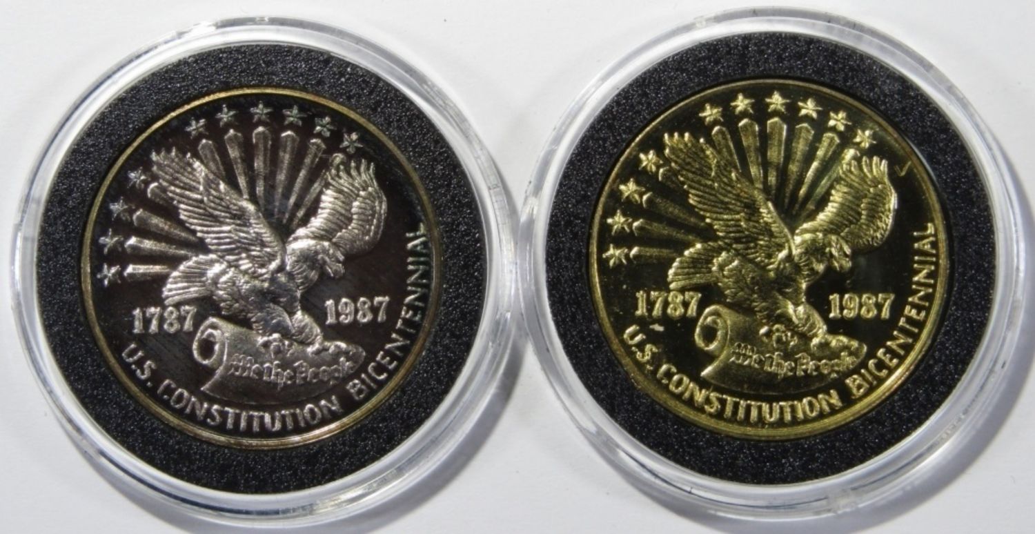 (2) 1/2 oz .999 SILVER CONSTITUTION BICENTENNIAL ROUNDS. ONE ELECTROPLATED WITH 24K GOLD. IN DISPLAY BOX WITH COA. UNITY MINT. (1oz .999 SILVER TOTAL)