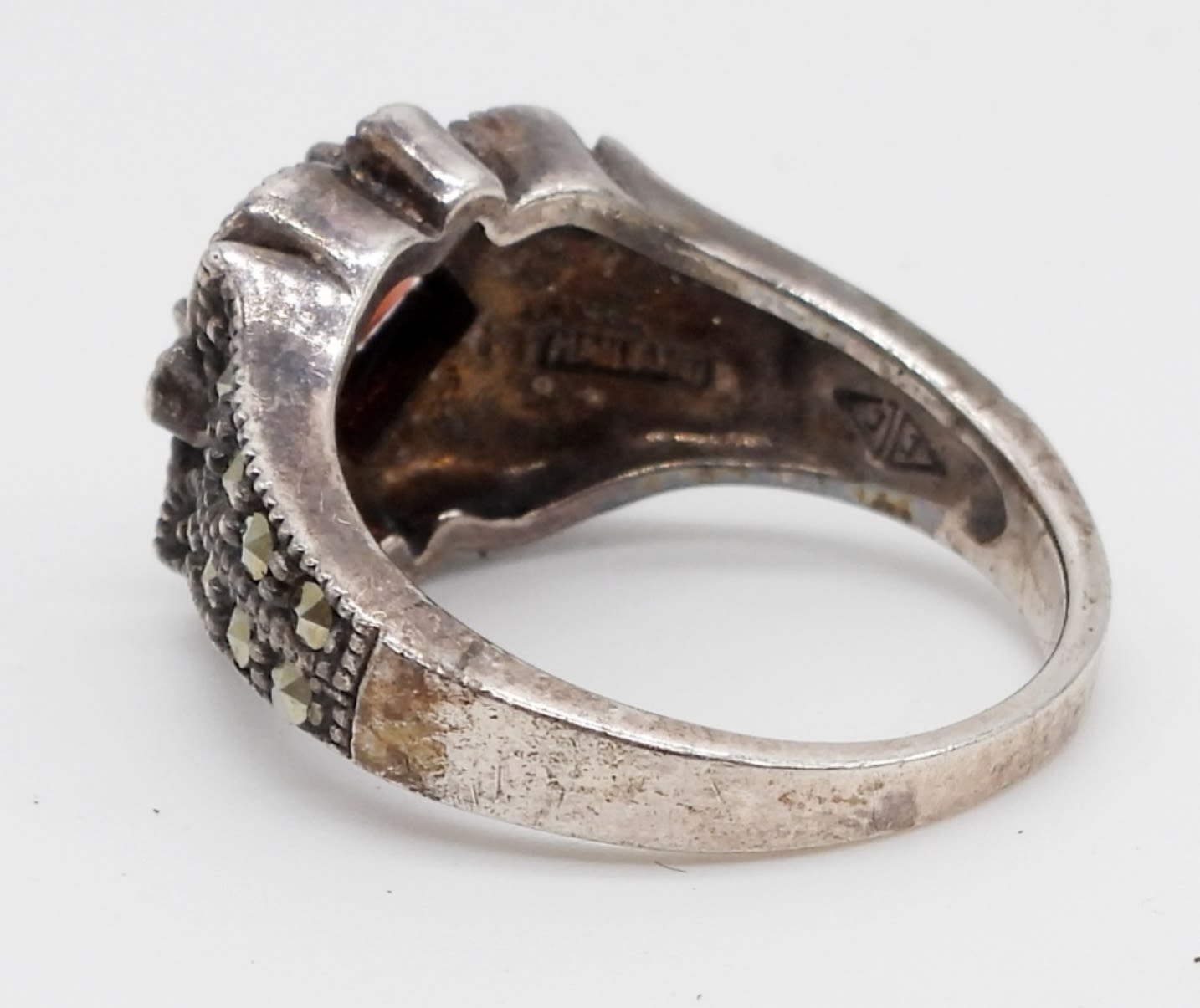 15.8 DWT; ORNATE PINK GEMSTONE; RED CLEAR GEMSTONES FLOWER; MARCASITE AMBER CENTER STONE; ETCHED RAISED NATIVE AMERICAN DESIGN; SIZES (3) 6, 10.5; MARKED 925