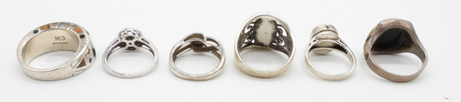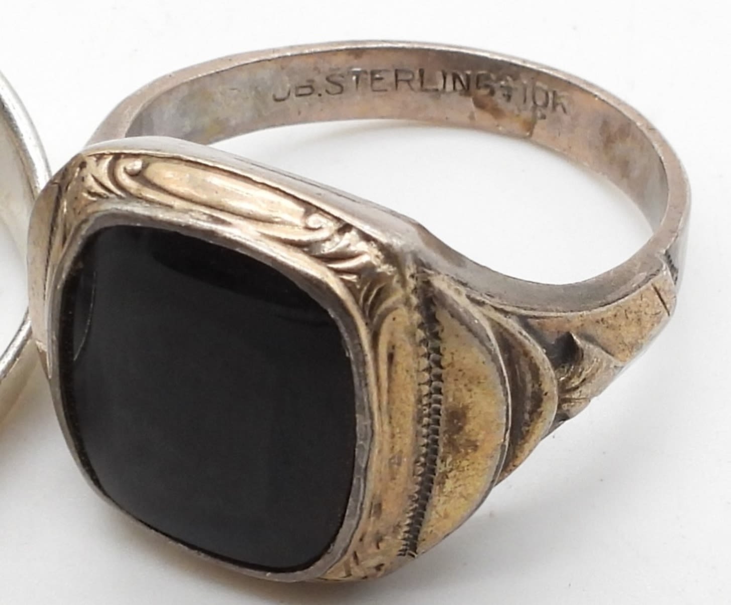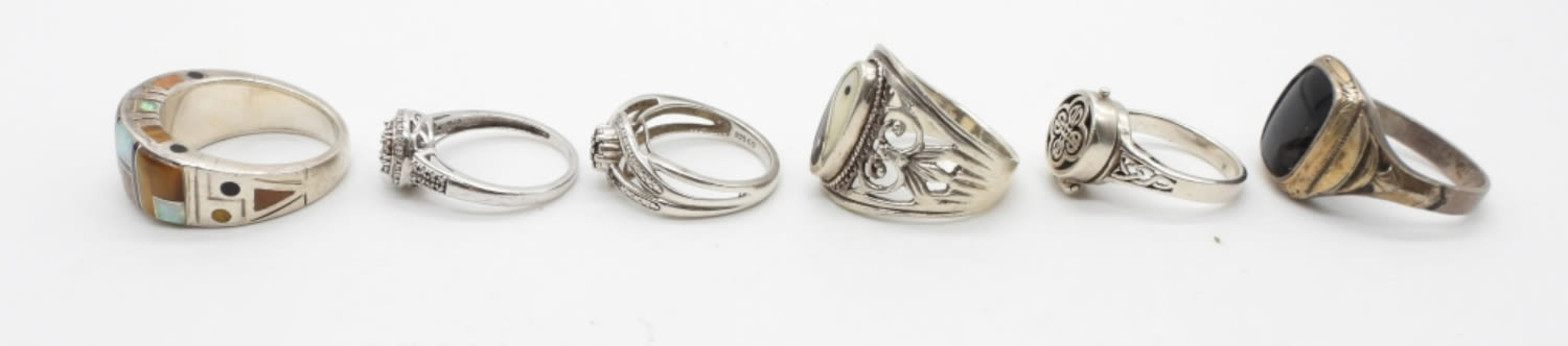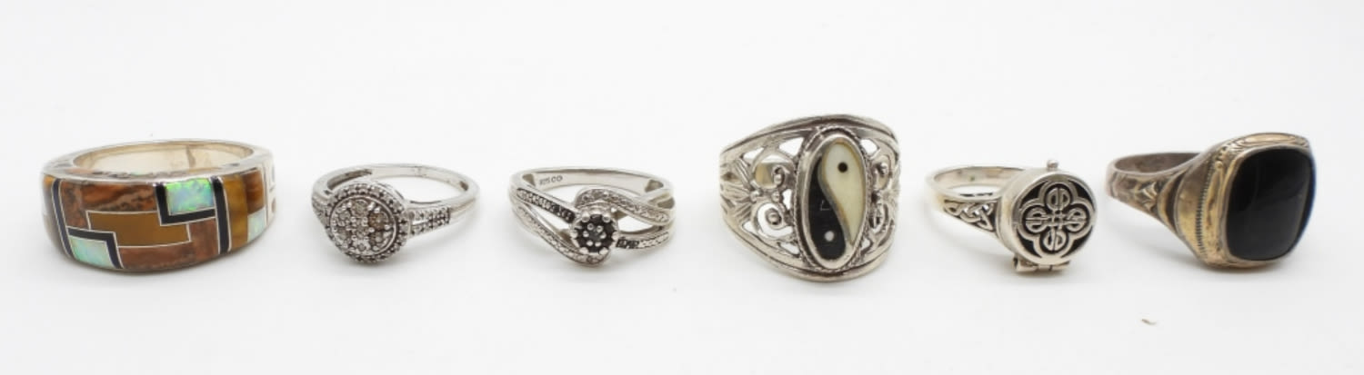 22.2 DWT; ORNATE BEAUTIFUL DESIGNS; YIN YANG; BLACK ONYX NATURAL STONE; ABALONE INLAY; SIZES 7-10; MARKED 925