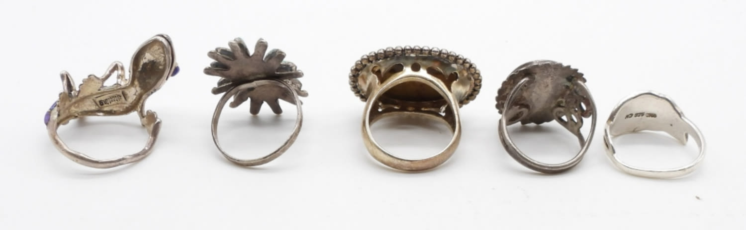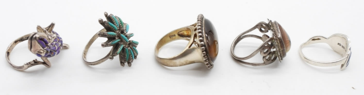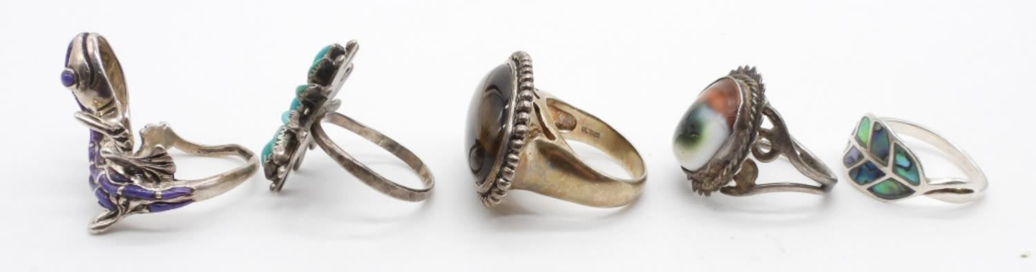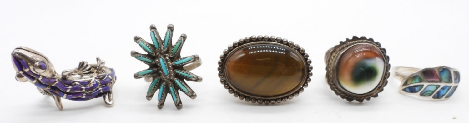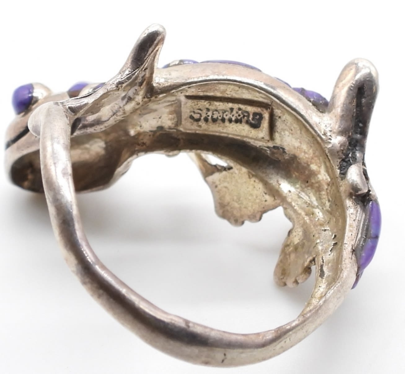 21.3 DWT; PURPLE LIZARD WRAP AROUND; TURQUOISE FLOWER; NATURAL STONE AMBER MULTI COLOR; ABALONE INLAY; SIZES 7-8; MARKED 925