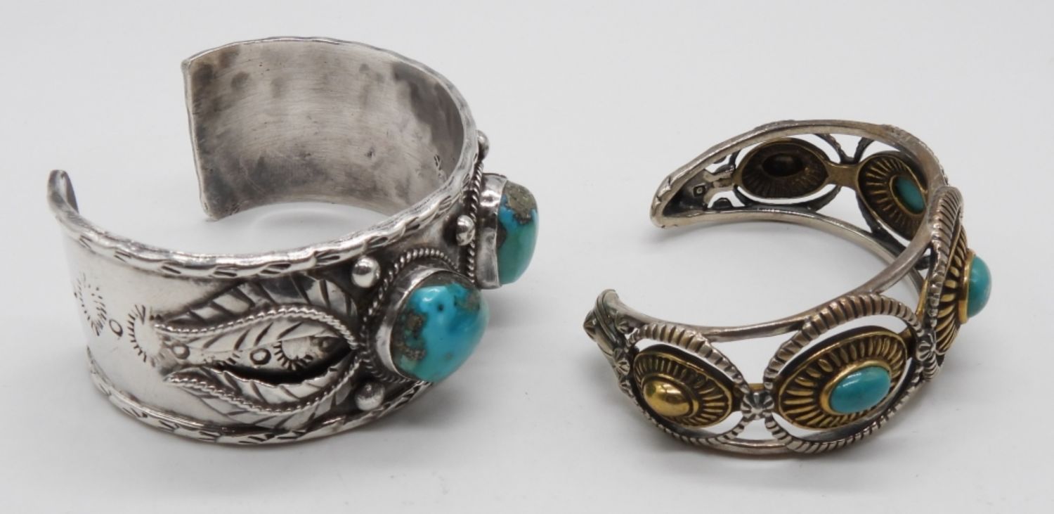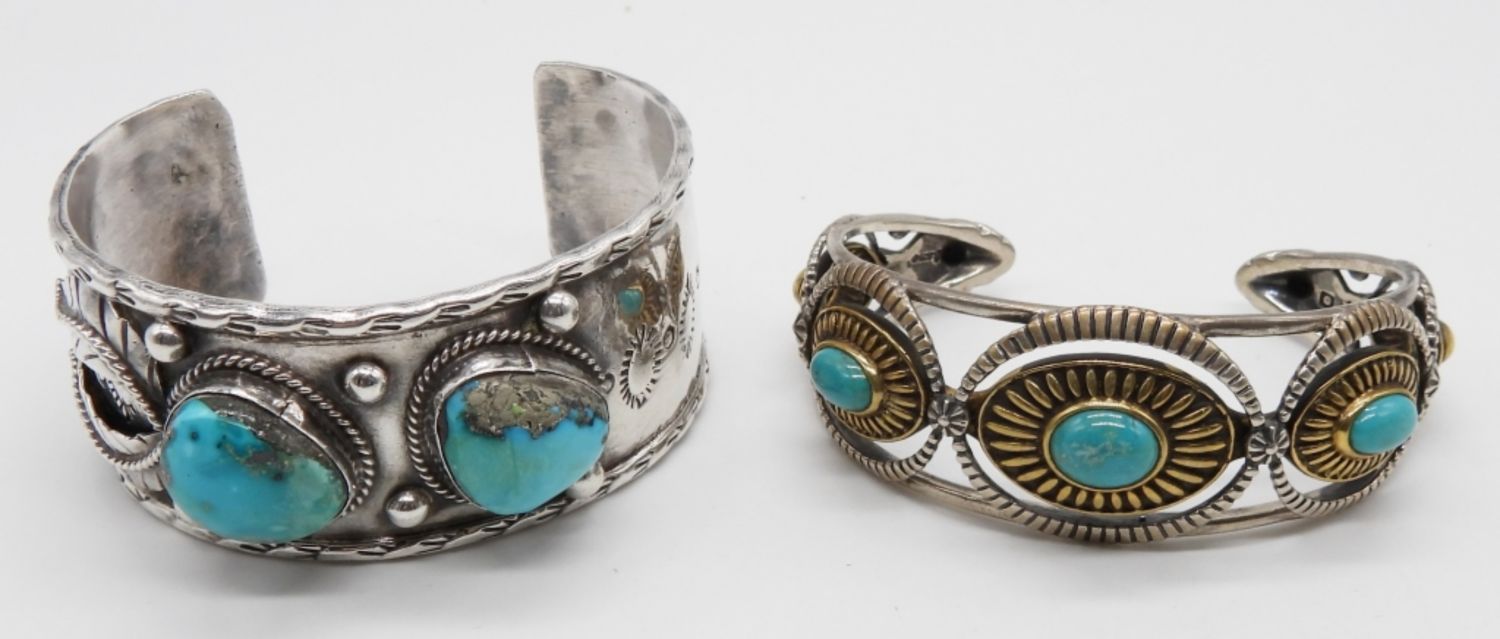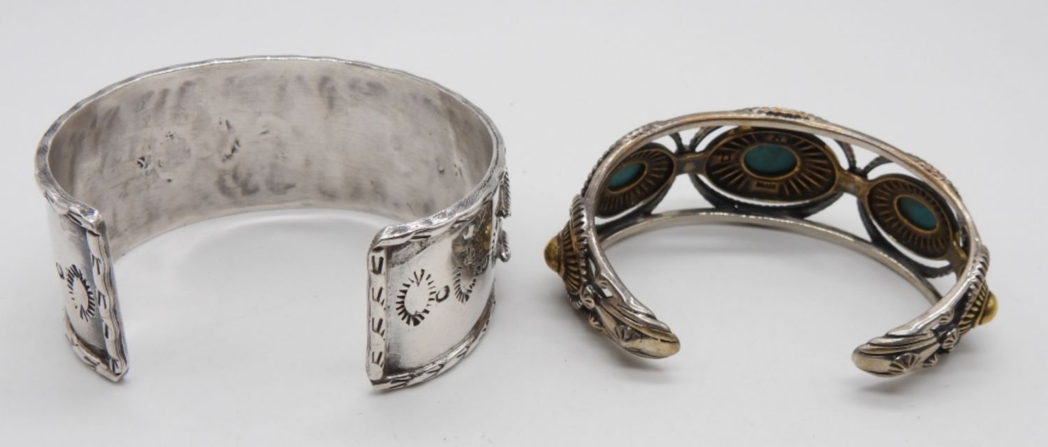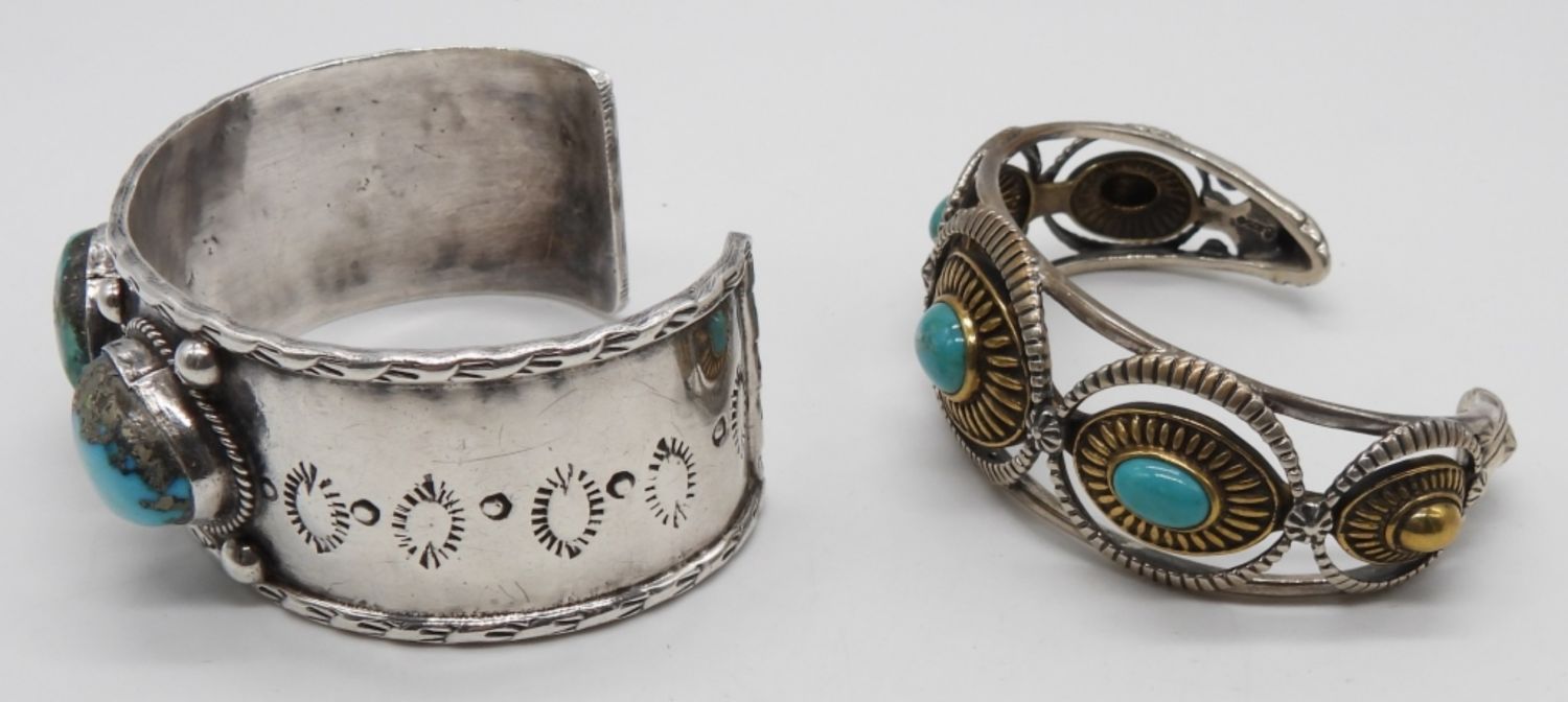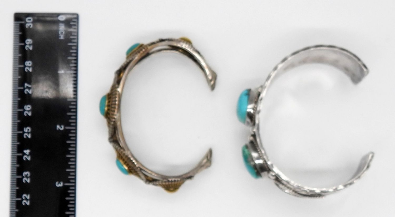 52.9 DWT; LOT OF 2 STERLING SOUTHWEST STYLE CUFF BRACELETS WITH TURQUOISE STONES IN BEAUTIFUL SETTINGS; MARKED 925