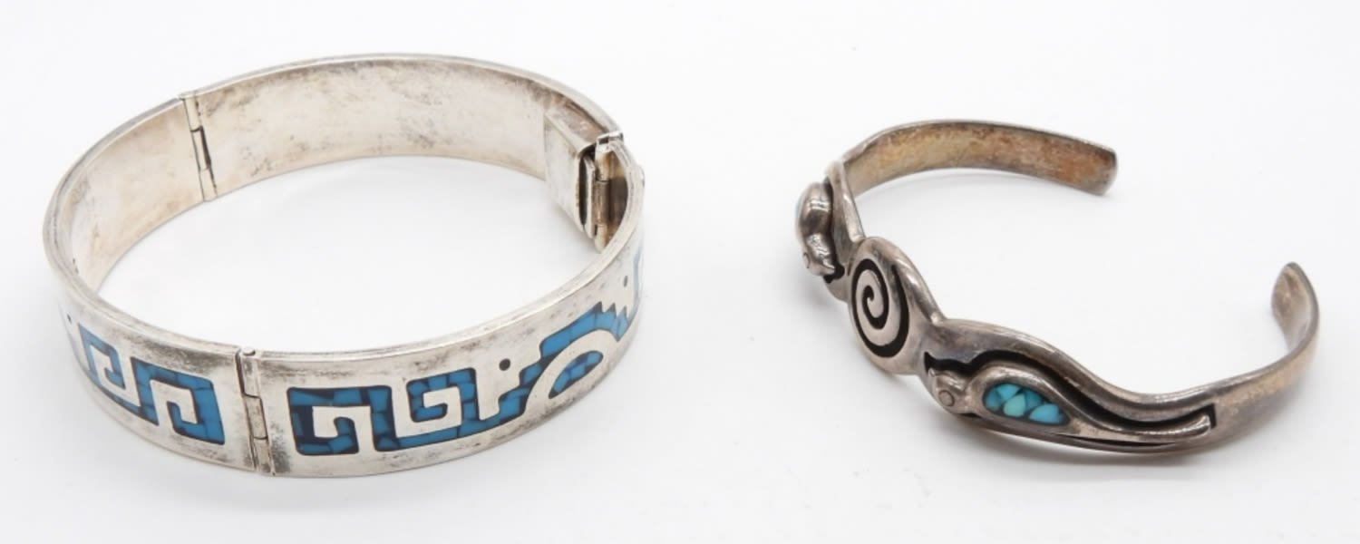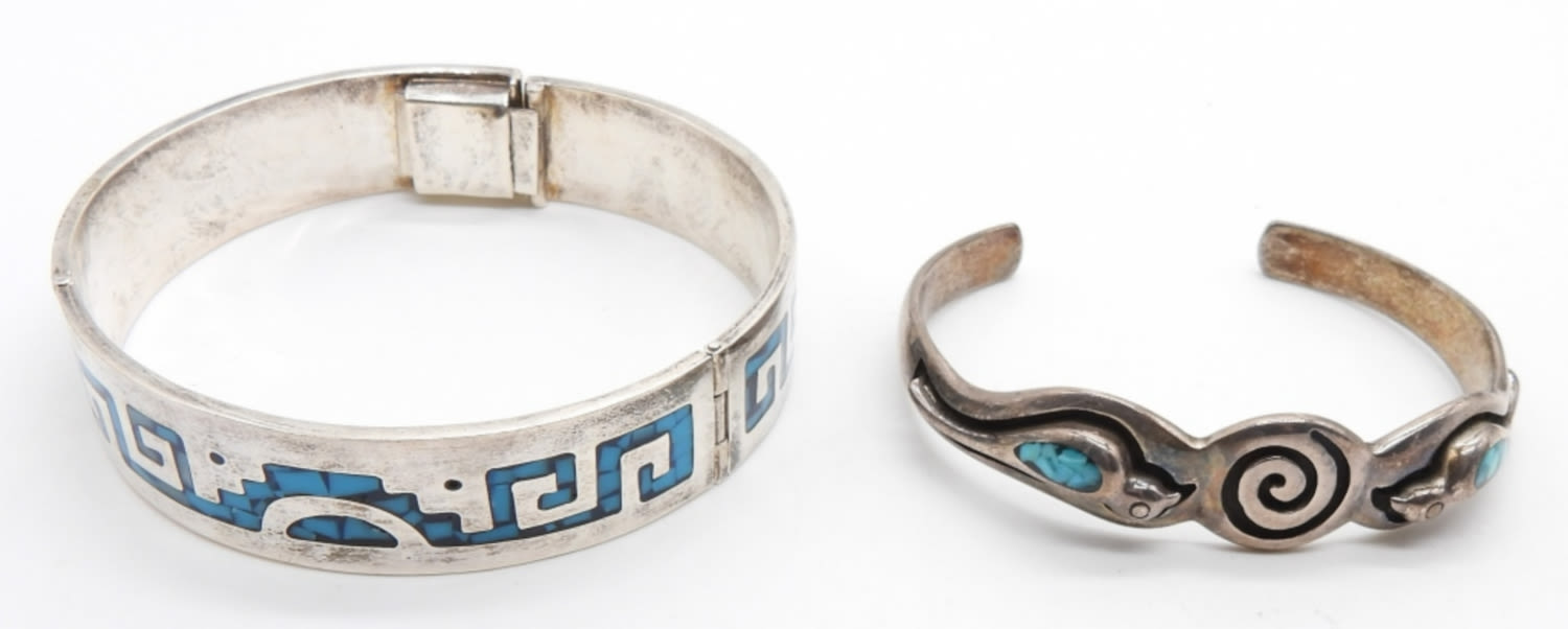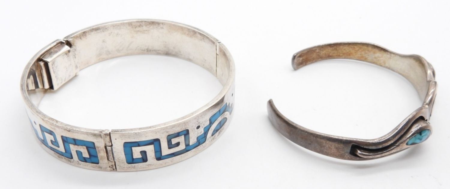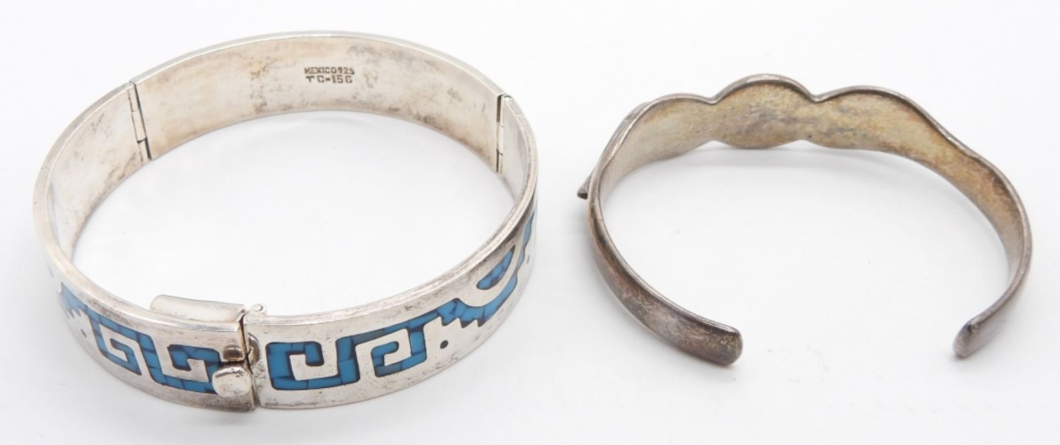 48.9 DWT; (1) CUFF STYLE STERLING SOUTHWEST STYLE BRACELET WITH TURQUOISE STONES; (1) HINGE STYLE SOUTHWEST TURQUOISE; MARKED MEXICO 925