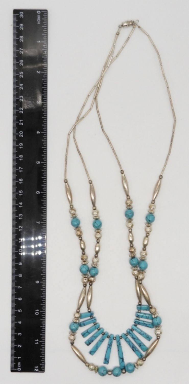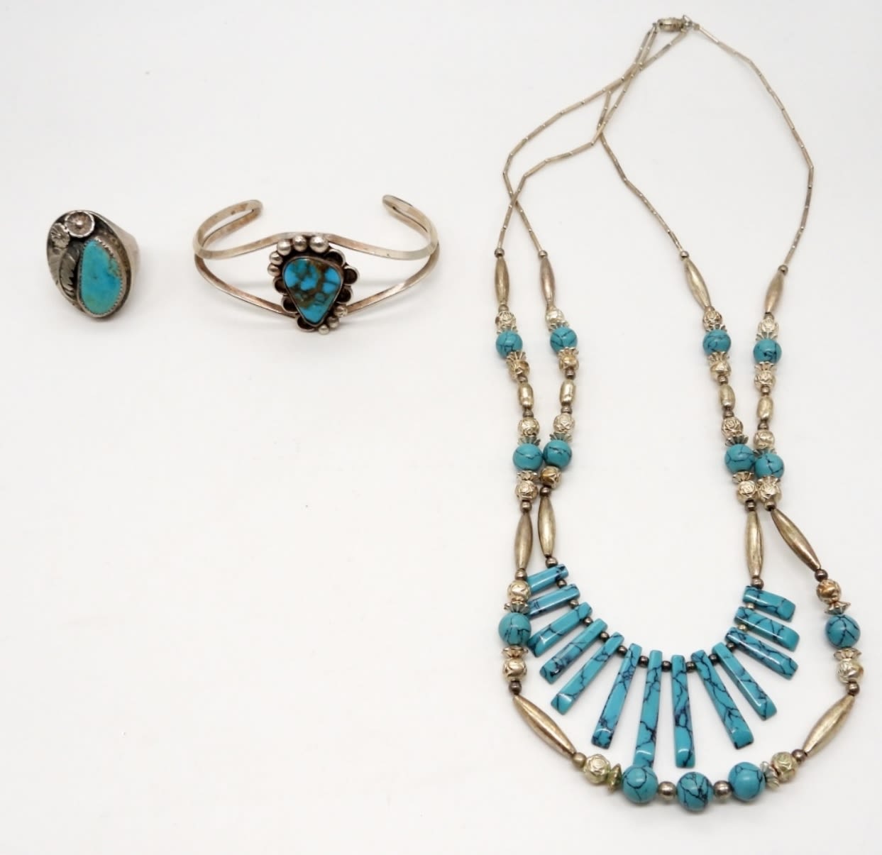 59.2 DWT; TURQUOISE SOUTHWEST STYLE NECKLACE 24″, CUFF STYLE BRACELET, RING (SIZE 10)