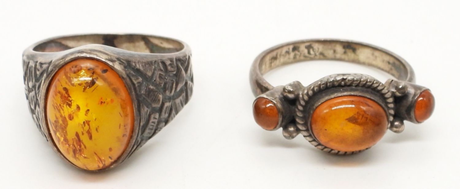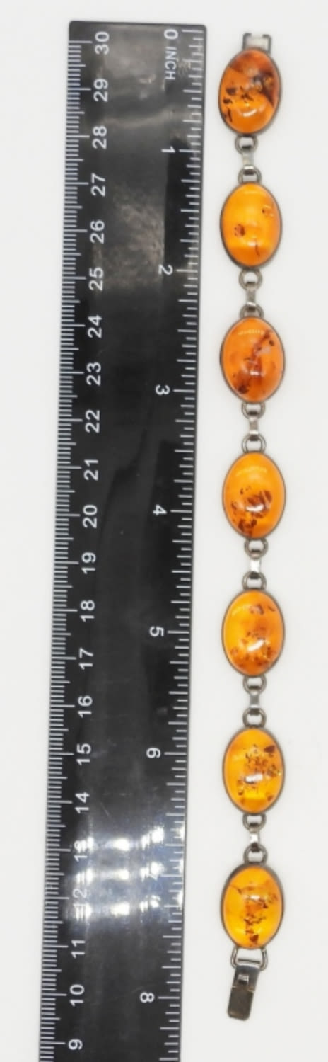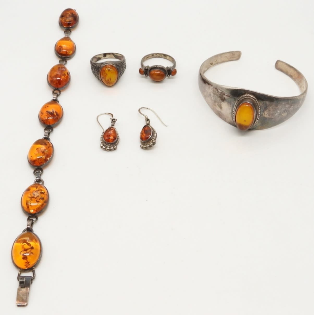 34.1 DWT; STERLING AMBER 8″ CHAIN BRACELET, CUFF STYLE BRACELET MARKED 925, (2) RINGS, EARRINGS STAMPED VM STERLING