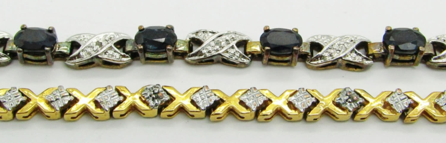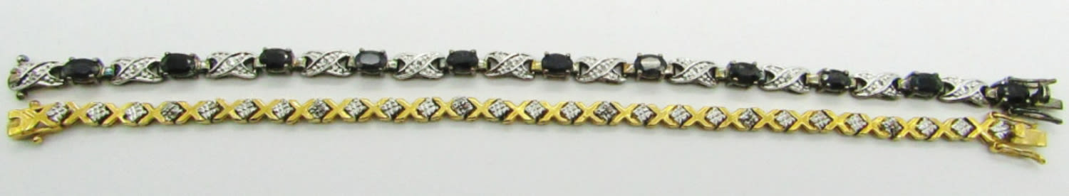 14.6 dwt. Both Marked “925”; Blue Topaz Tennis Bracelet 7.5″; X Tennis Bracelet 7.5″