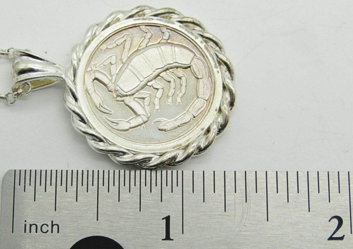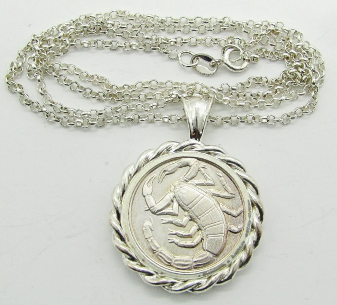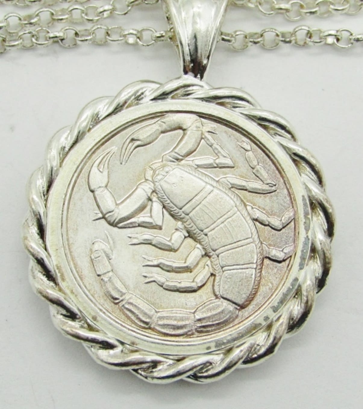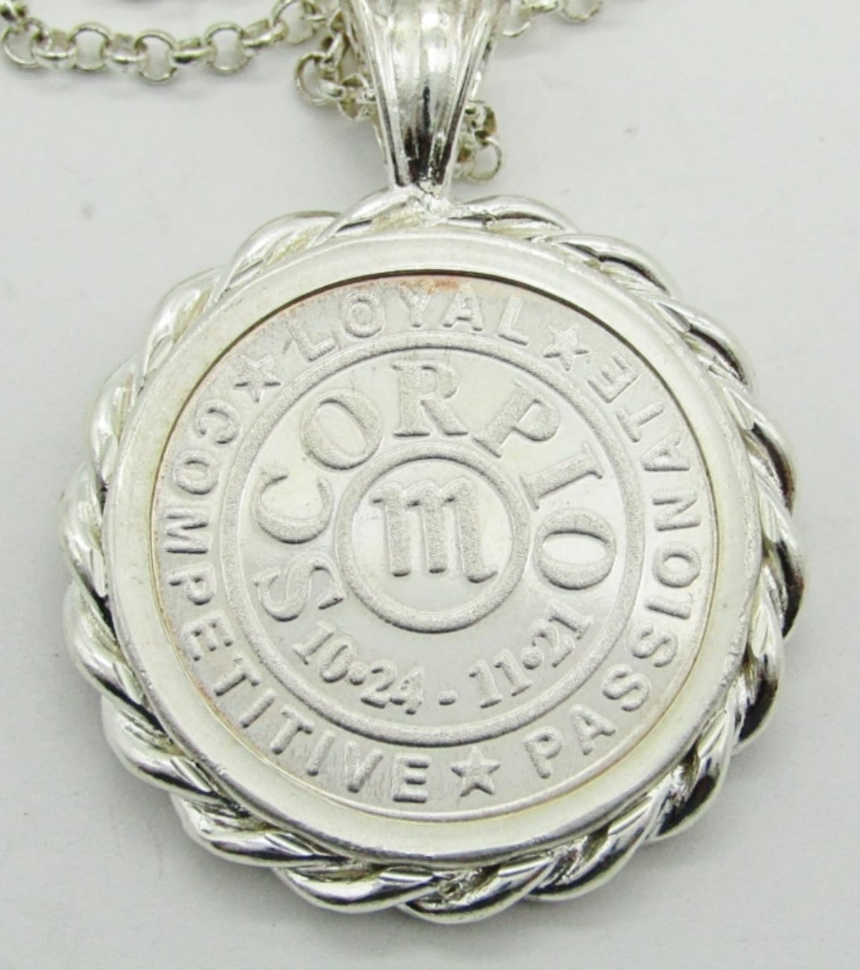 10 dwt. 22″ Chain Marked “925 Italy” with 1″ Round Pendant – Scorpio 10-24 – 11-21 “Loyal Passionate Competitive”.