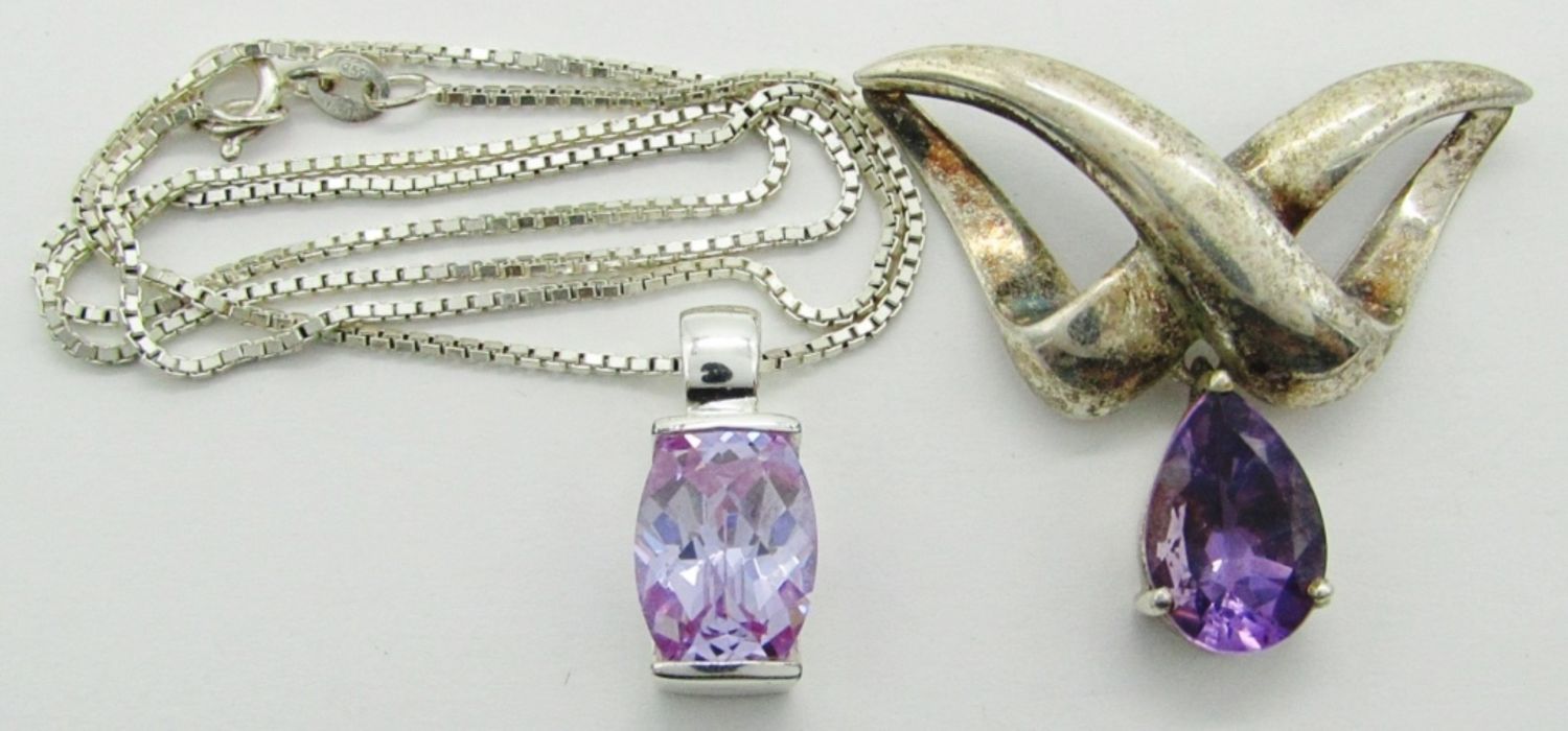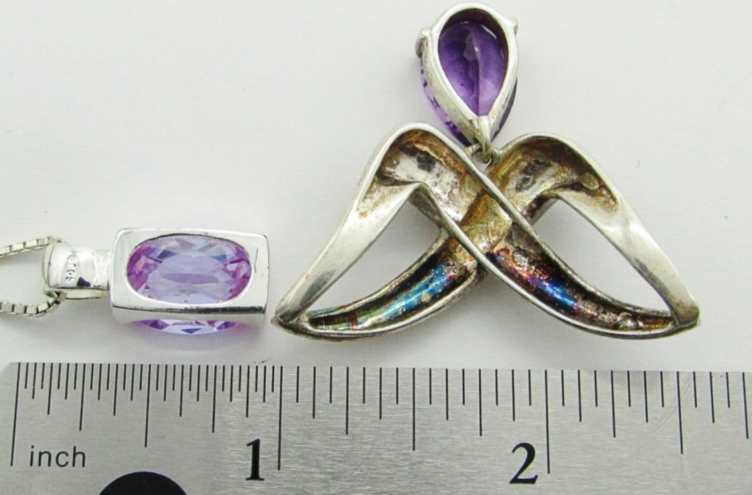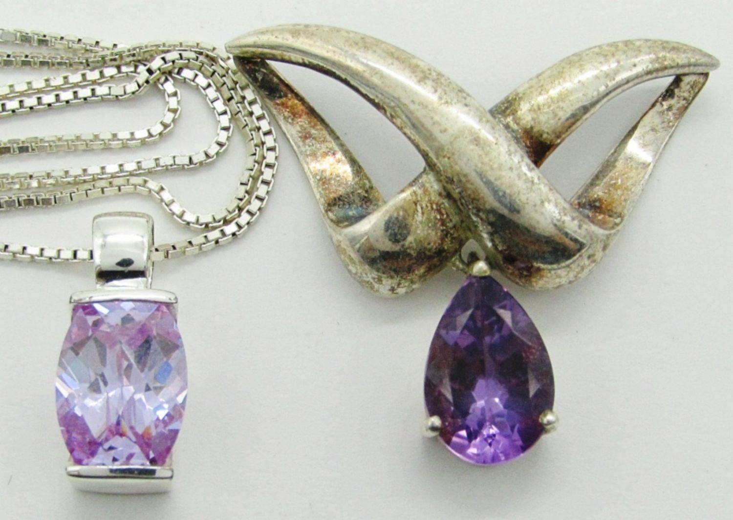 12 dwt. 18″ Necklace Chain Marked 925 Italy; S925 Amethyst Rectangular Pendant 5/8″; 925 Tear Drop Amethyst Dark Tone Pendant 1.5″