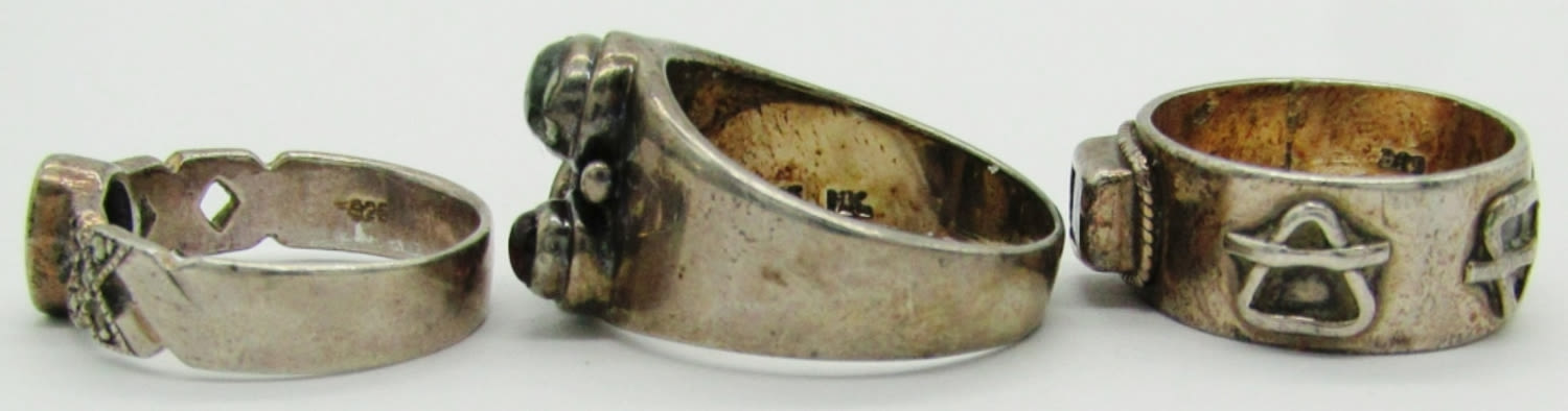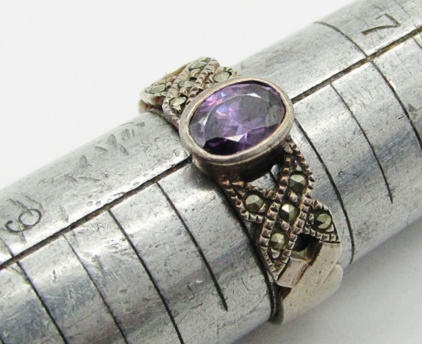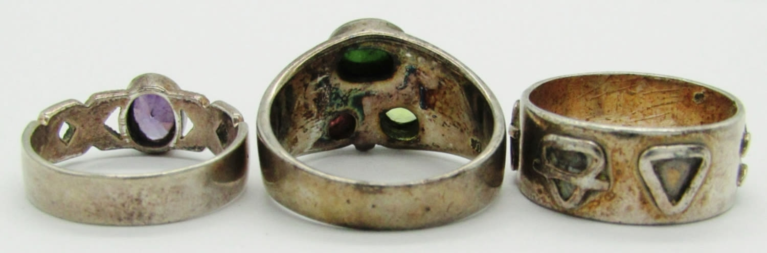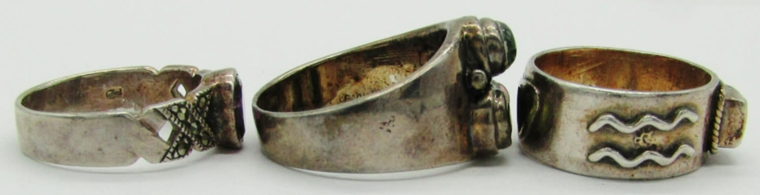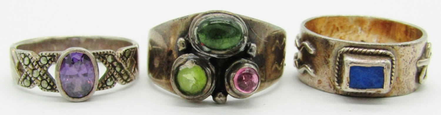 12.7 dwt. 925 MK Multi Color Round Multi-Gemstone Band Ring Size 10; Vintage Sterling Silver 925 Blue Lapis Ring Size 8; 925 CW Sterling Silver Marcasite & Amethyst Ring Size 8.