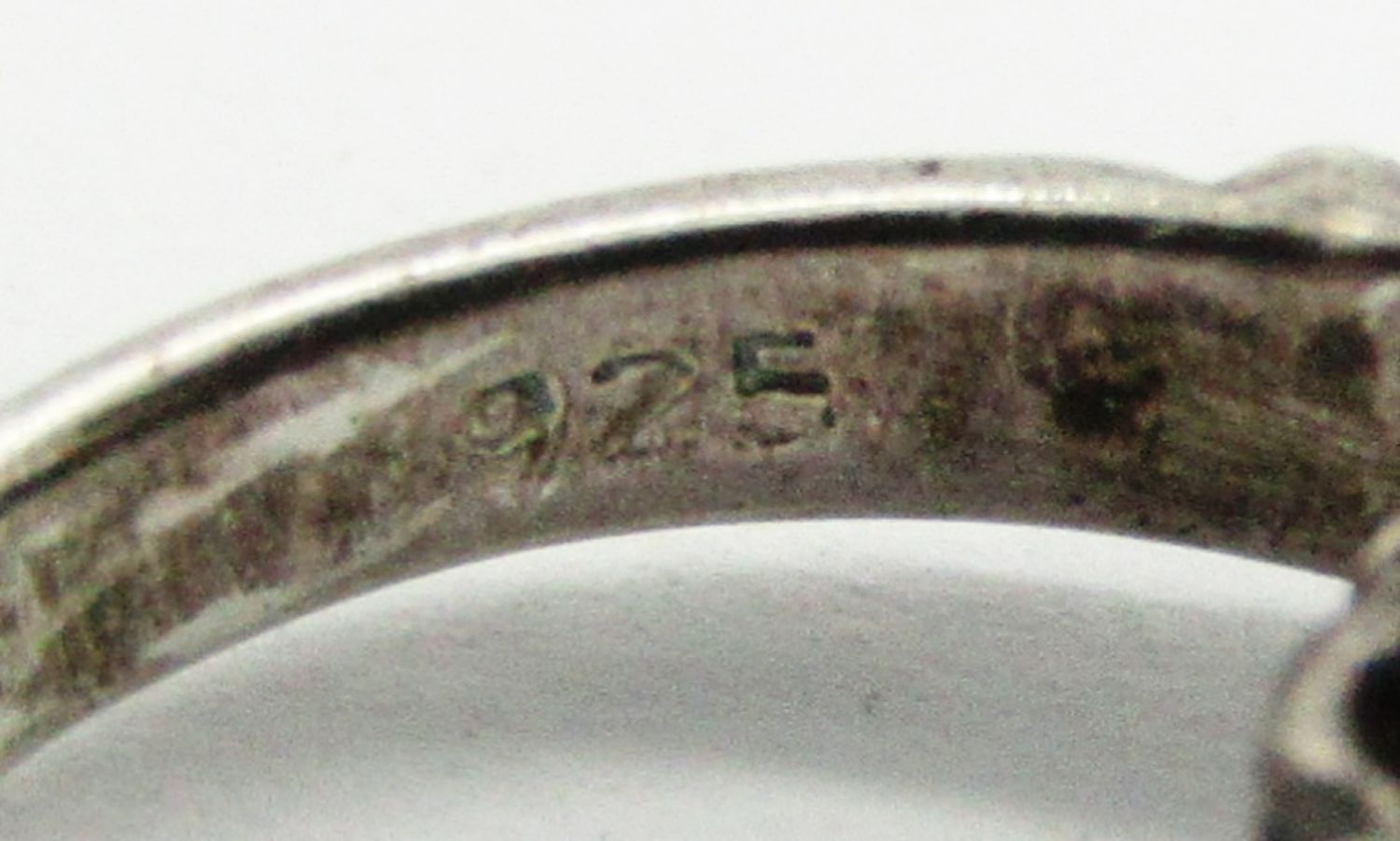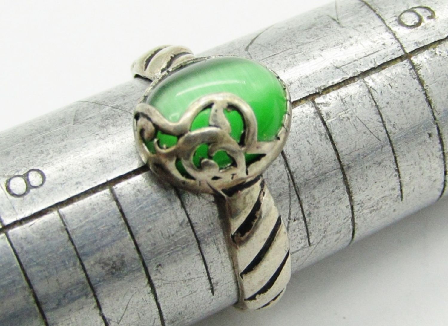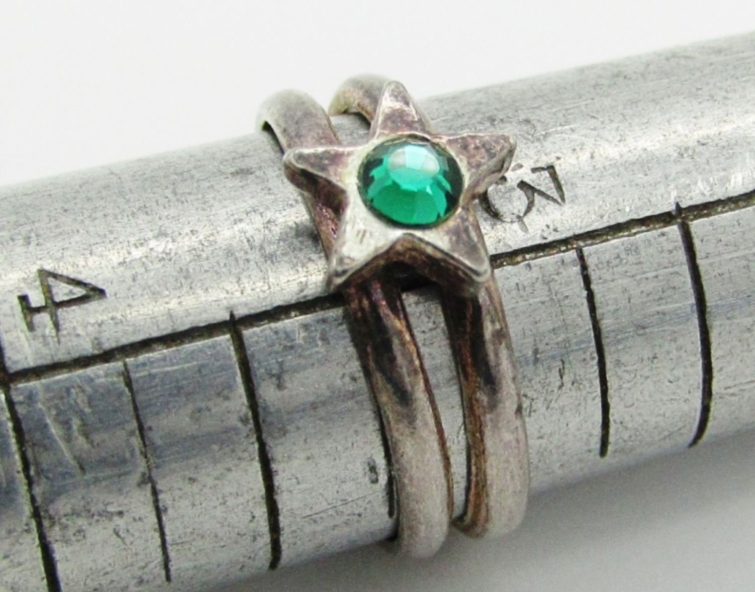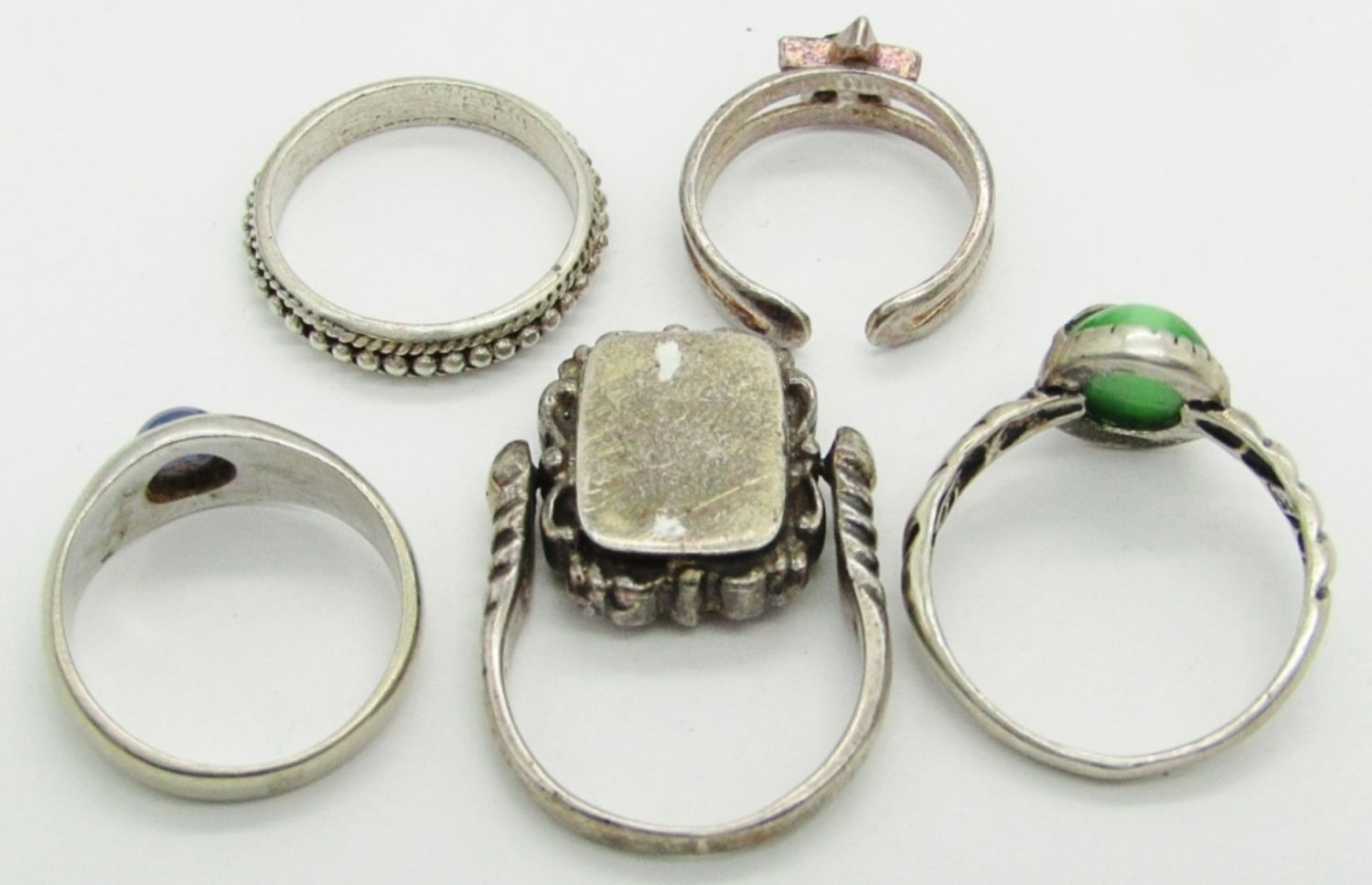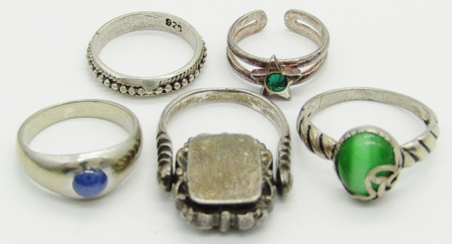 10.5 dwt. Size 3 Star With Green Gem Marked 925, Size 4.5 Lapis Lazuli, Size 4.5 Tiny Bead Band Marked 925, Size 5 Moving Fidget Ring Marked 925, Size 7 Green Cat Eye Marked 925.