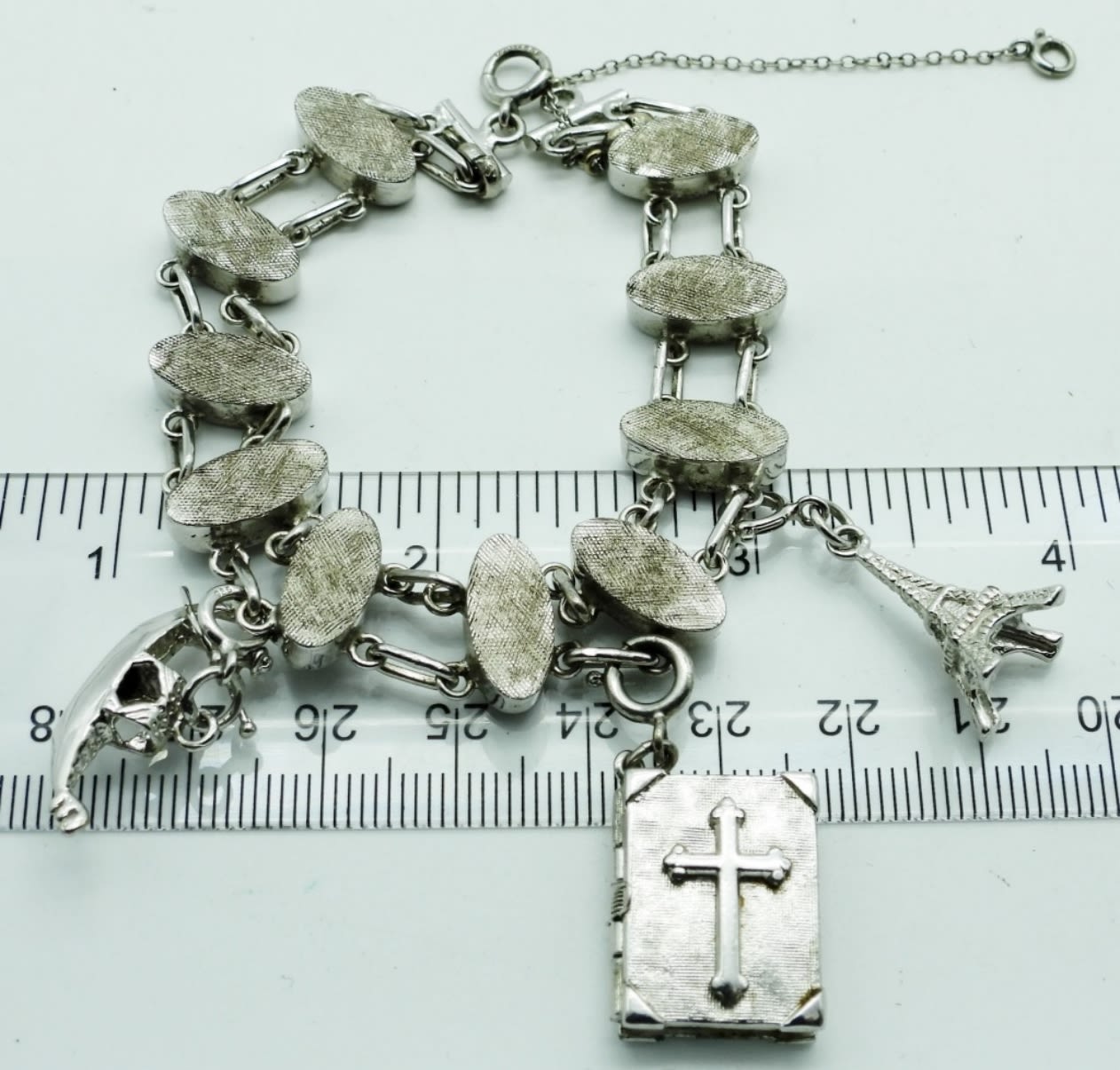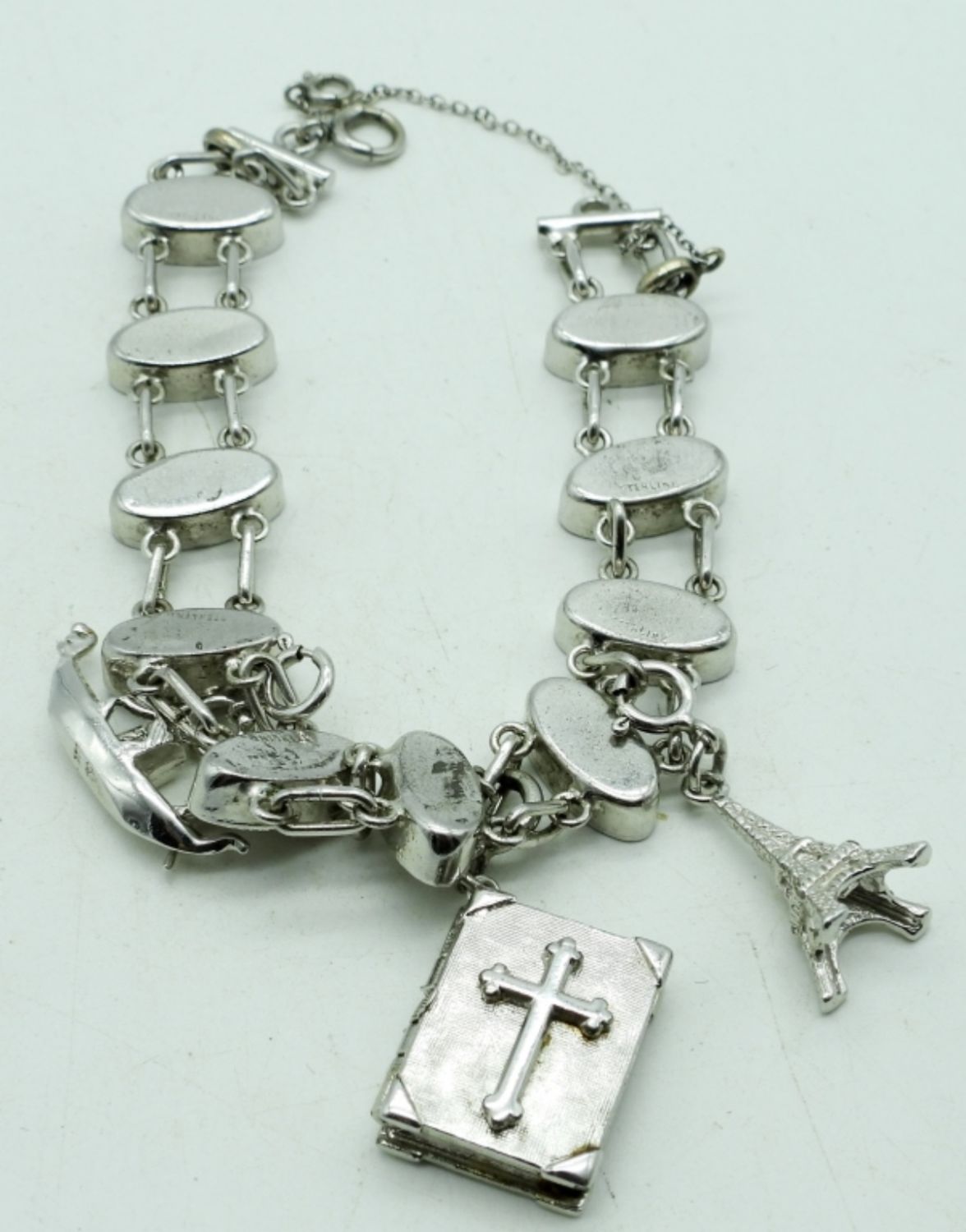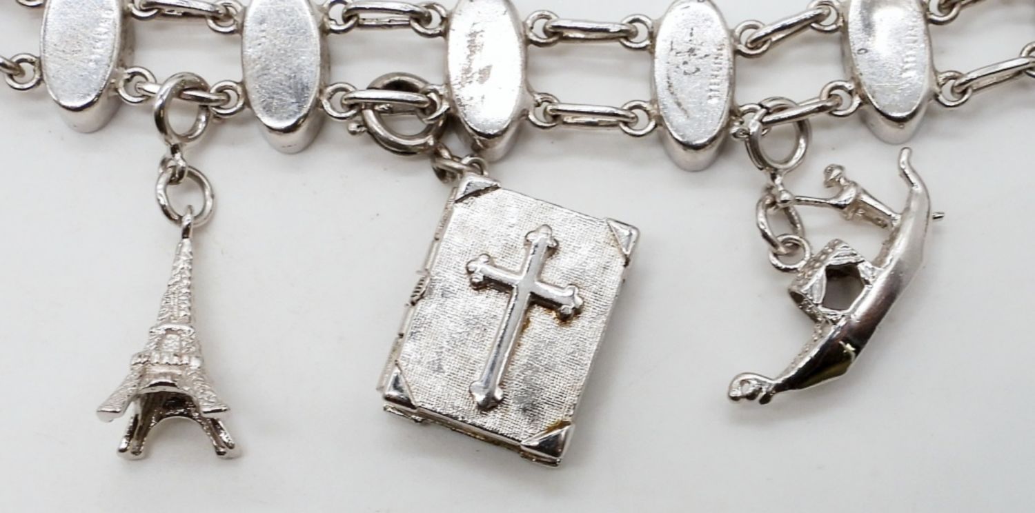 17DWT, 7 1/2IN LONG, SPRING CLASP, STAMPED STERLING, HAS THREE CHARMS EIFFEL TOWER, BIBLE, AND A GONDOLA,