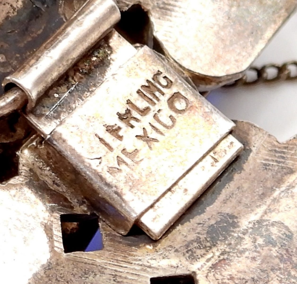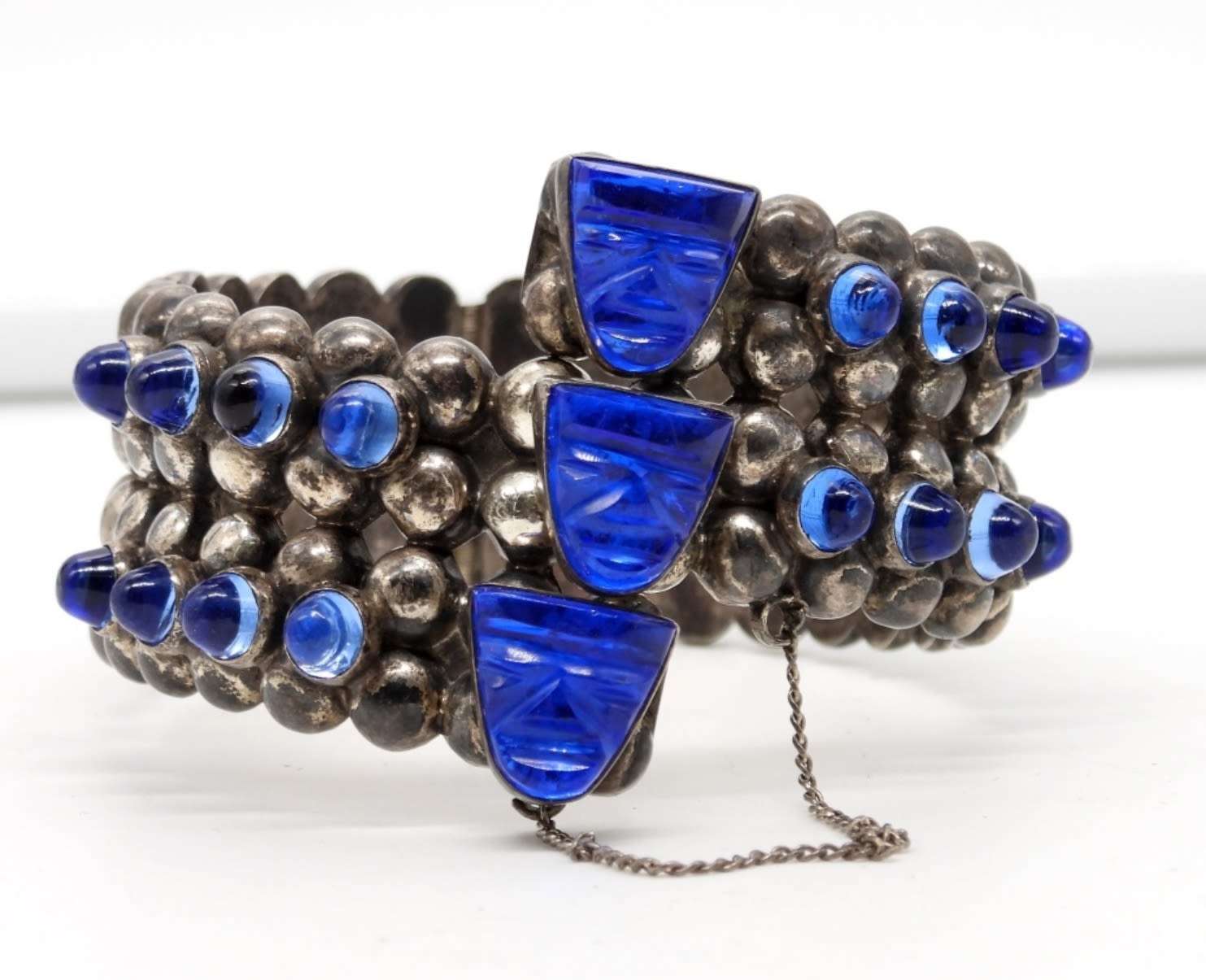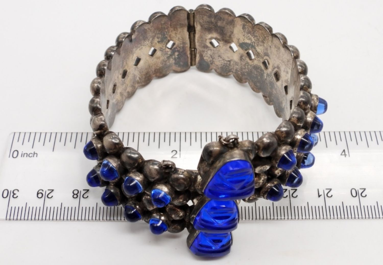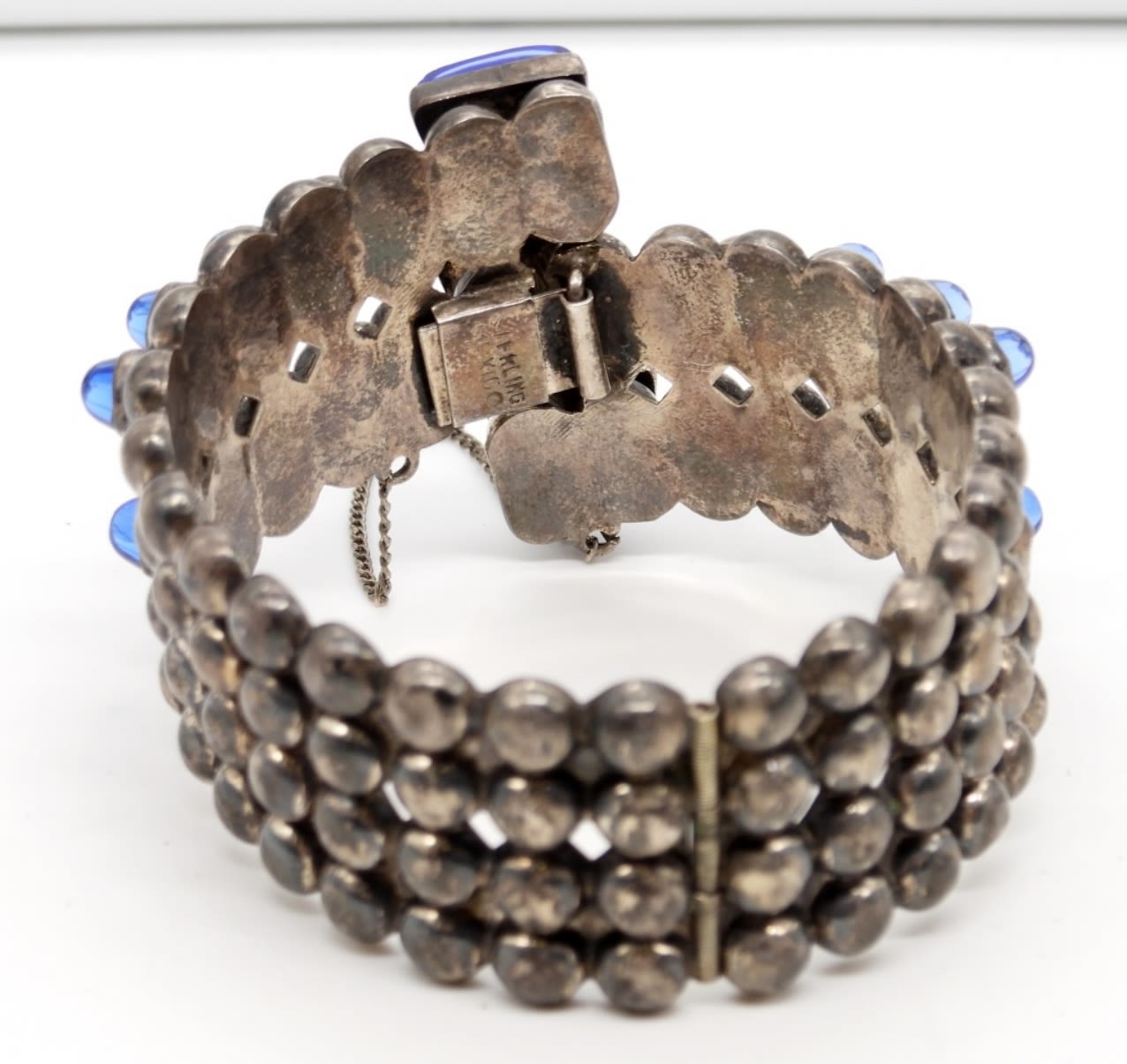 33DWT, 3IN WIDE, STERLING CIRCLES MAKE UP THIS BRACELET WITH BLUE STONES AROUND IT AND THREE CRAVED FACES, OPEN BOX CLASP IN THE MIDDLE OF THE BRACELET, HAS A GUARD CHAIN, STAMPED STERLING MEXICO