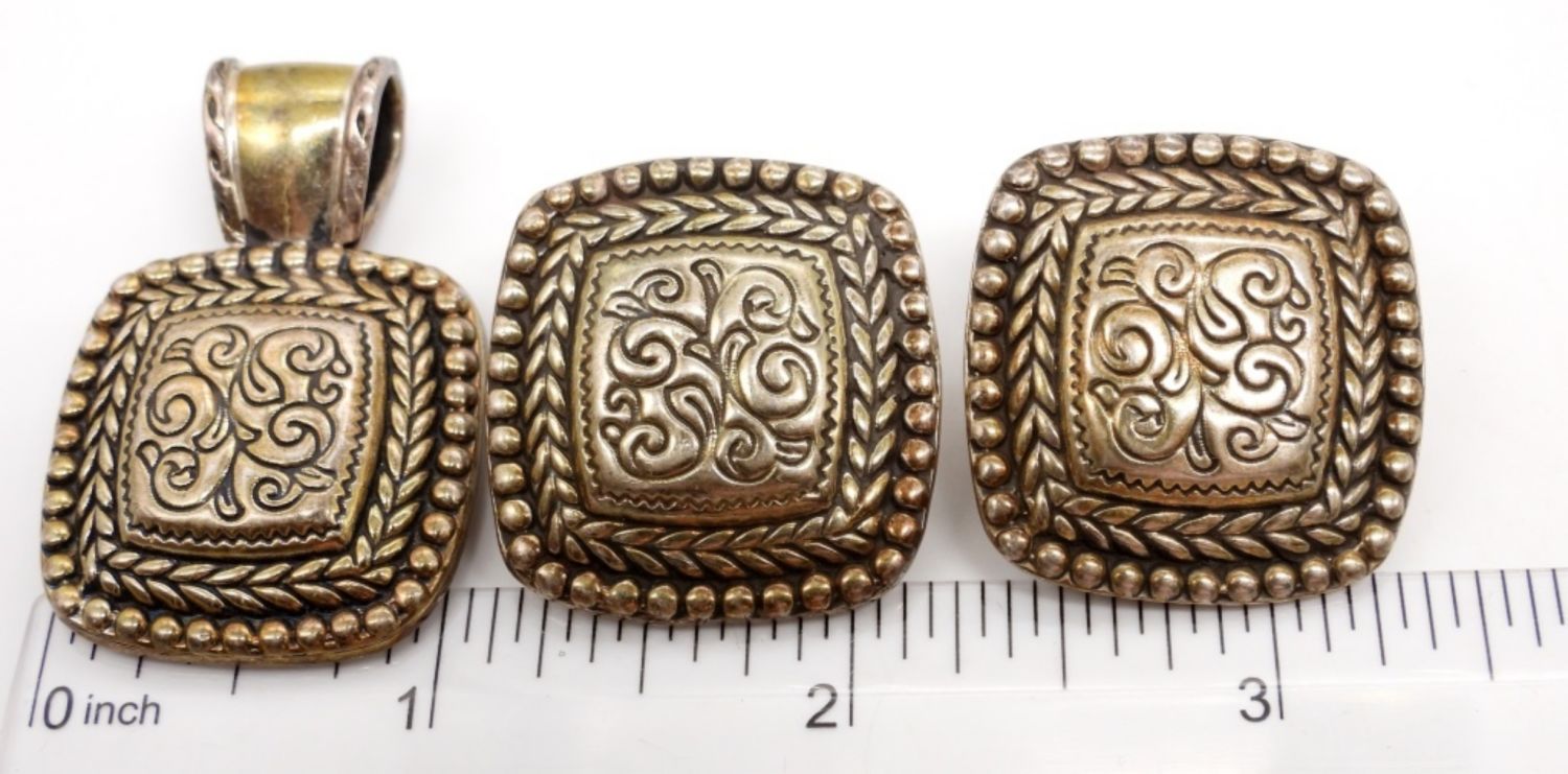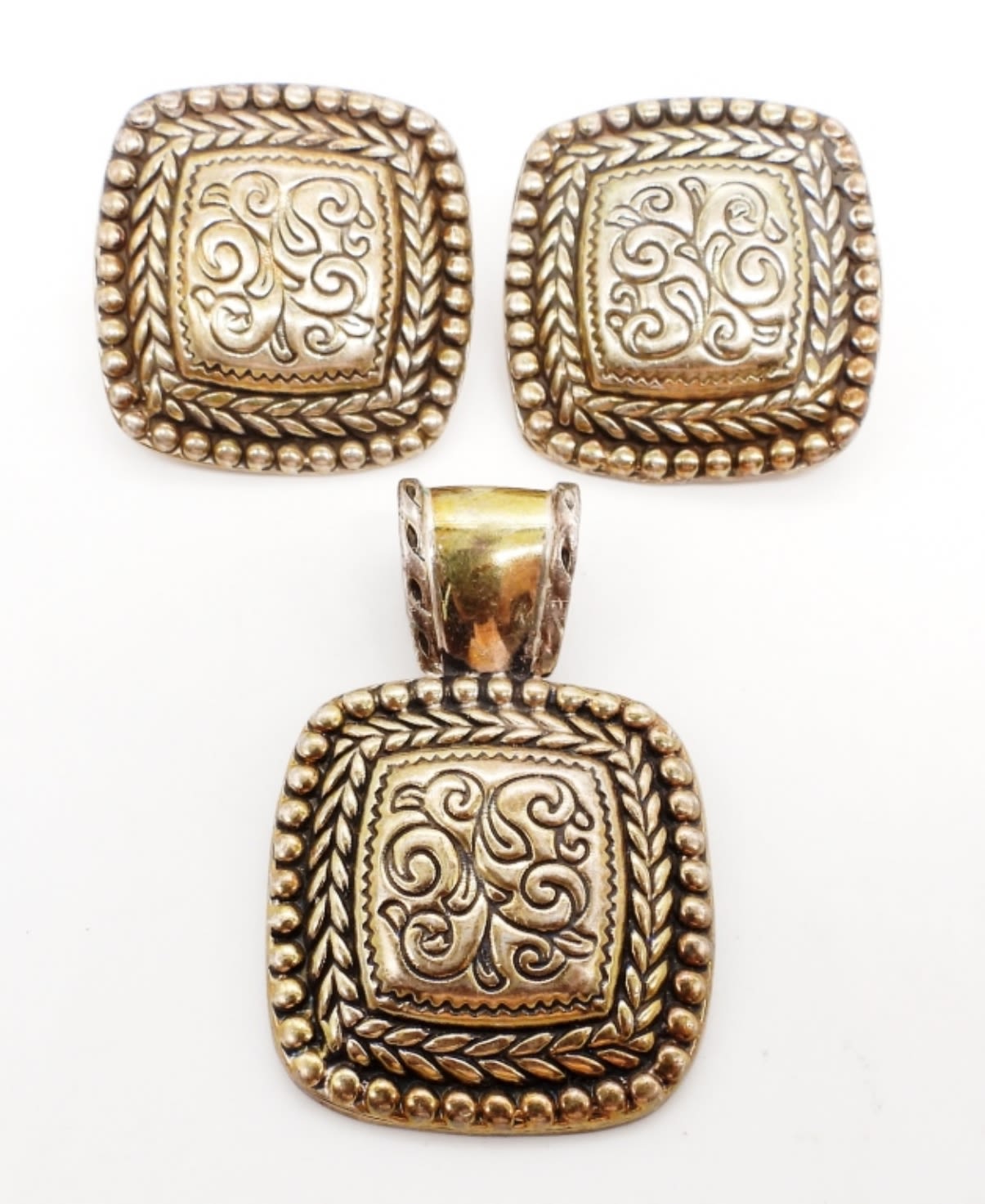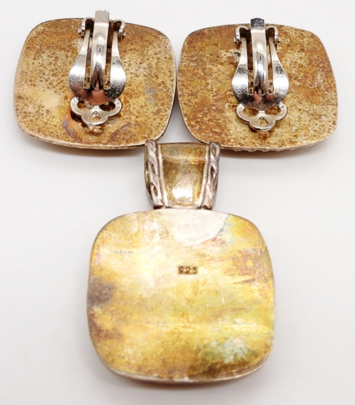 23DWT, ETCHED DESIGN ON THE SET, PENDANT 2IN LONG, STAMPED 925, CLIP ON EARRINGS ALSO STAMPED