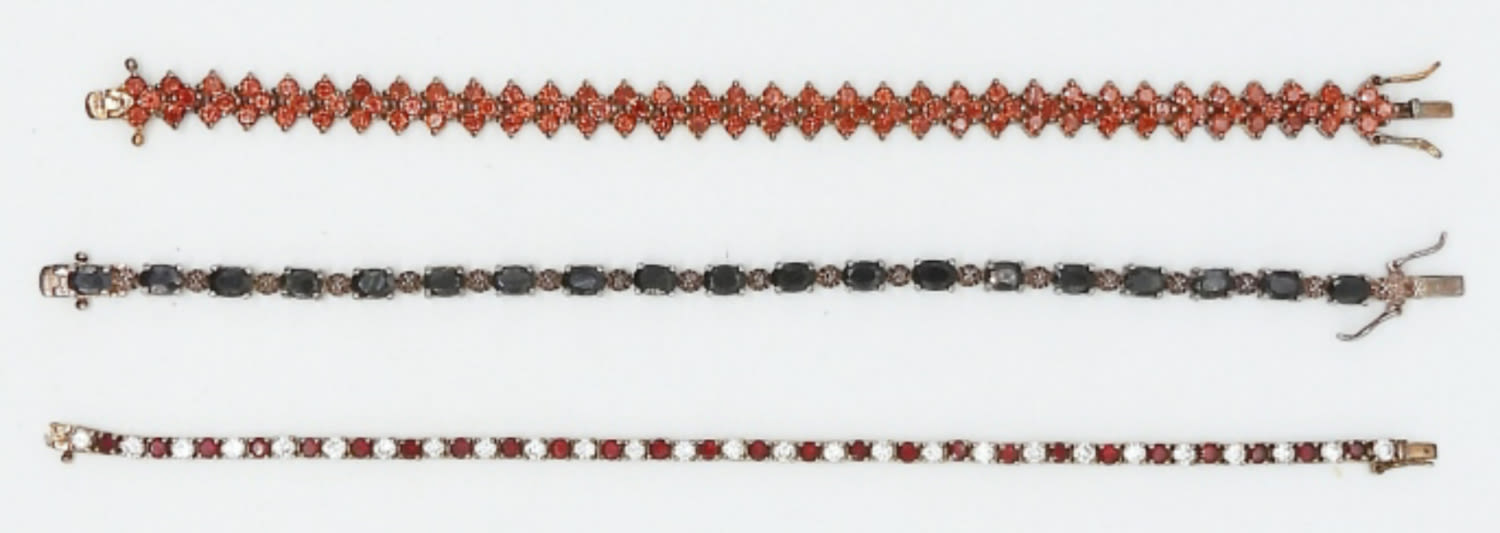 28.7DWT, BETWEEN 7 1/2 AND 8 IN LONG, ALL STAMPED WITH 925 ON THE BACK OF THE OPEN BOX CLASP, ORANGE, BLACK ONYX AND GARNET AND CLEAR STONES