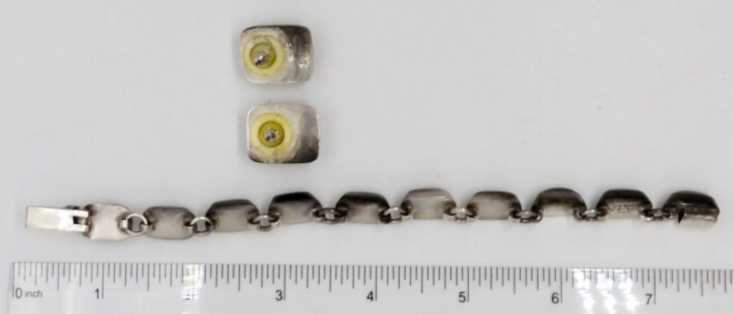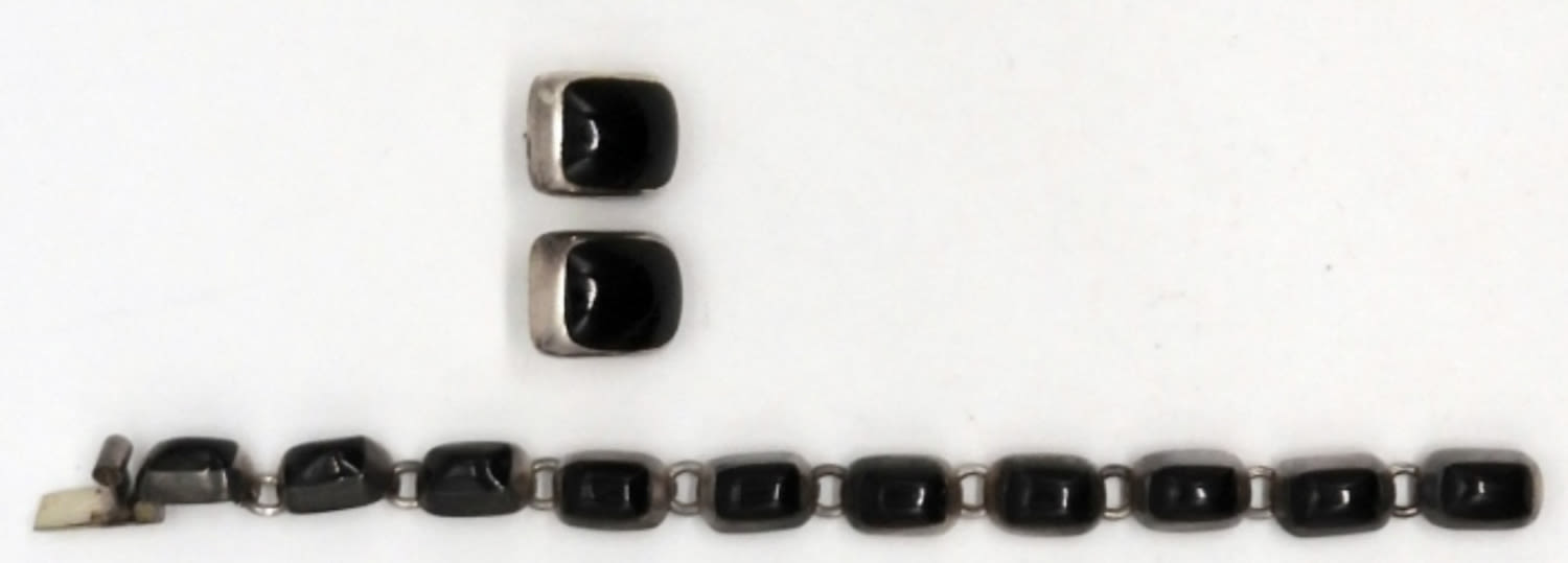 32.6DWT, 7 1/2IN LONG, BLACK ONYX INLAY, OPEN BOX CLASP, STAMPED TM-28 MEXICO 925, PIERCED MATCHING STUD EARRINGS, STAMPED TM-245 MEXICO 925