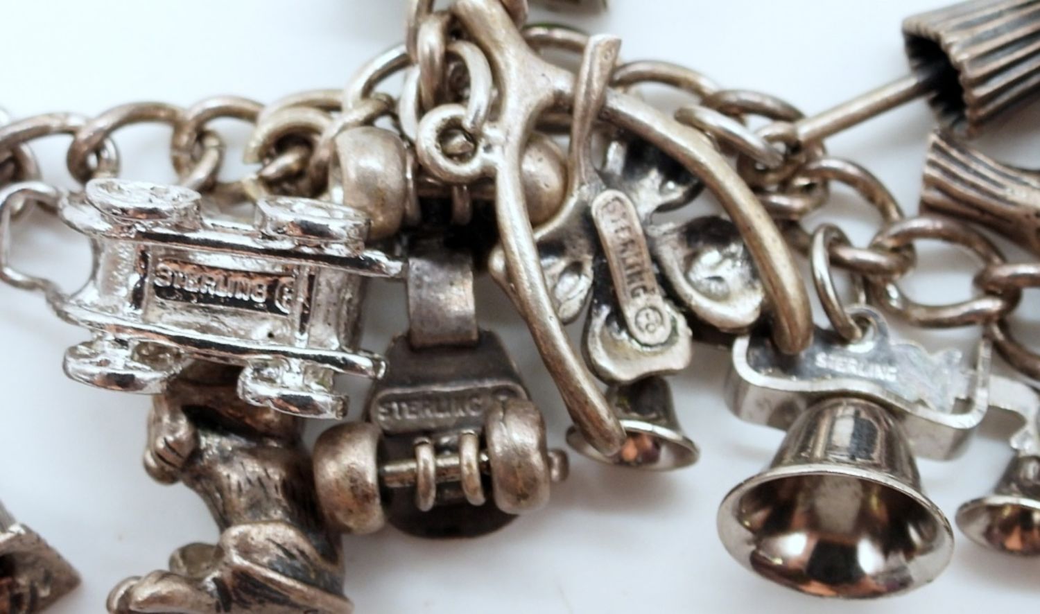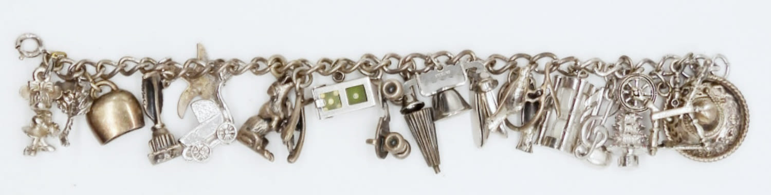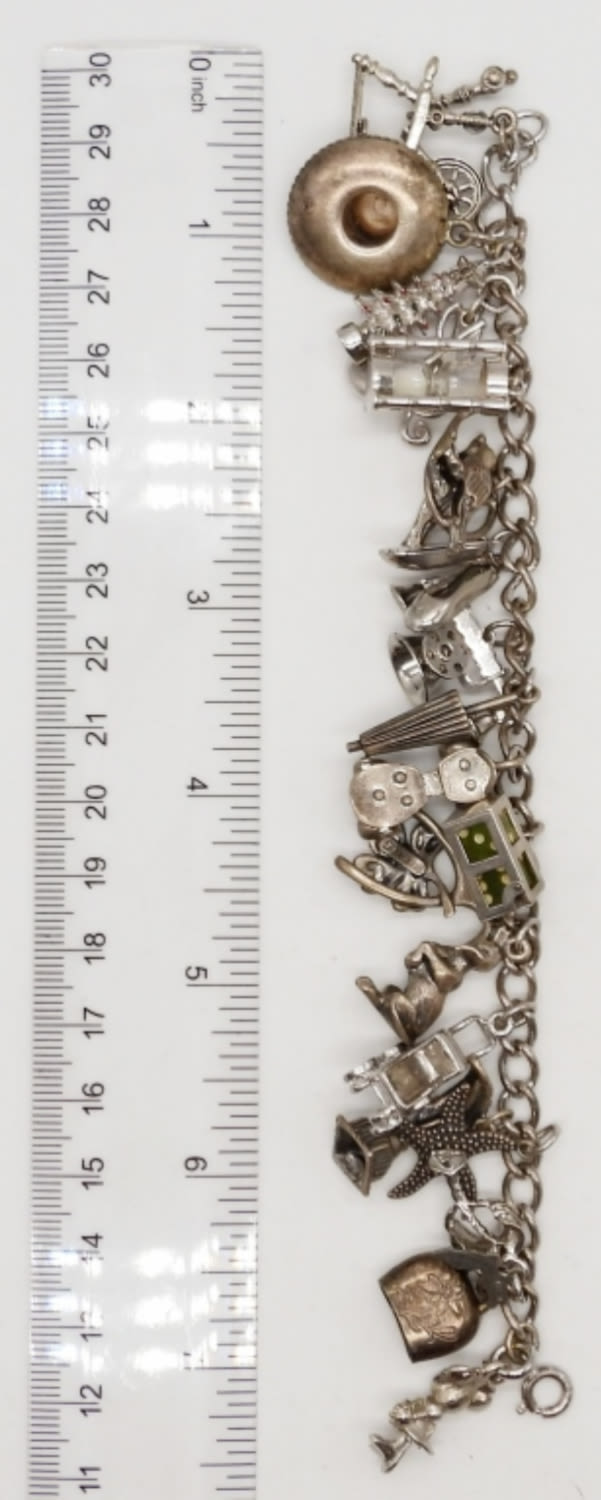41DWT, 19 CHARMS ON THIS BRACELET, THEY ARE STAMPED STERLING, SPRING CLASP ALSO STAMPED STERLING