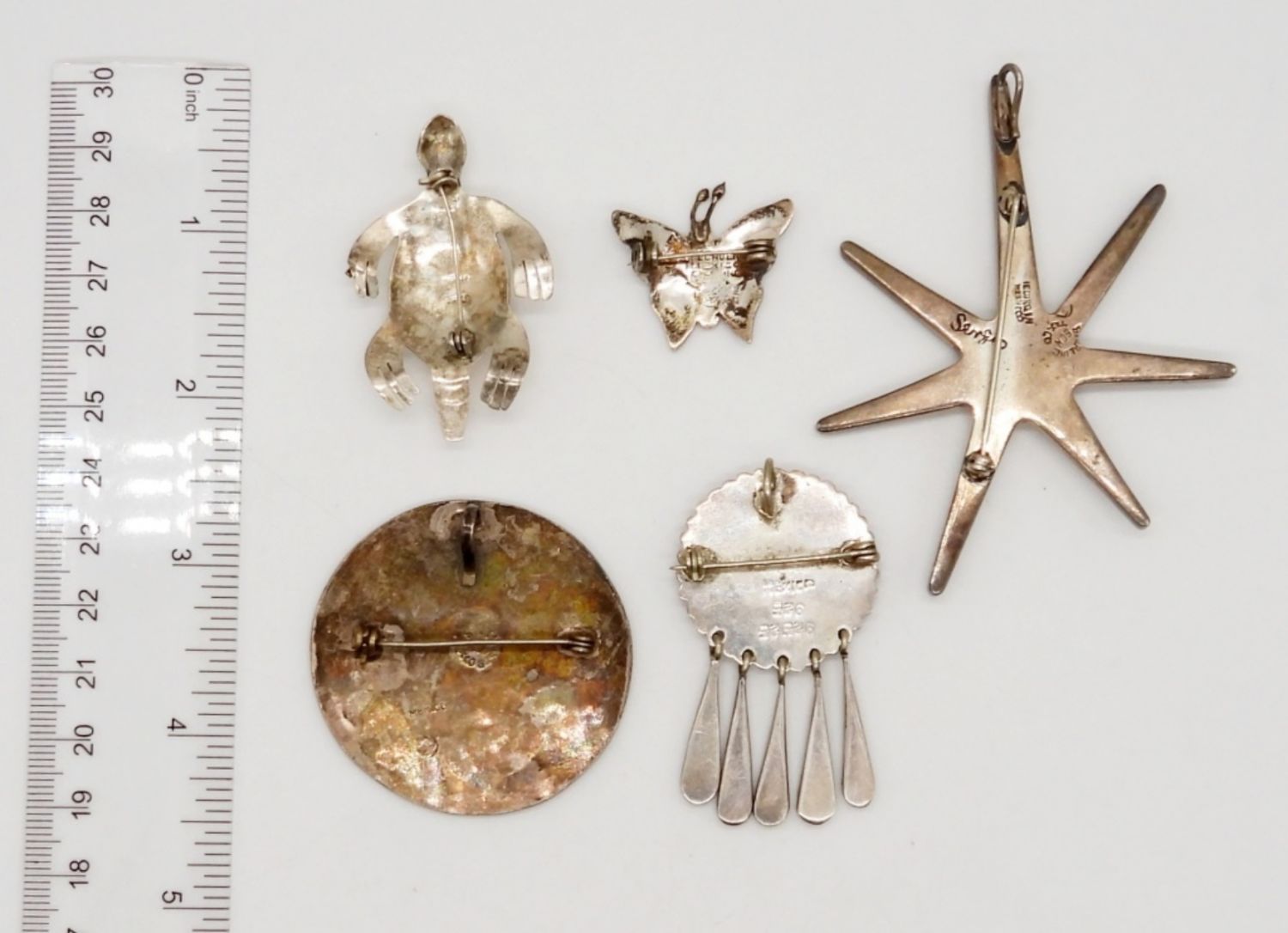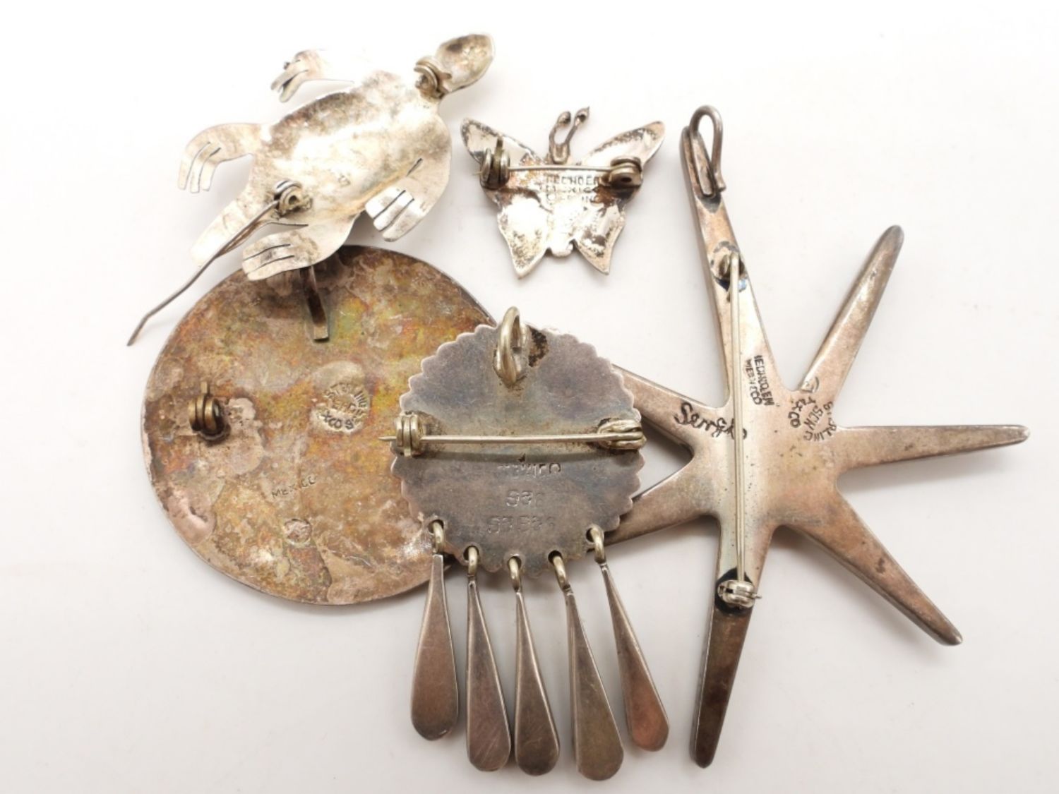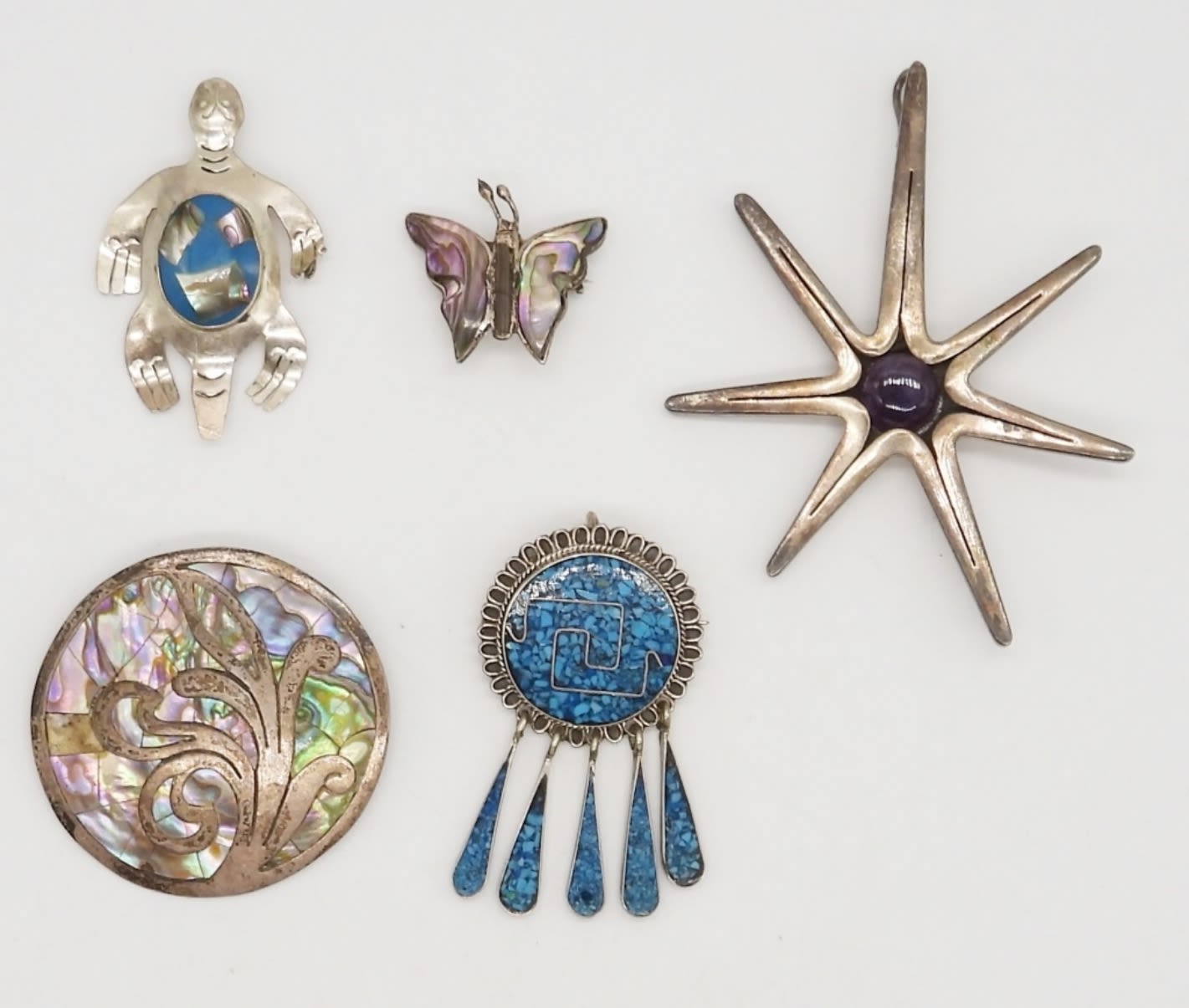 29DWT, BETWEEN 1-3IN LONG, STAR WITH A PURPLE AMETHYST IN THE MIDDLE STAMPED BY SERGIO, ABALONE BUTTERFLY AND CIRCLE, A TURTLE WITH BLUE AND ABALONE INLAY, CRUSHED TURQUOISE INLAY