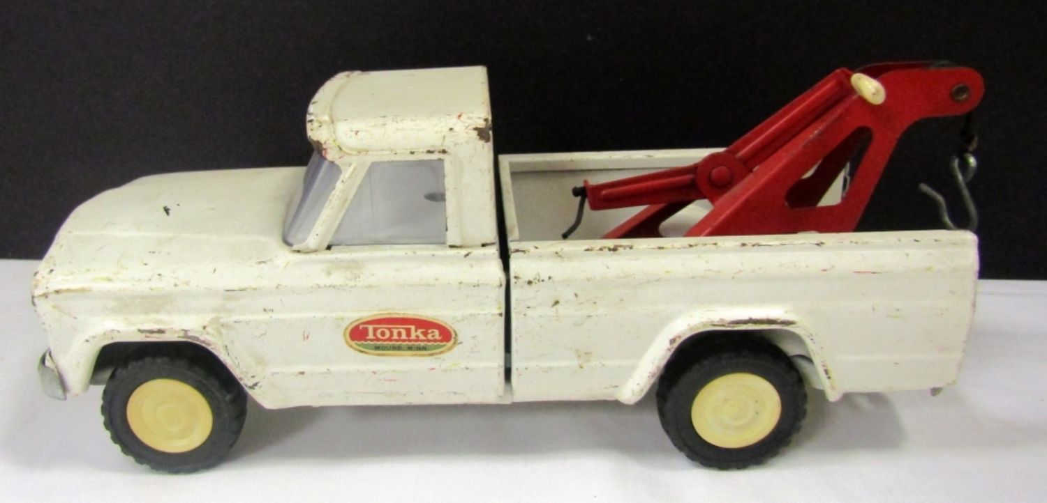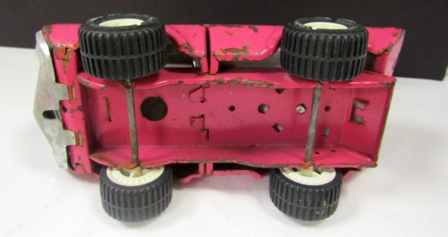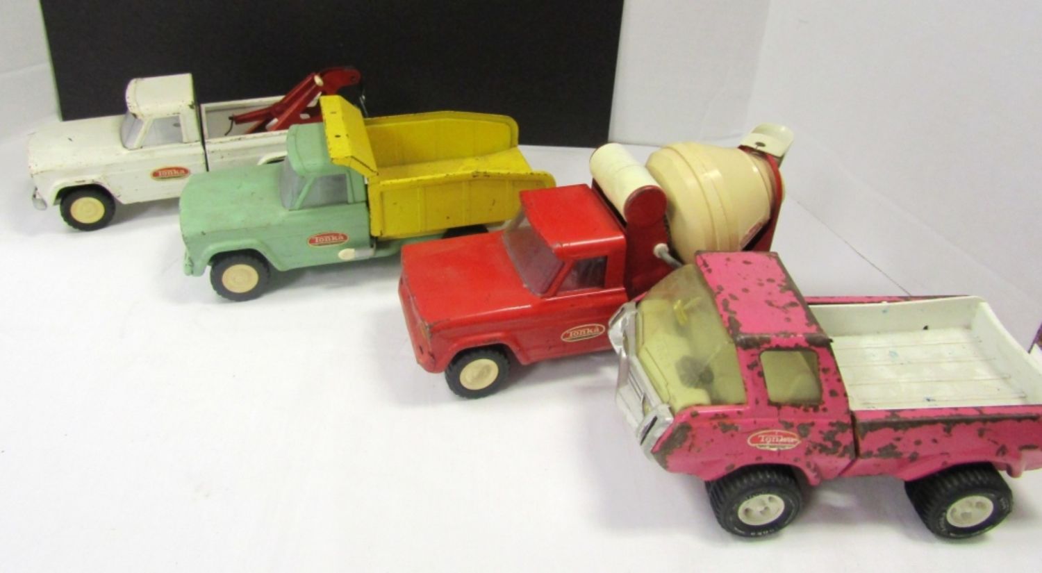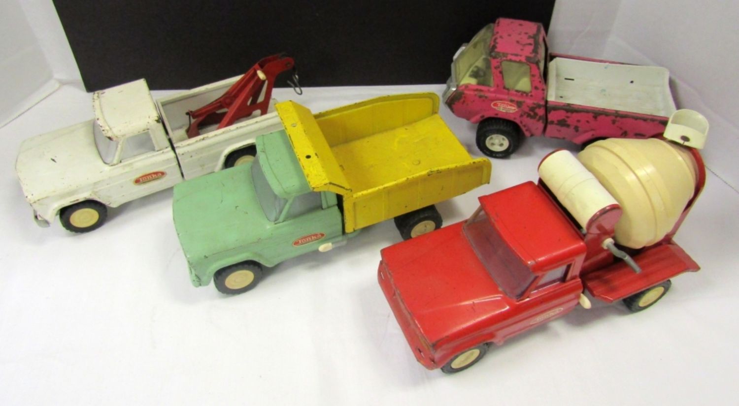 WHITE TOW TRUCK 9″ LONG, GREEN/YELLOW DUMP TRUCK 9 1/2″ LONG, RED CEMENT TRUCK 9″ LONG & PINK TRUCK lesser condition – REST NICE OVERALL