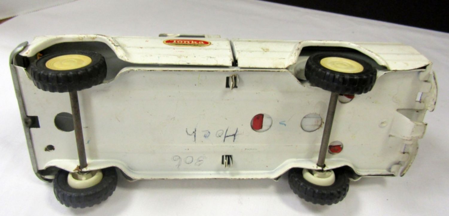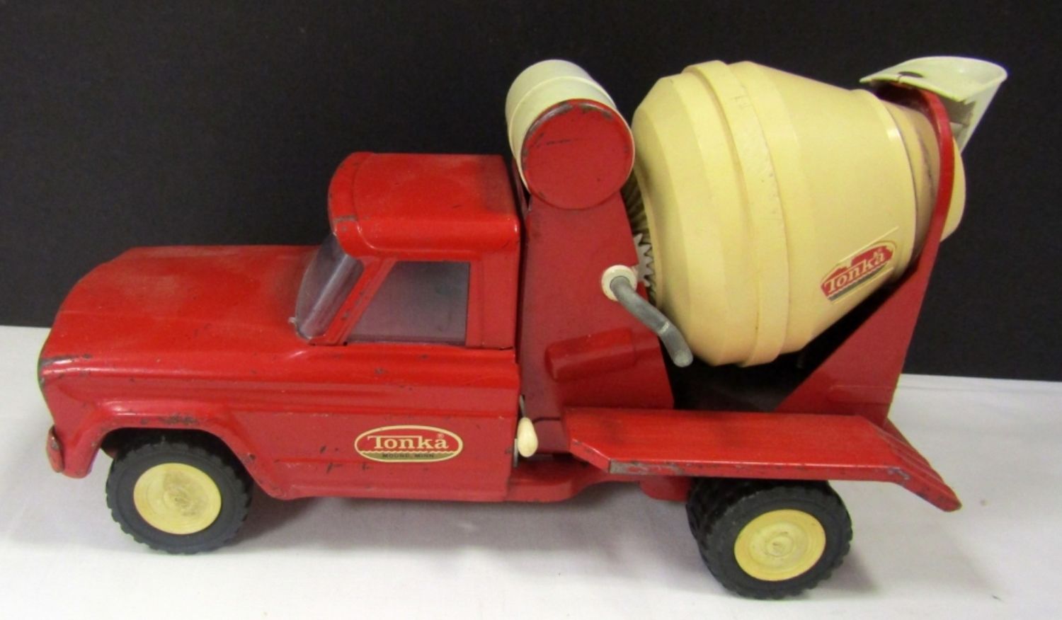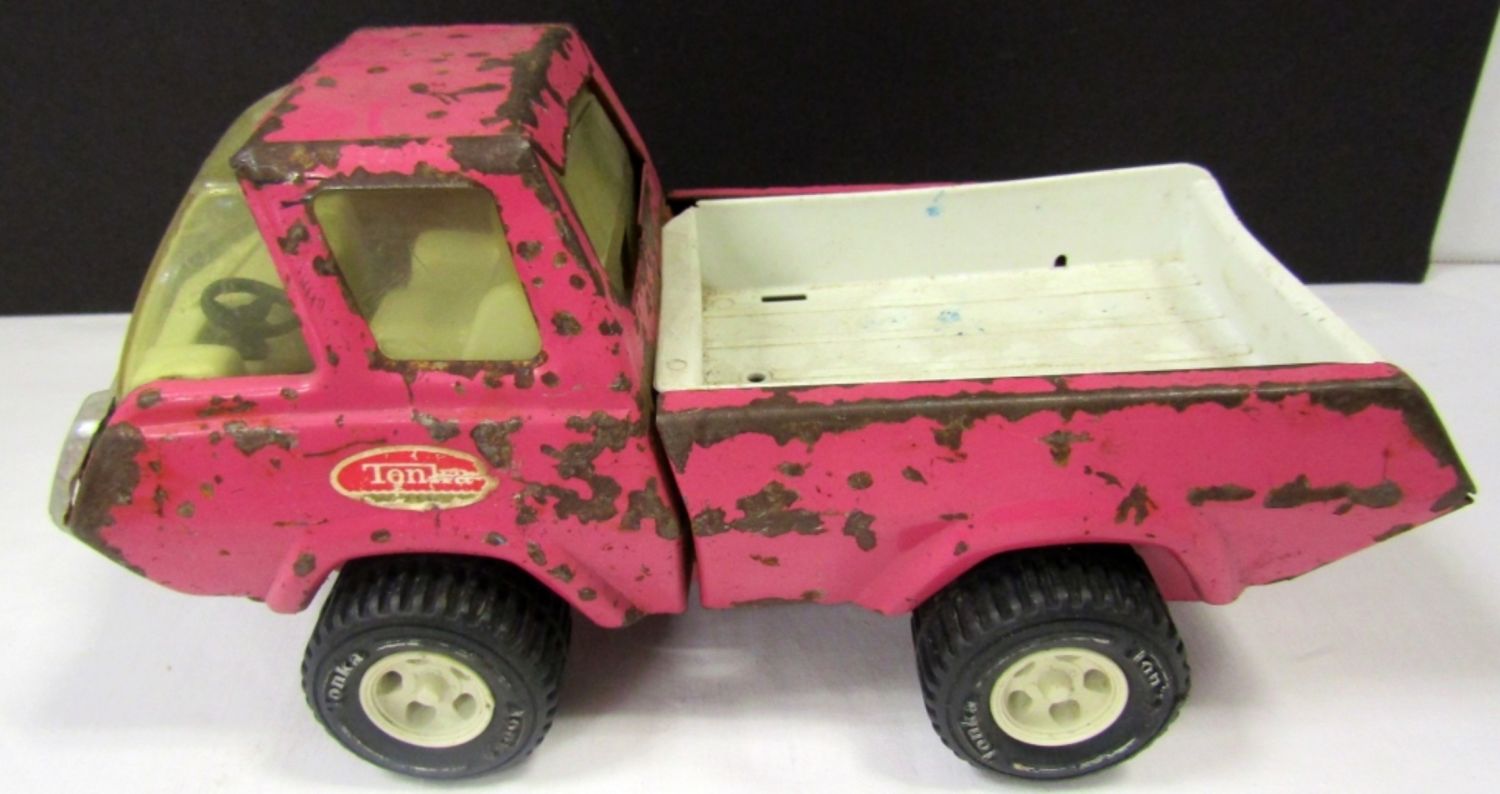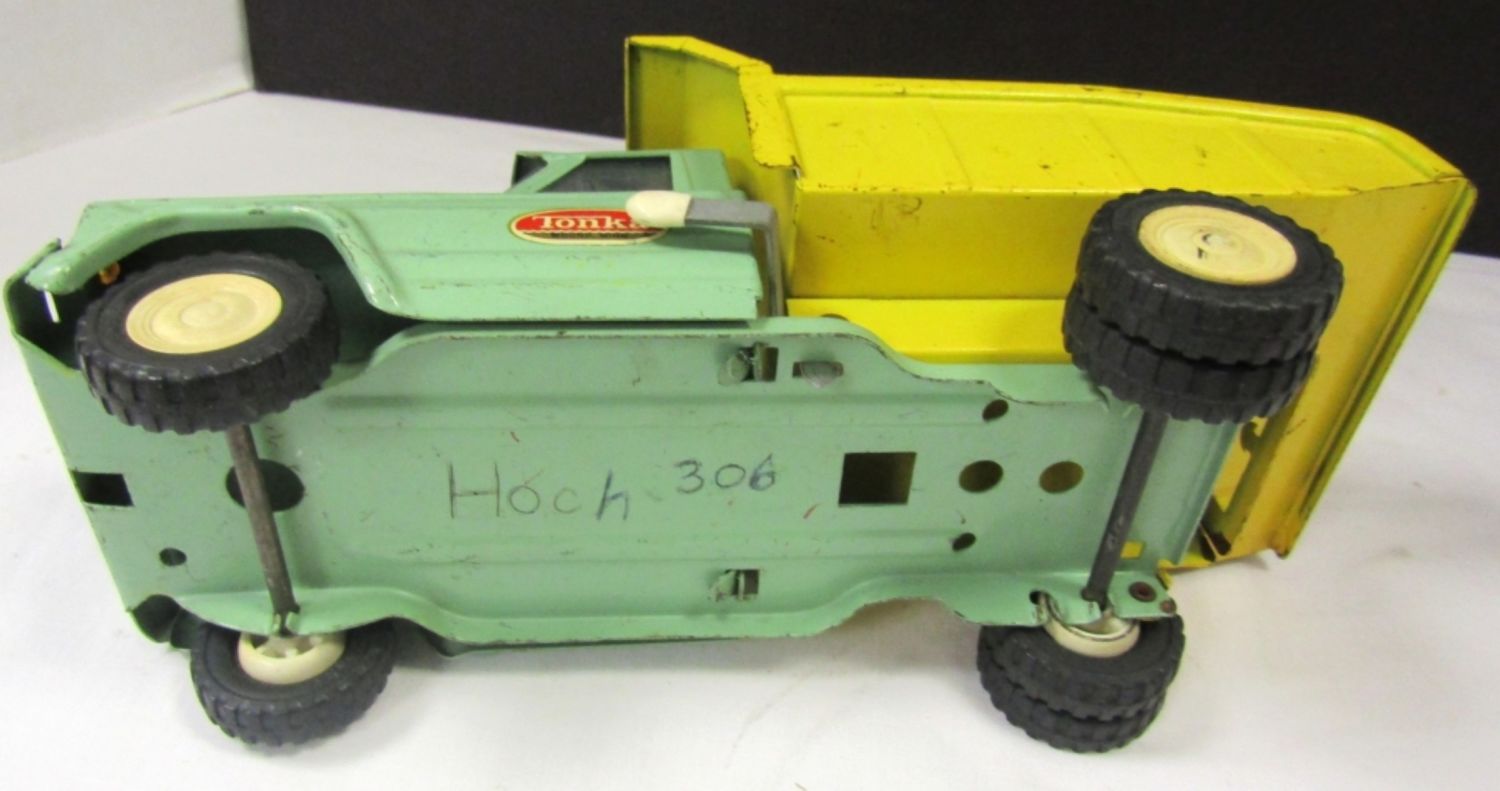 WHITE TOW TRUCK 9″ LONG, GREEN/YELLOW DUMP TRUCK 9 1/2″ LONG, RED CEMENT TRUCK 9″ LONG & PINK TRUCK lesser condition – REST NICE OVERALL