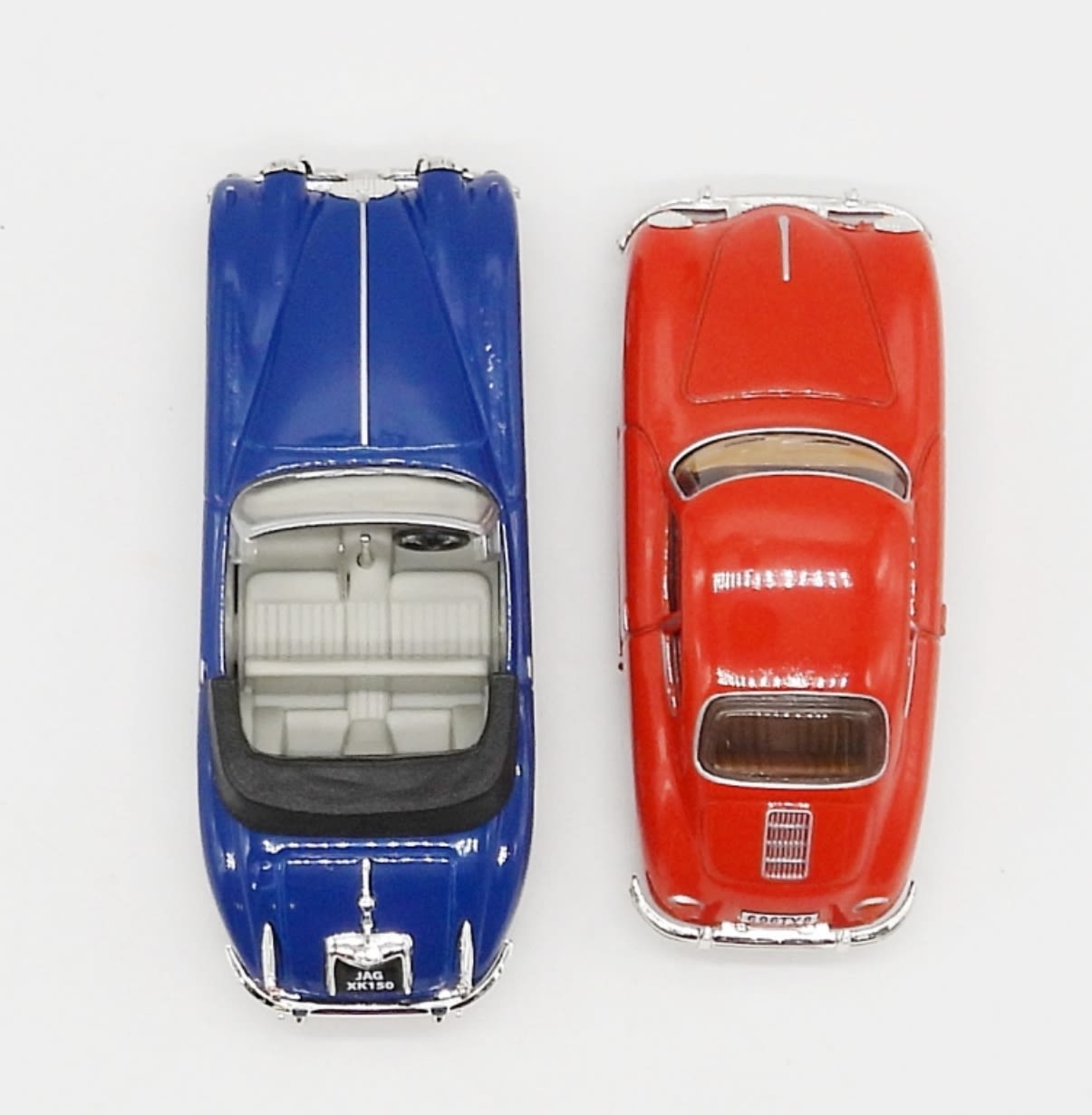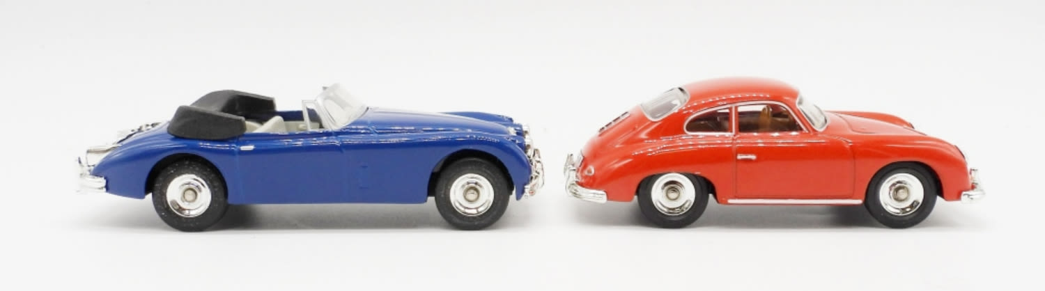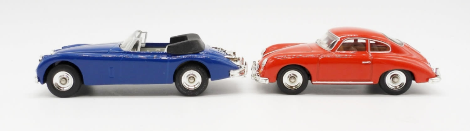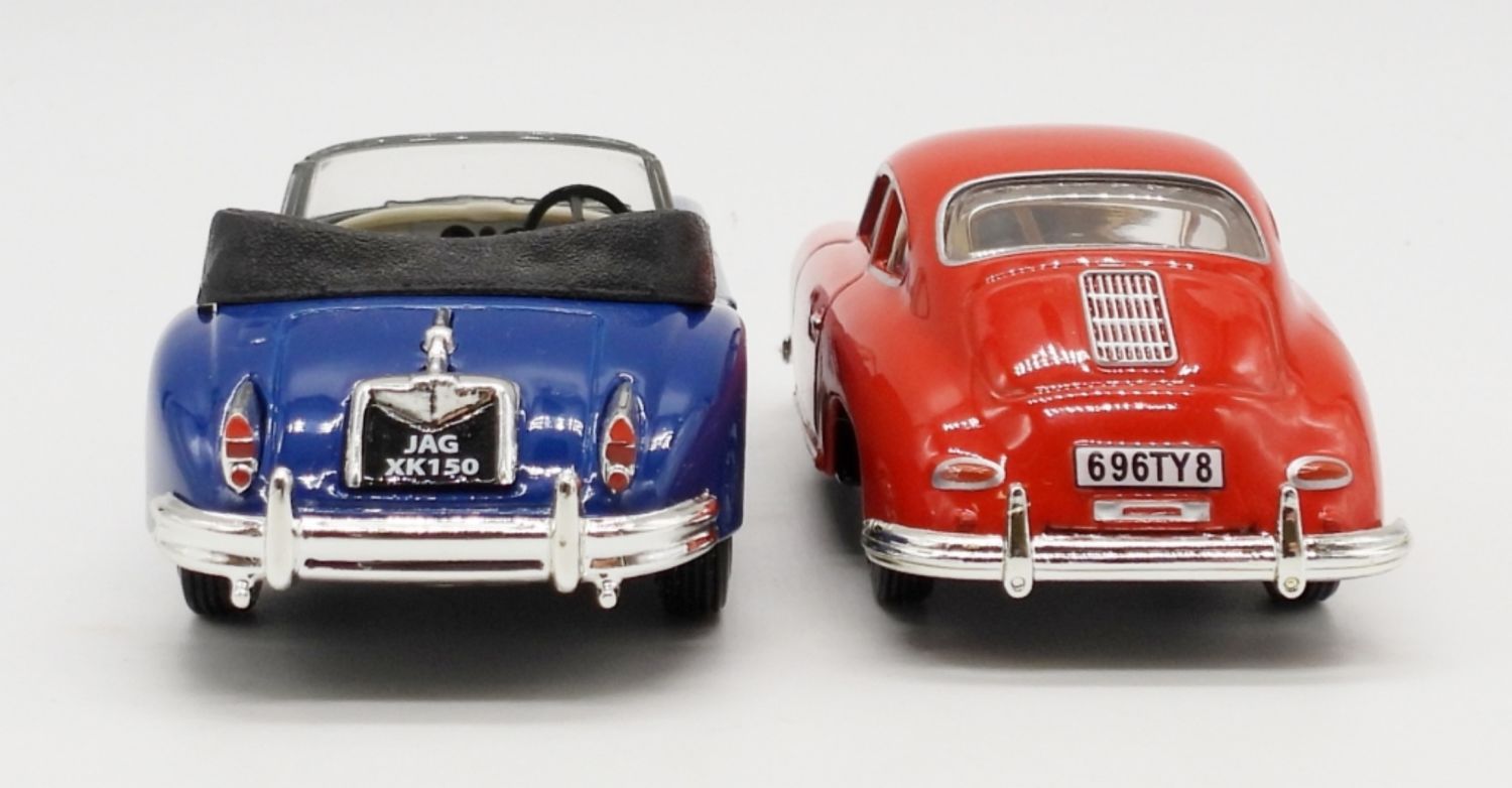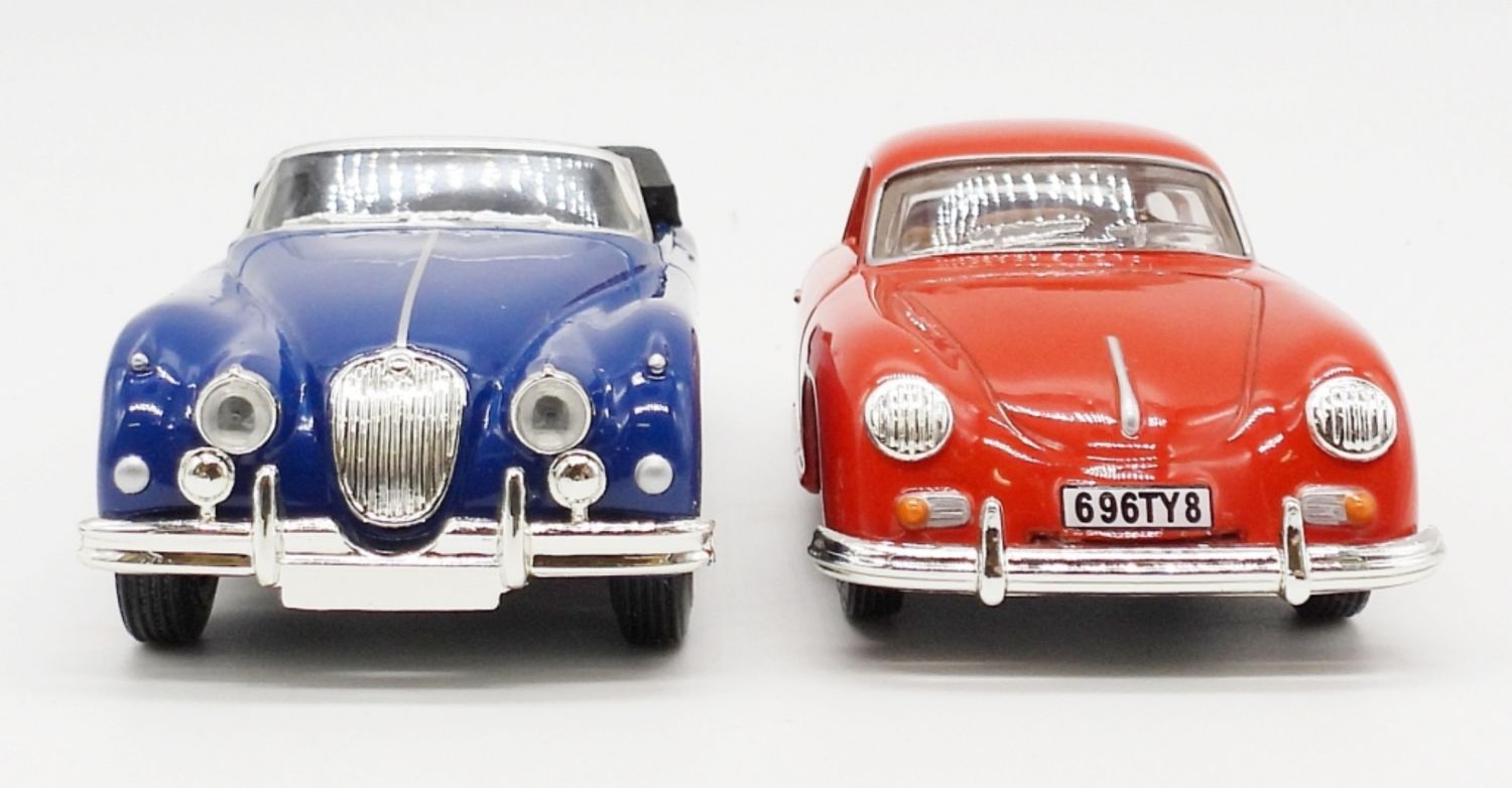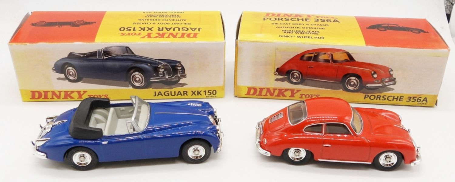 JAGUAR XK 150 1960 BLUE IN ORIGINAL BOX, MATTEL MADE IN CHINA 1995; PORSCHE 356A COUPE 1958 RED IN ORIGINAL BOX, MATTEL MADE IN CHINA 1991
