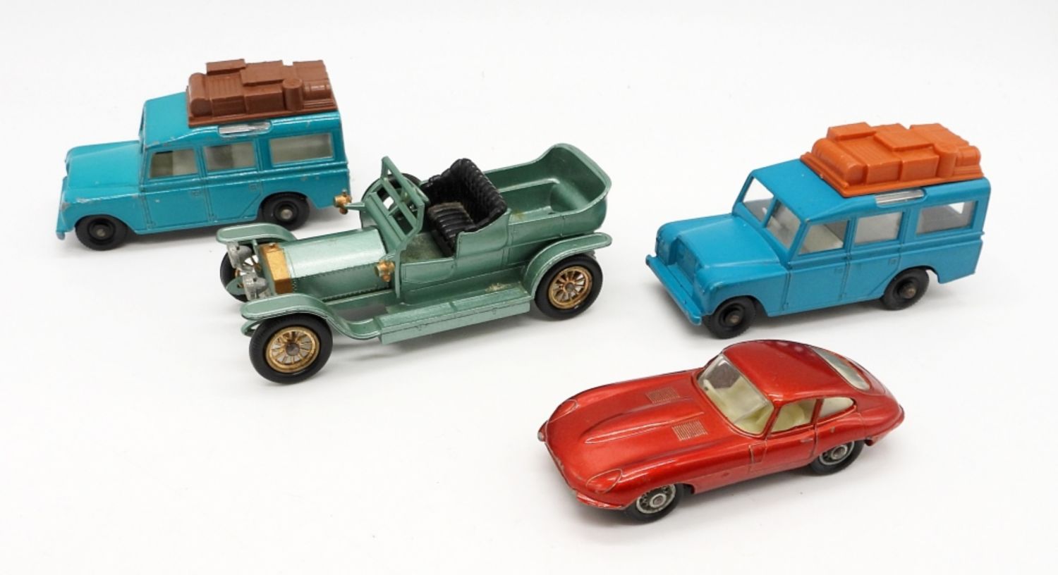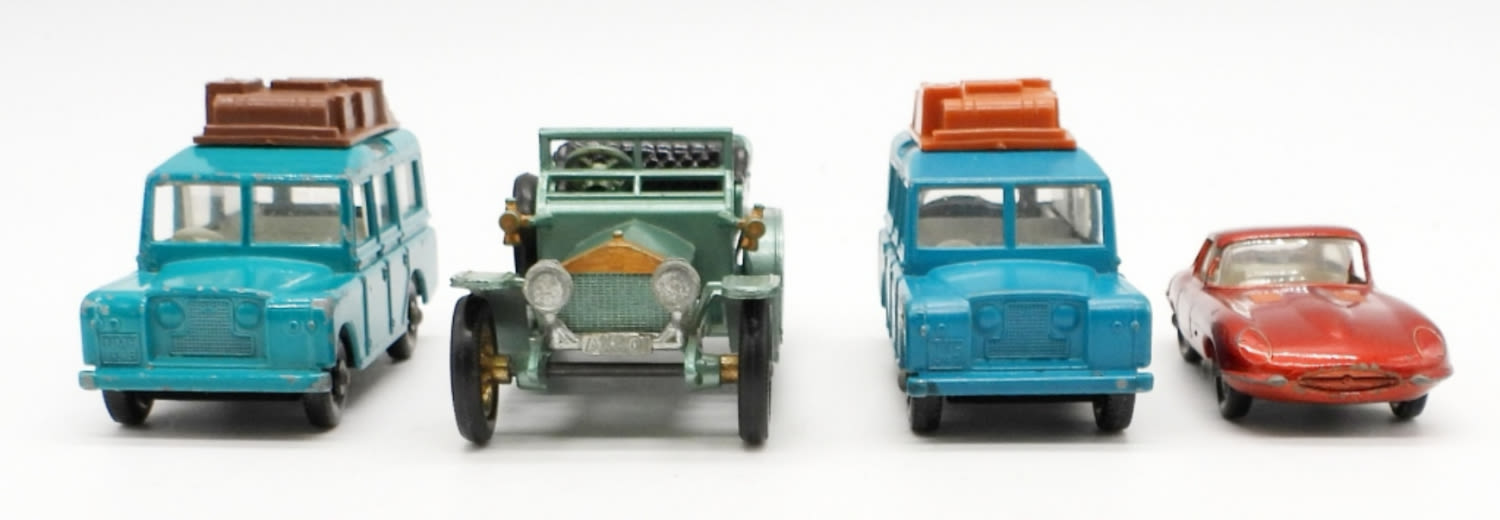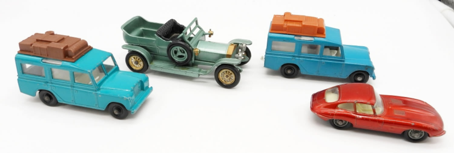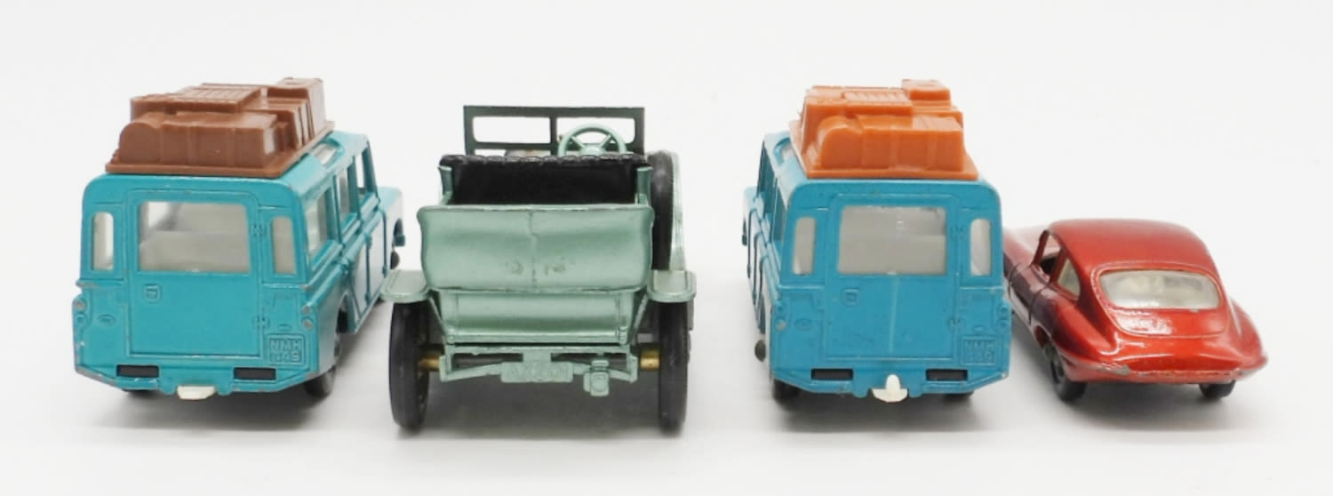 “E” TYPE JAGUAR RED #32 LESNEY ENGLAND, 1907 ROLLS ROYCE SILVER GHOST #15, (2) LAND ROVER SAFARI #12