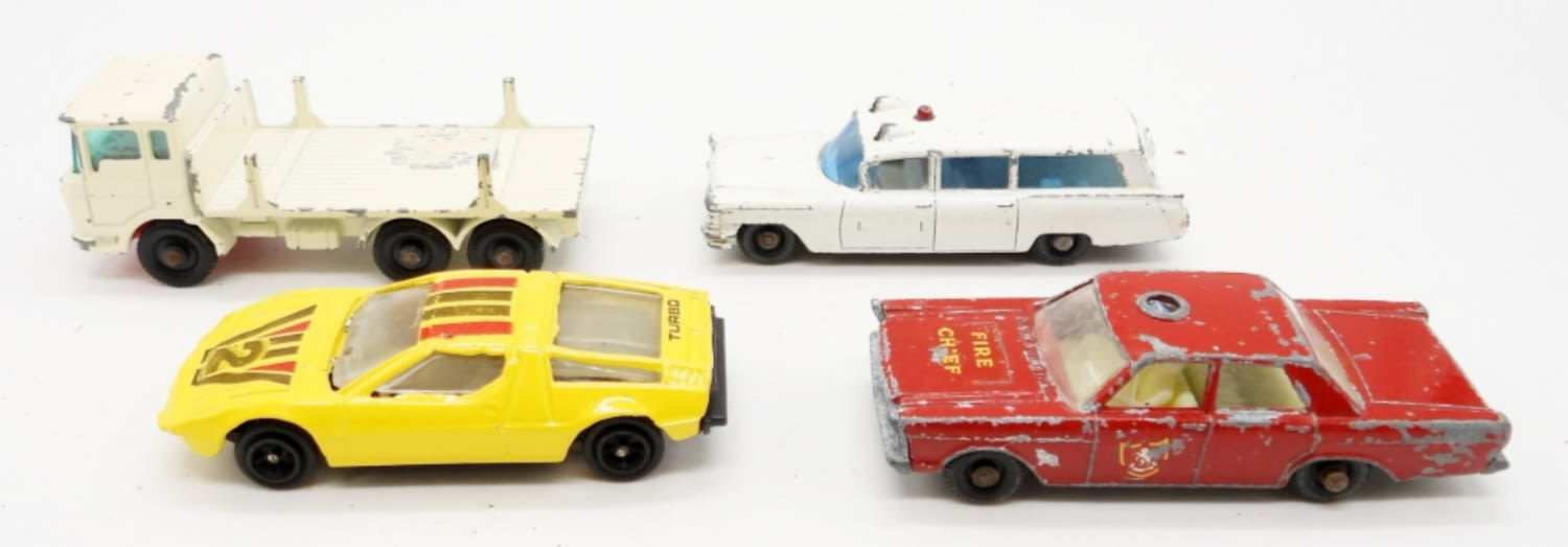 VINTAGE LESNEY MATCHBOX CARS, TRUCKS, FIRE TRUCK, AMBULANCE AND MORE