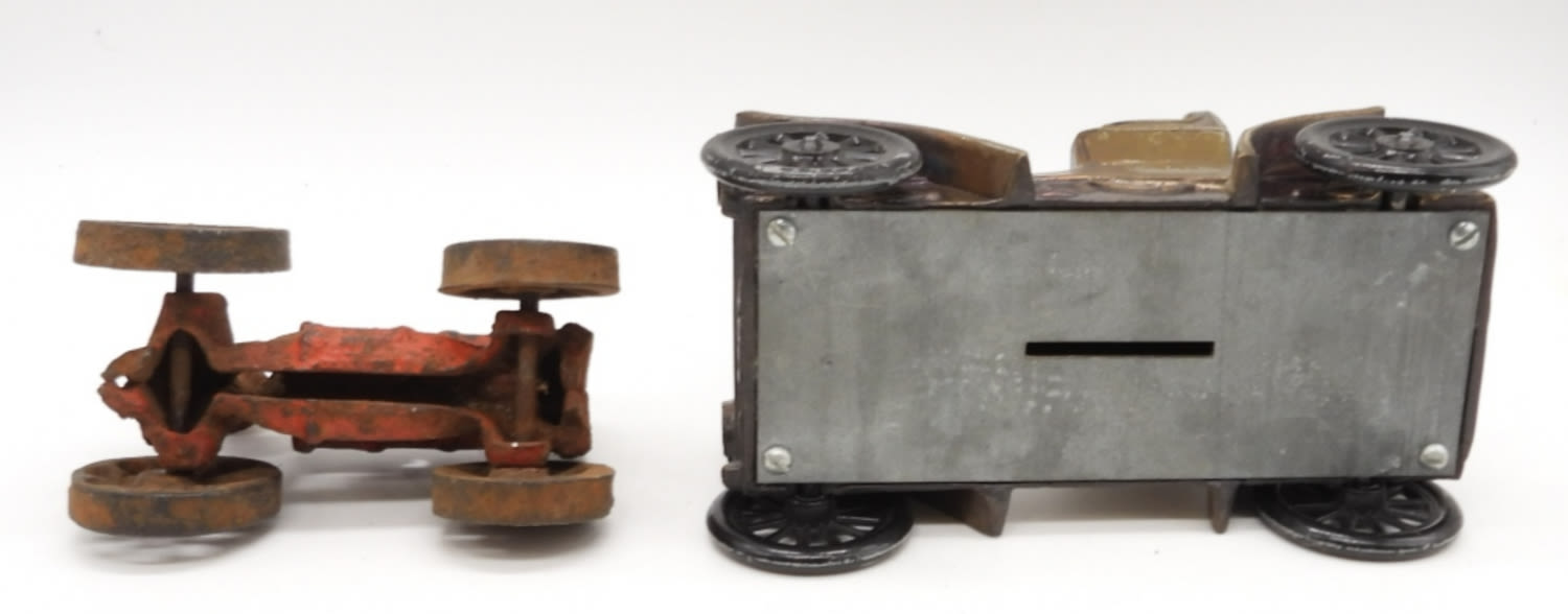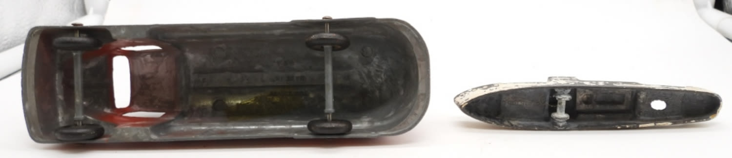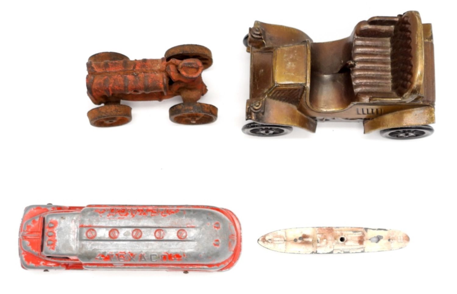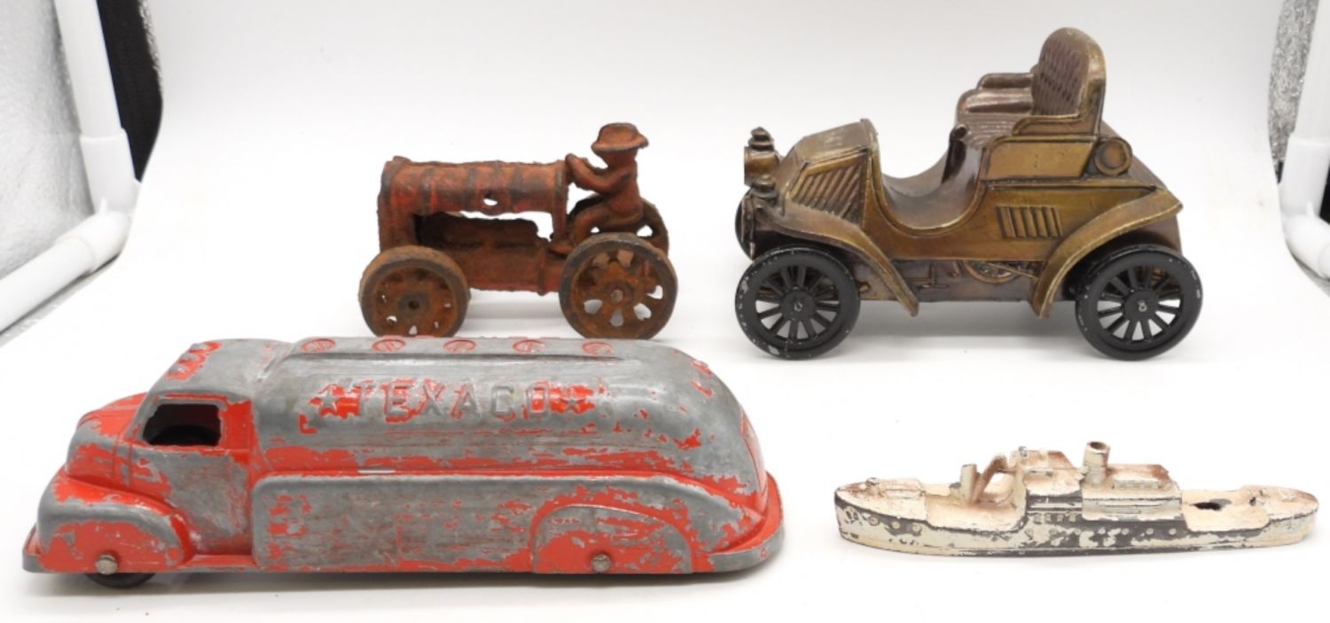 (2) TOOTSIE TOY STAMPED CAST IRON, TEXACO BUS, SUBMARINE; ANTIQUE CAST IRON TRACTOR AND OLD MODEL CAR