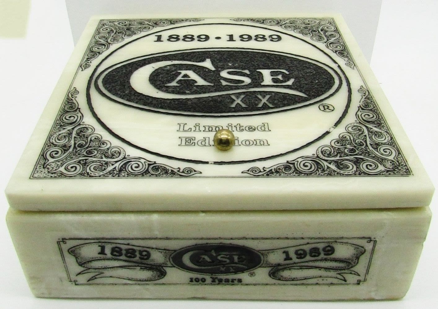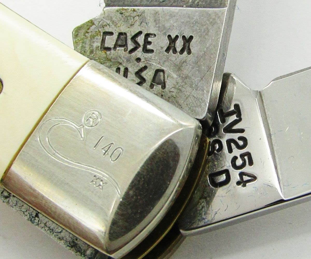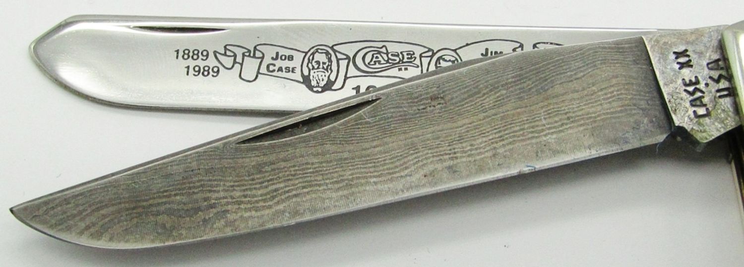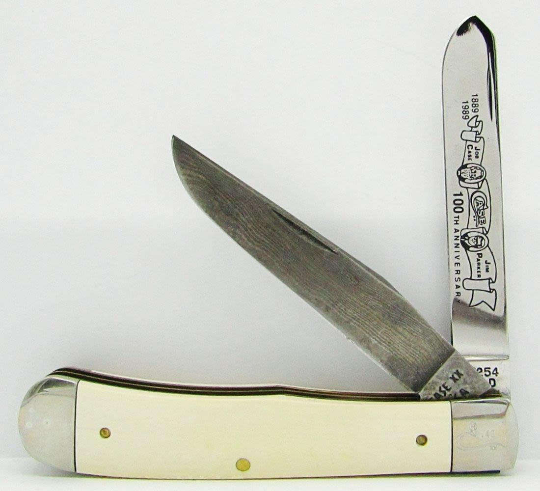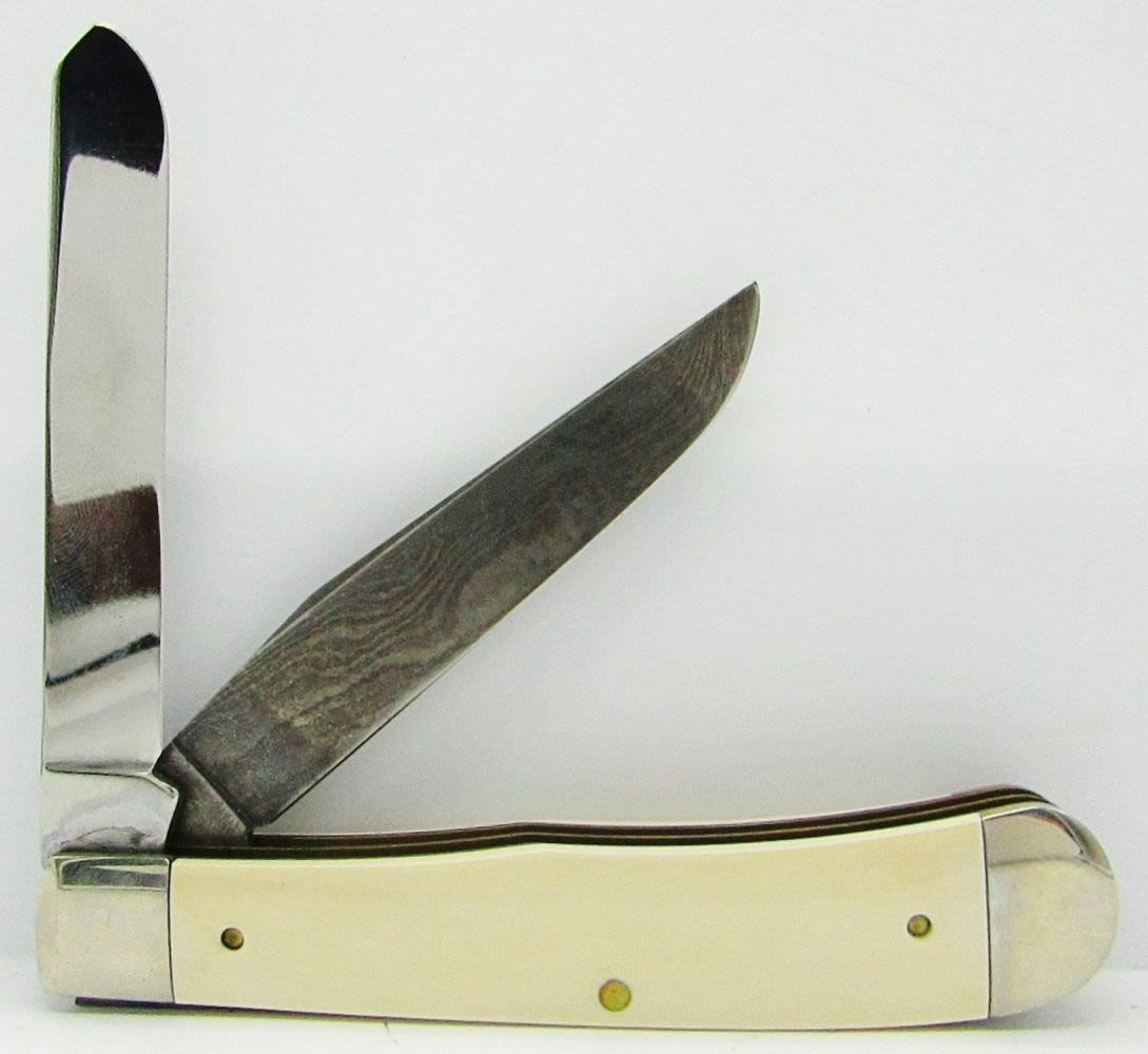 IV254SSD Surgical Steel Blade Photo-Etched with Job Case & Jim Parker, Combined with Unique 512 Layer Damascus Steel Spey Blade. Mastadon Bone Handles; In Display Box made of Pure, Crystalline Cultured Marble, With COA.