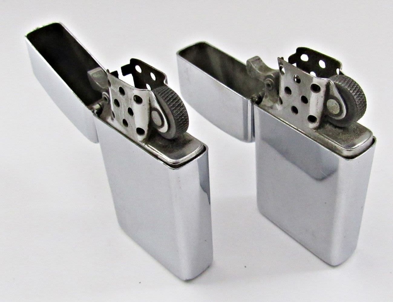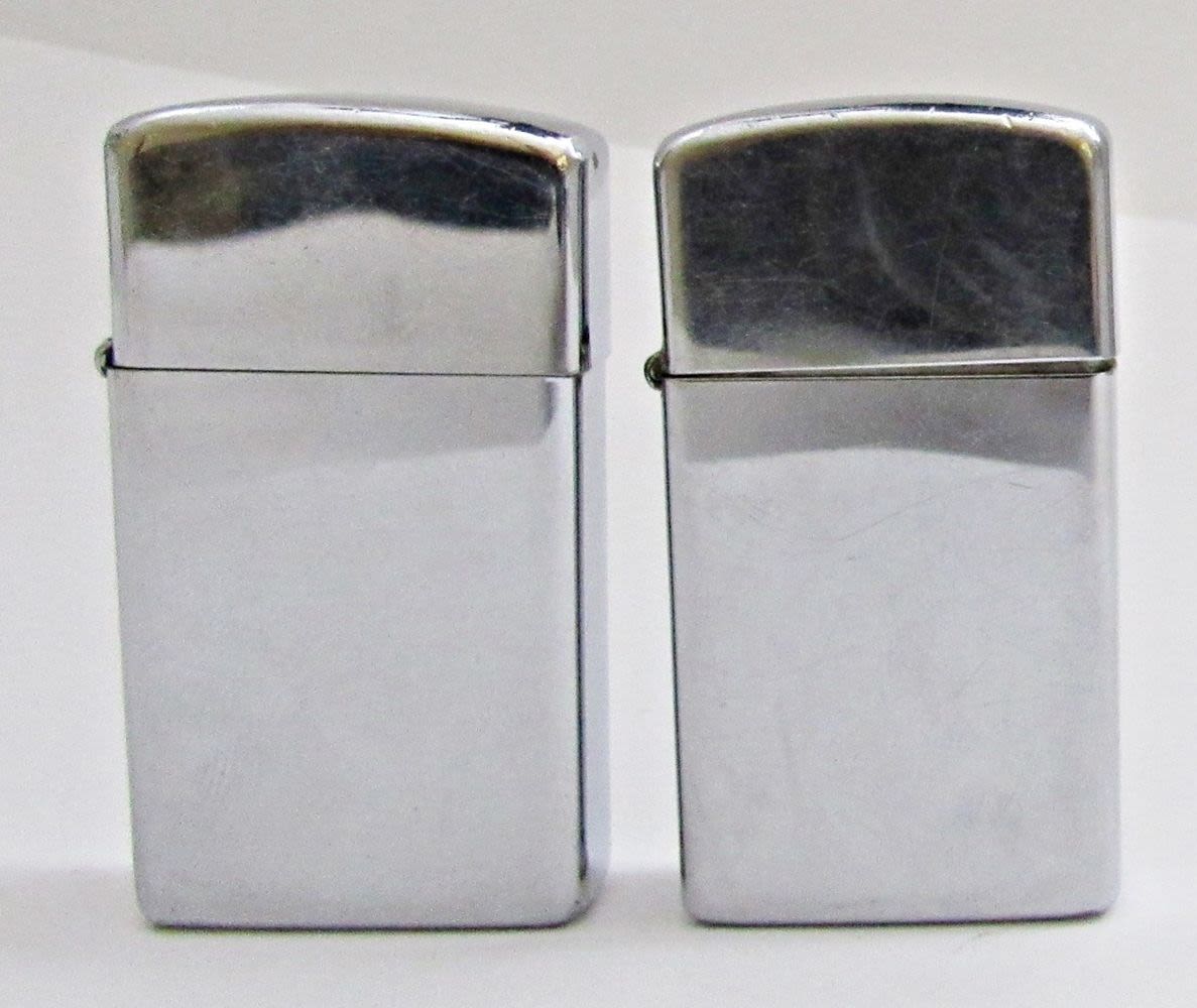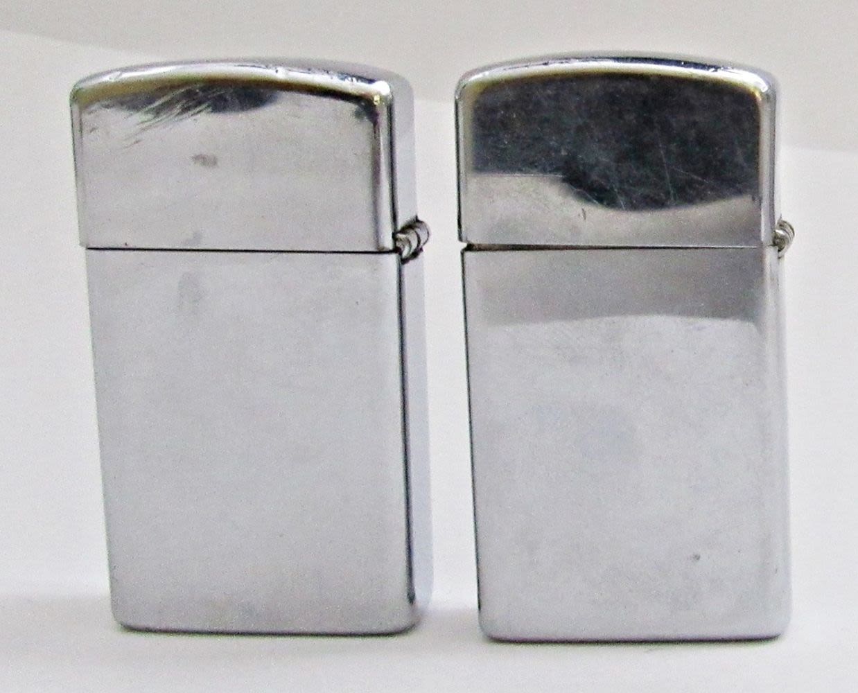 1970 & 1974 SLIM STYLE SILVER TONE ZIPPOS; USED NICE OVERALL CONDITION