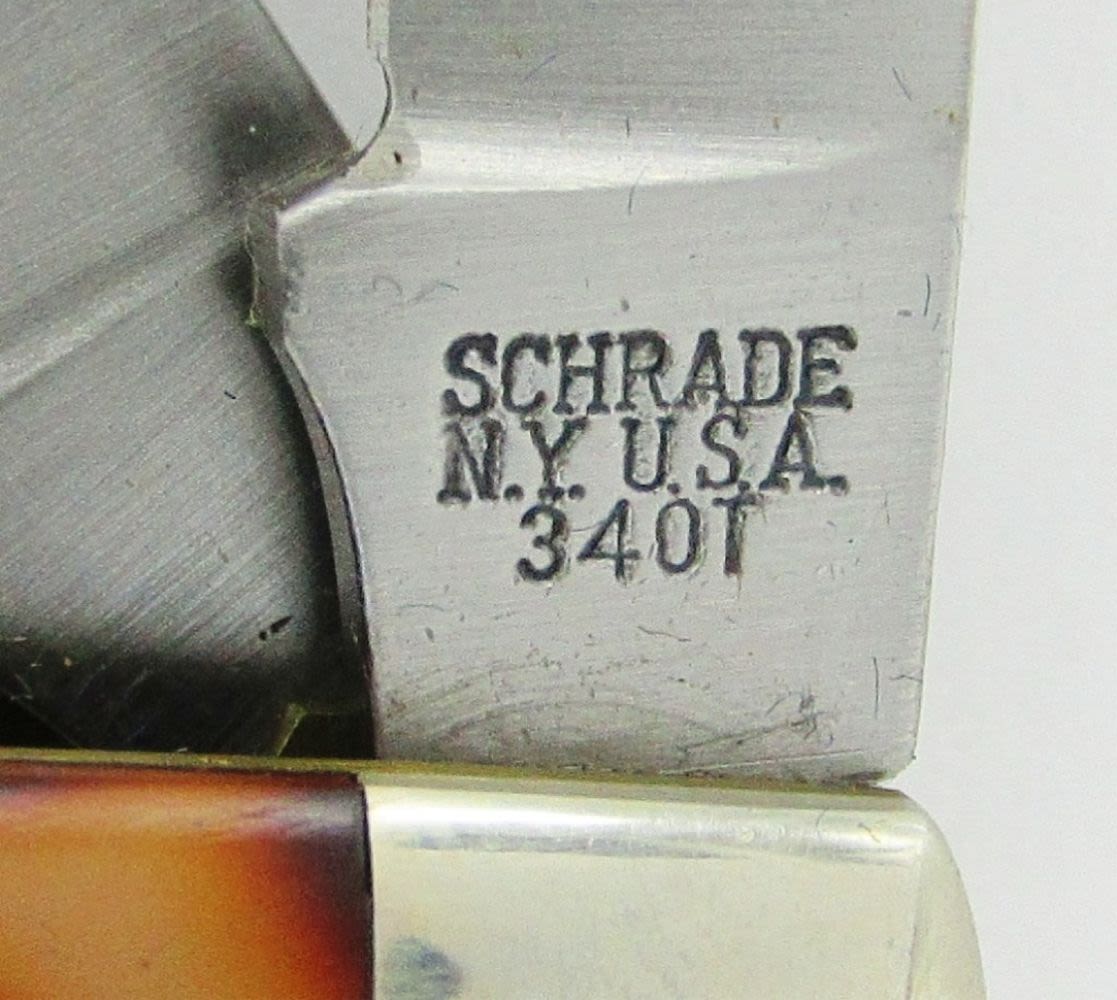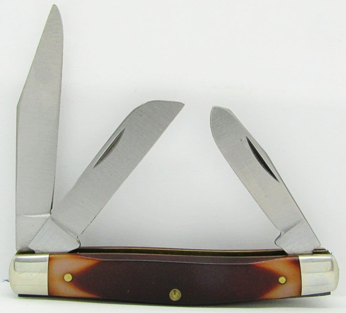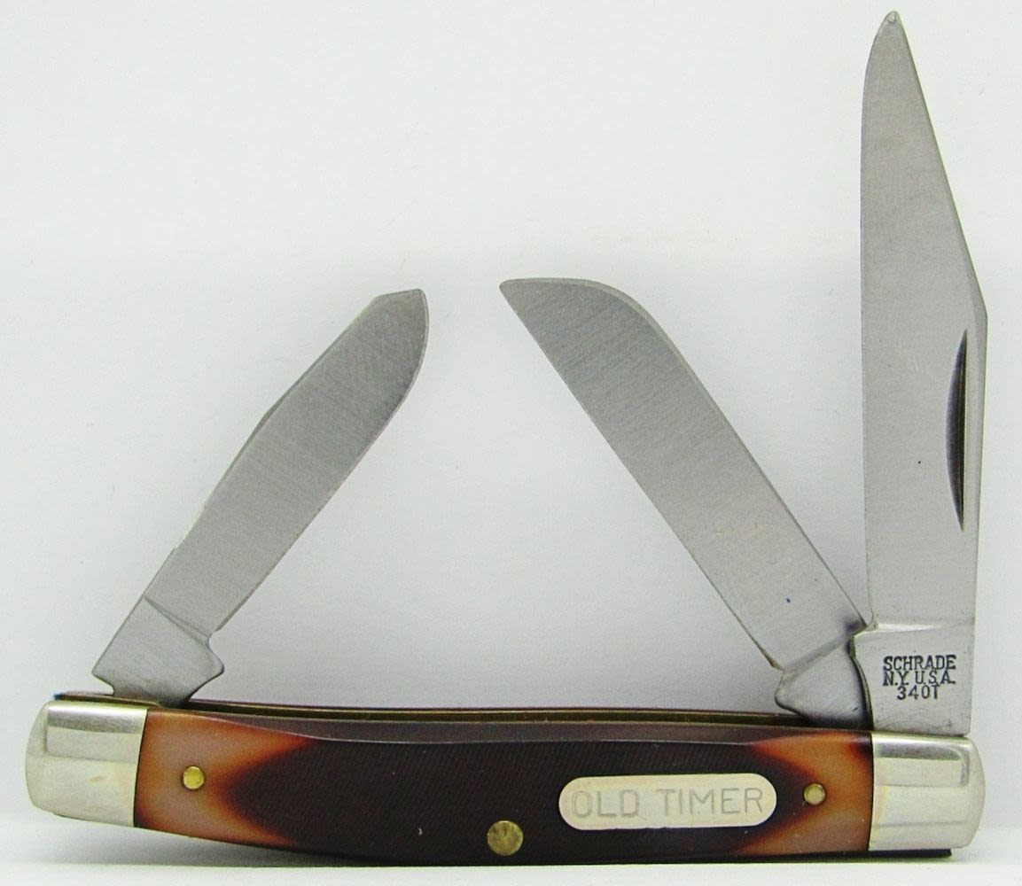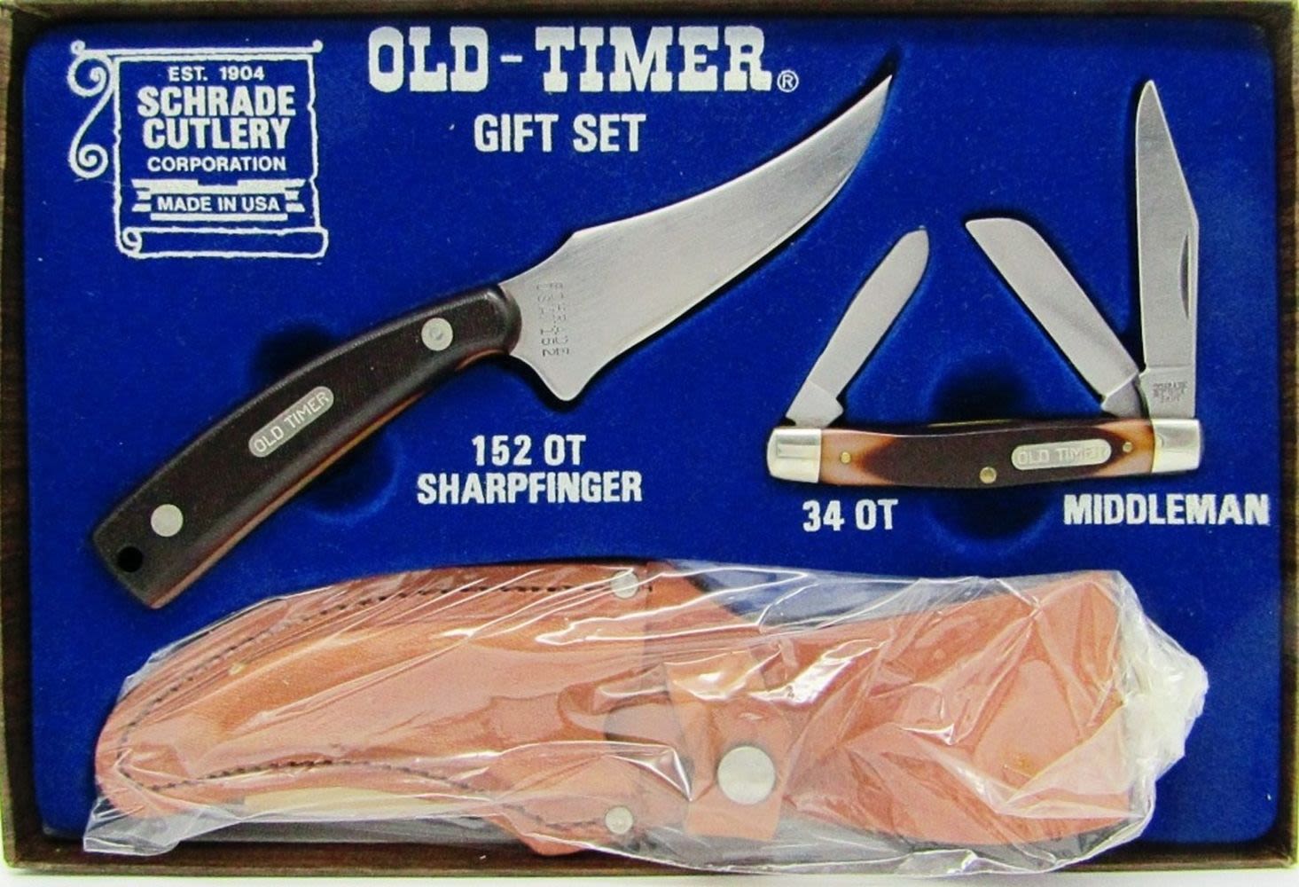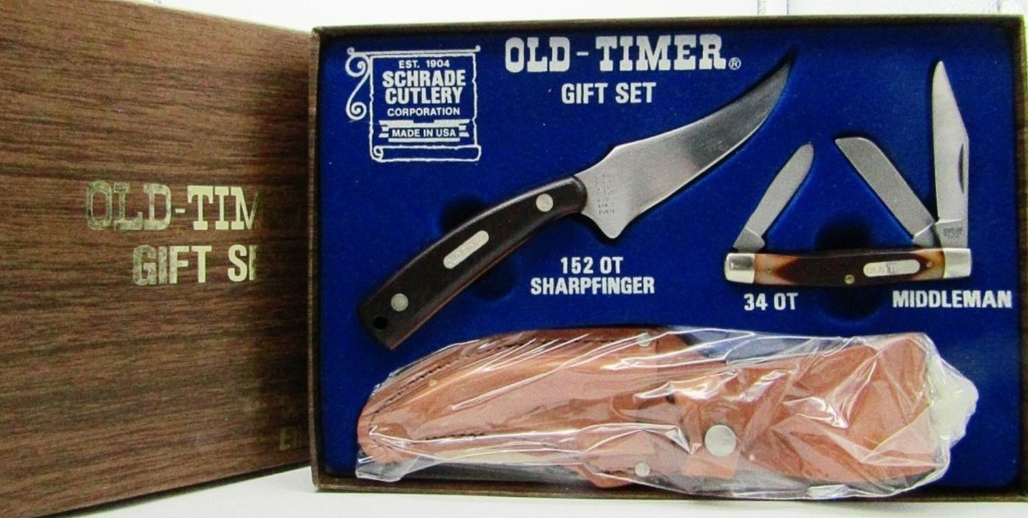 Schrade 152OT Knife Old Timer Sharp Finger Skinning Hunting with Leather Sheath; Schrade USA Vintage 34OT Old Timer Middleman Stockman 3-Blade Pocket Knife. New In Gift Box!