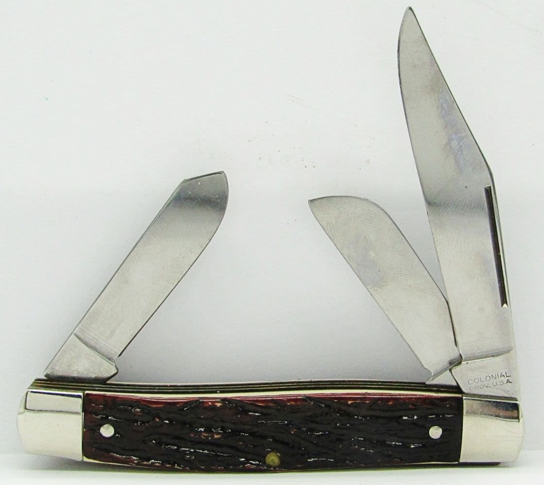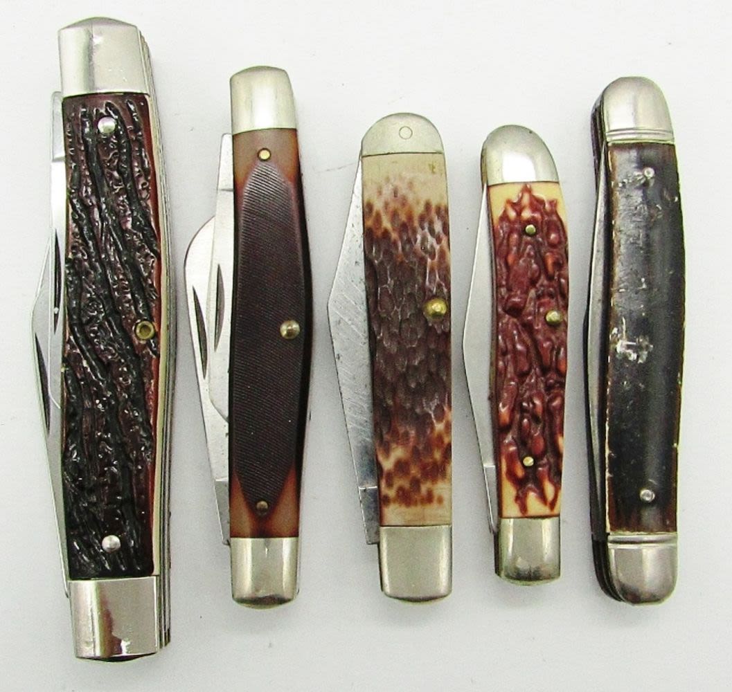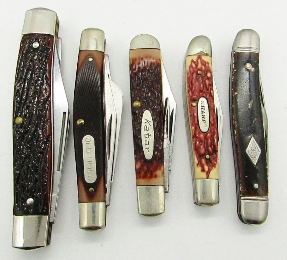 3-Blade Colonial Prov. RI; 3-Blade Schrade Old Timer USA 840T; 2-Blade Kabar 1026; 2-Blade Sharp 270; 2-Blade Imperial Prov. RI USA; Used Conditions.