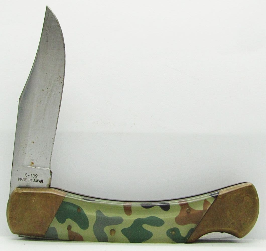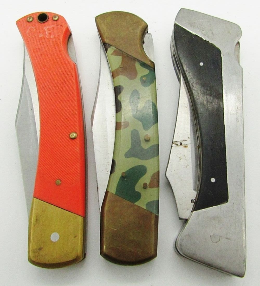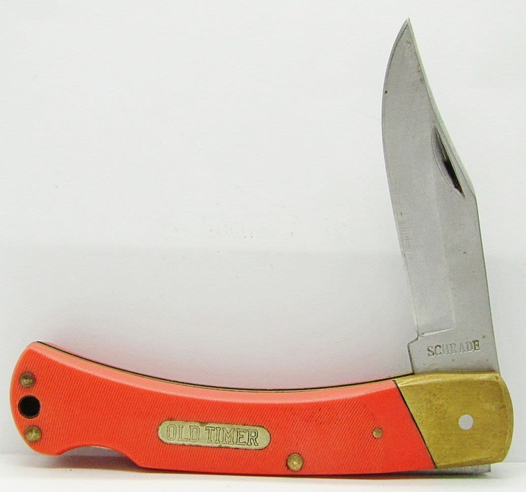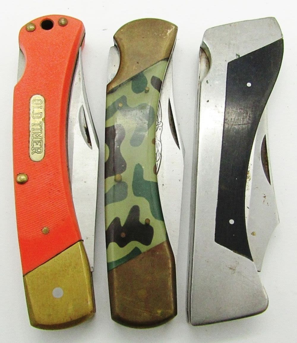 Single Blade Schrade Old Timer 6OTO Lockback Orange Handle; Single Blade Parker Imai Special Forces Surgical Steel Camo Handle Lockback; Single Blade Sharp 300 Lockback; Used Conditions.