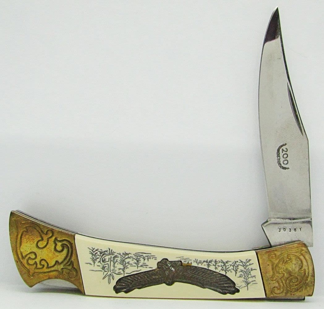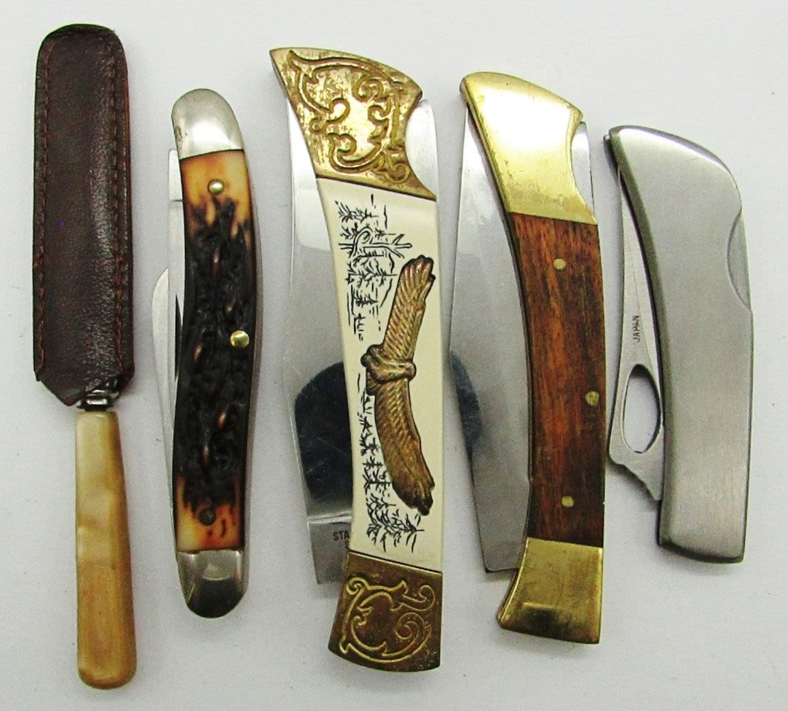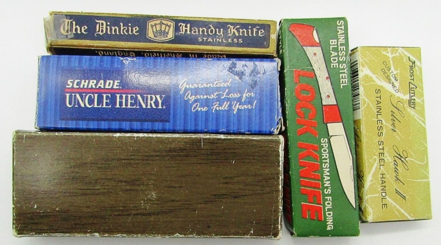 Schrade Uncle Henry 897UH; Sportsman’s Folding Lock Knife; The Dinkie Handy Knife Made In Sheffield England; Frost Cutlery Silver Hawk II”Troop 118″ Lagrange Ohio; American Eagle Folding Pocket Knife; New In boxes!
