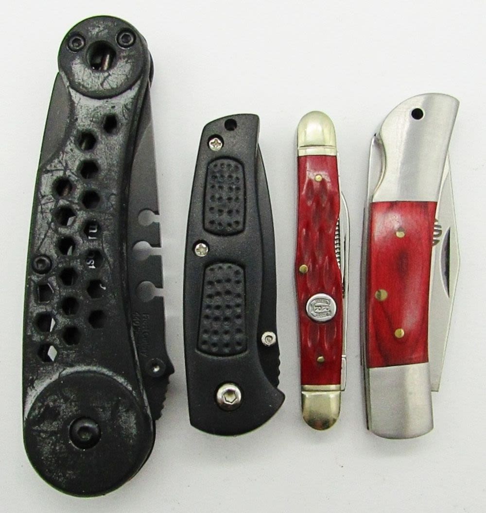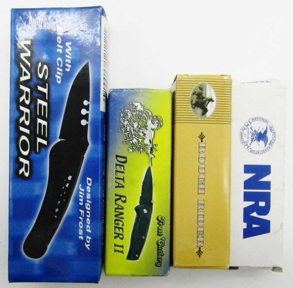 Steel Warrior Lockback; Frost Cutlery Delta Ranger II; Rough Rider 440; NRA National Rifle Association Lockback; All New In Boxes.