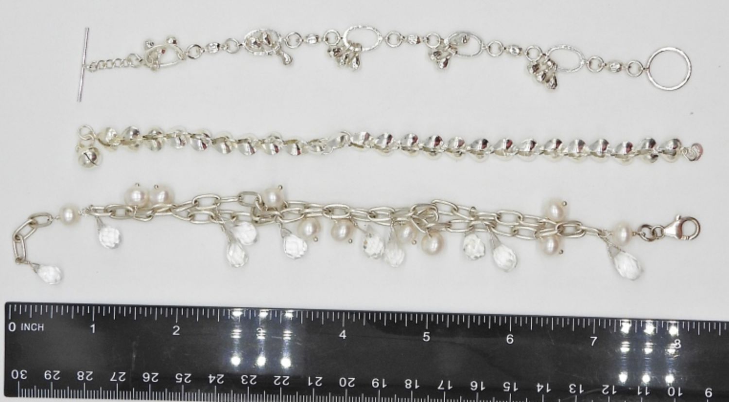 47.6 DWT STERLING BRACELETS 8″, FAUX PEARL & GEMSTONES; (2) MARKED 925