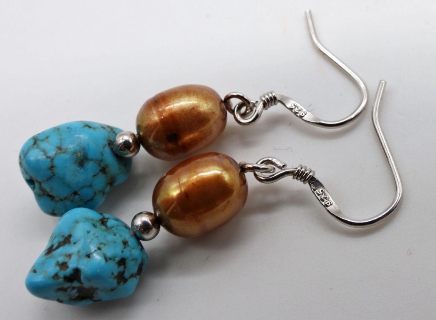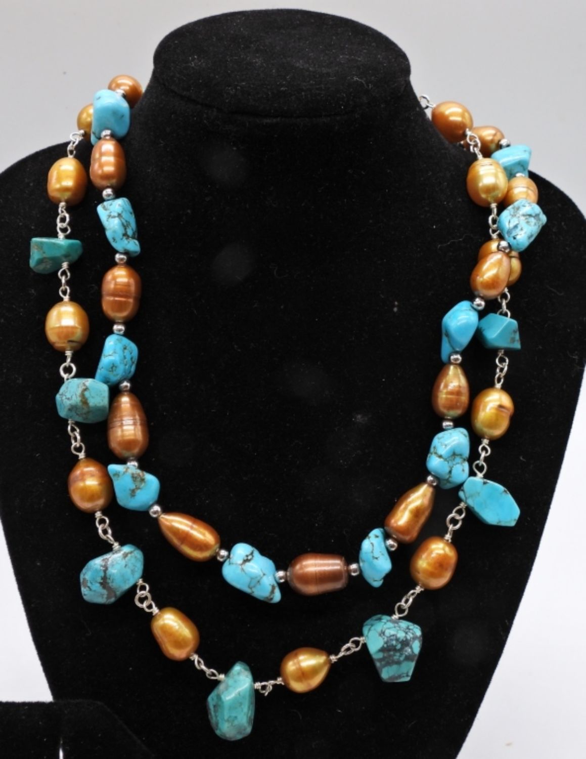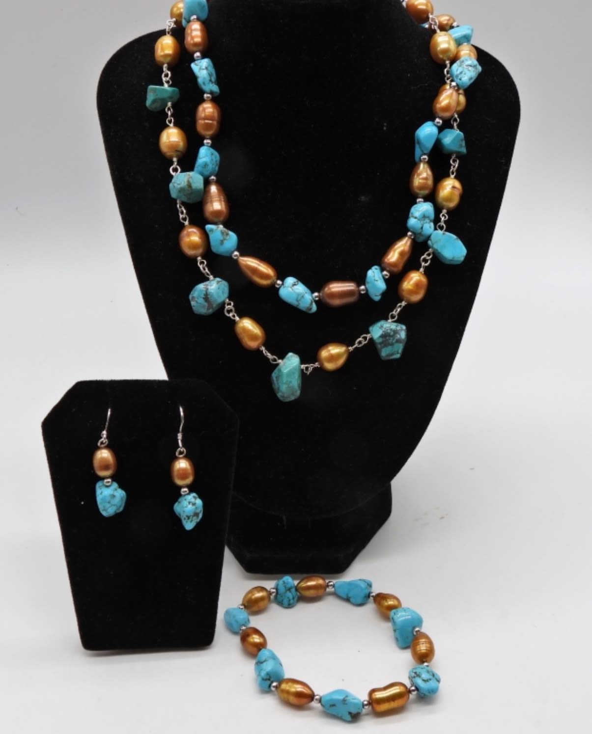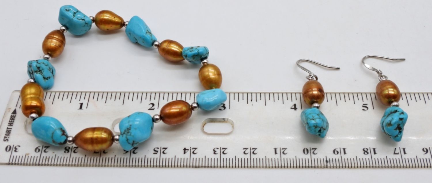 2- NECKLACES 1-18IN LONG WITH STERLING CABLE CHAIN IN BETWEEN STONE AND PEARLS, ADJUSTABLE, CLASP STAMPED 925, 1-16IN LONG PEARL AND STONE WITH STERLING MINI BEADS, CLASP STAMPED 925, 1- STRETCY BRACELET, 3IN WIDE, DANGLED EARRINGS TO MATCH