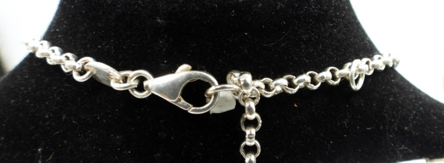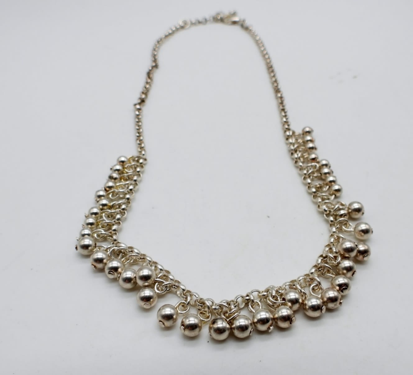 15.3DWT, 19IN LONG, TINY STERLING BALLS DANGLE IN THE MIDDLE, LOBSTER CLASP, STAMPED 925 NEAR THE CLASP, ADJUSTABLE