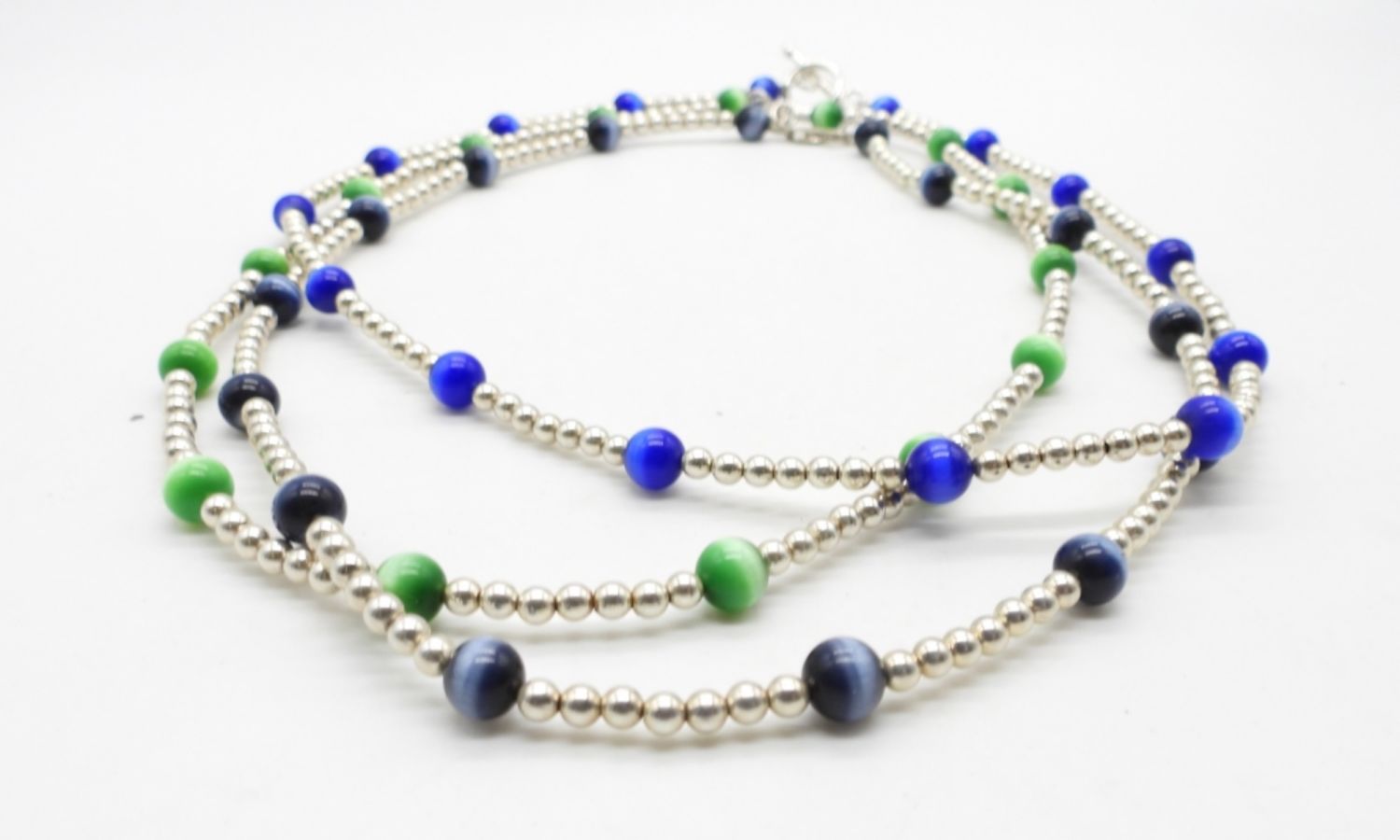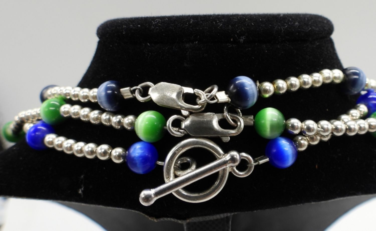 20DWT, 16IN LONG, 2- LOBSTER CLASP 1- TOGGLE CLASP, GREEN, BLUE, BLACK AGATE BEADS