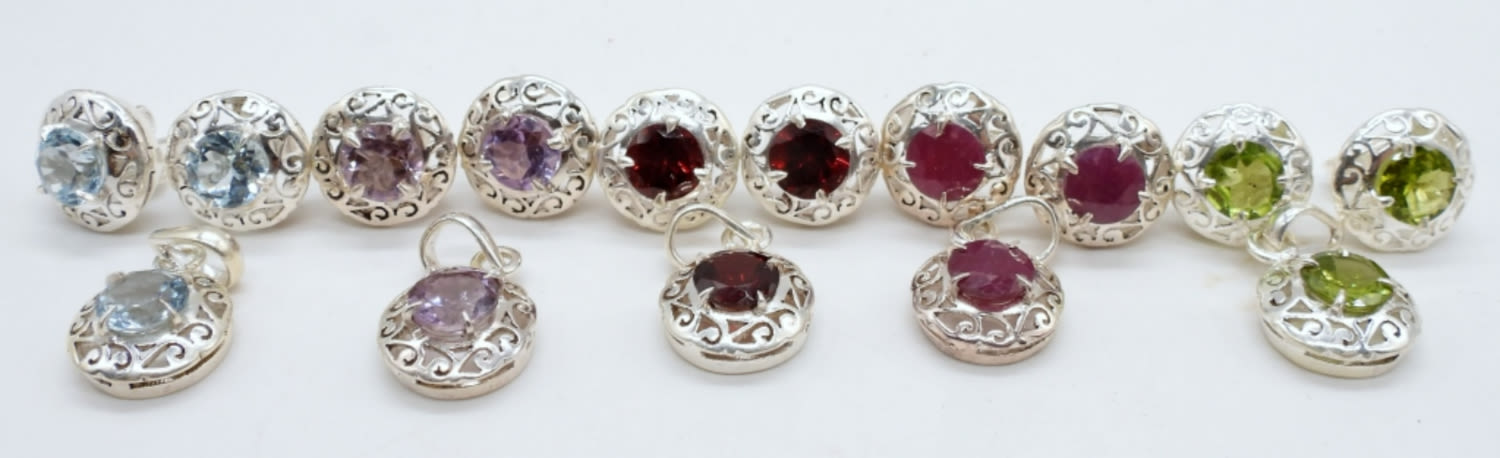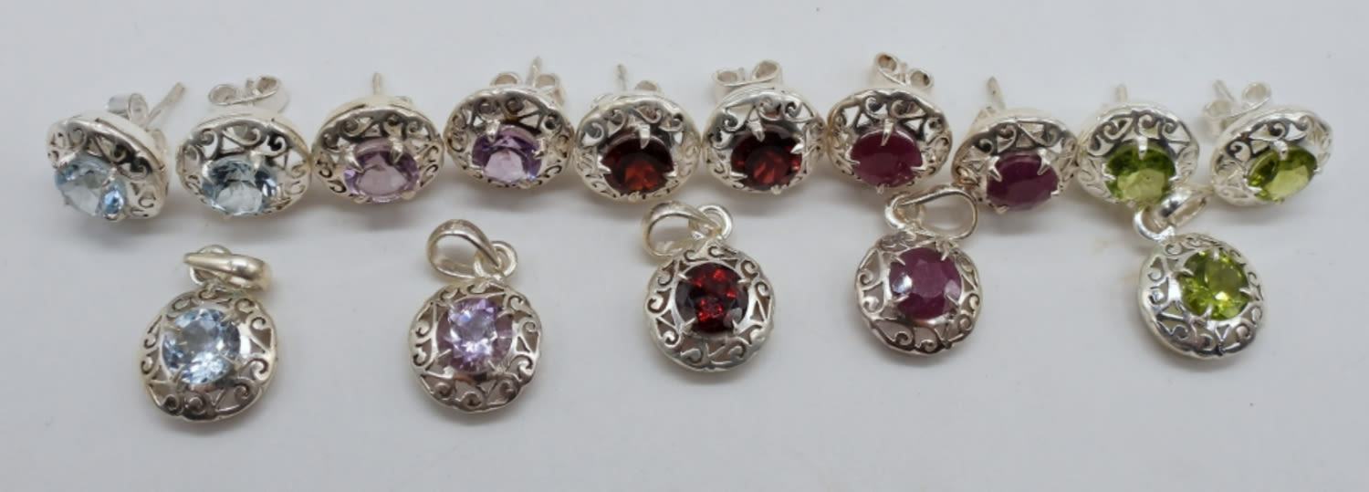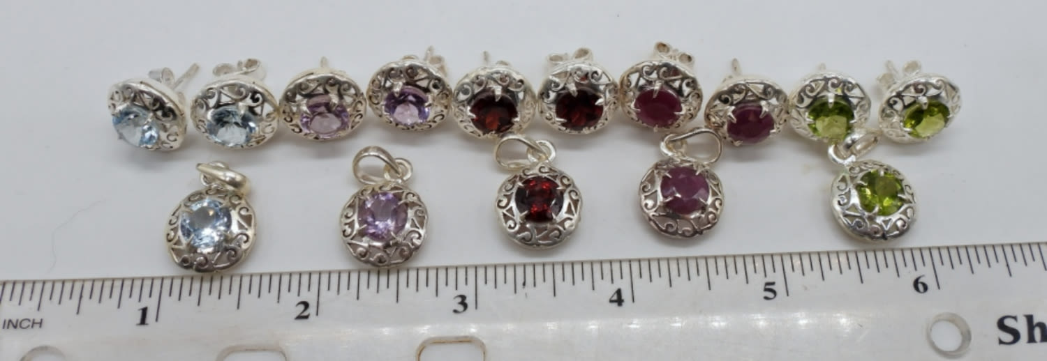 24DWT, PENDANTS ARE 1 IN LONG, 1-GARNET (JAN), 1-PERIDOT (AUG), 1-ZIRCONIA (DEC), 1- LAVENDER (JUNE), 1-ROSE (OCT), NO STAMPING