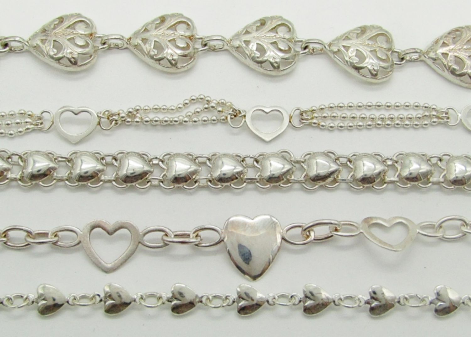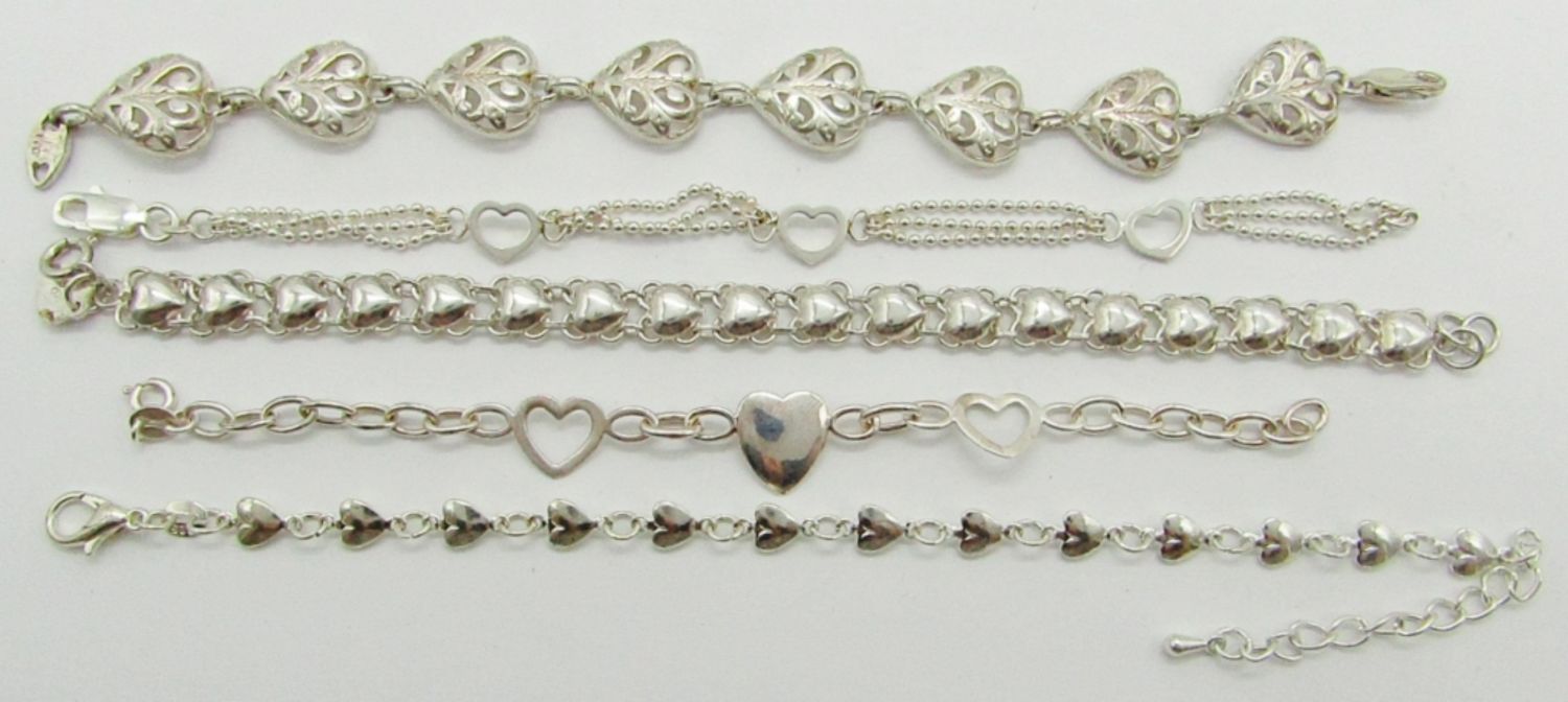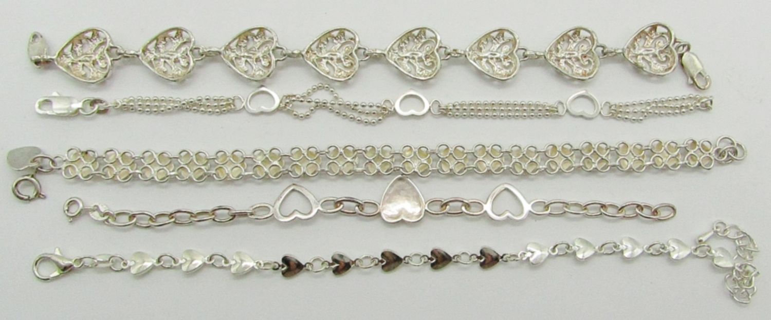 6″, 7″, & 7″ Sterling Silver Bracelets With Heart Designs; Marked 925, 925 Mexico, 925 India; 22.7 dwt.