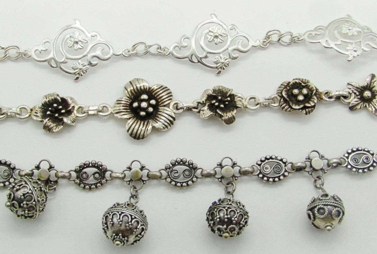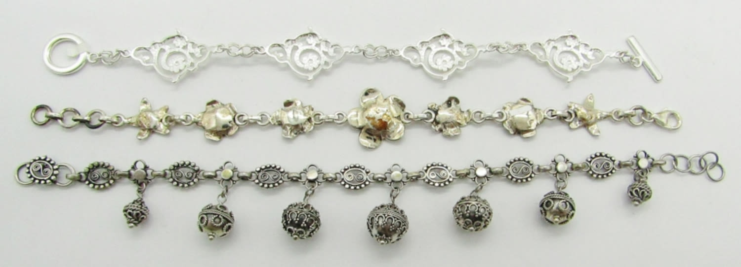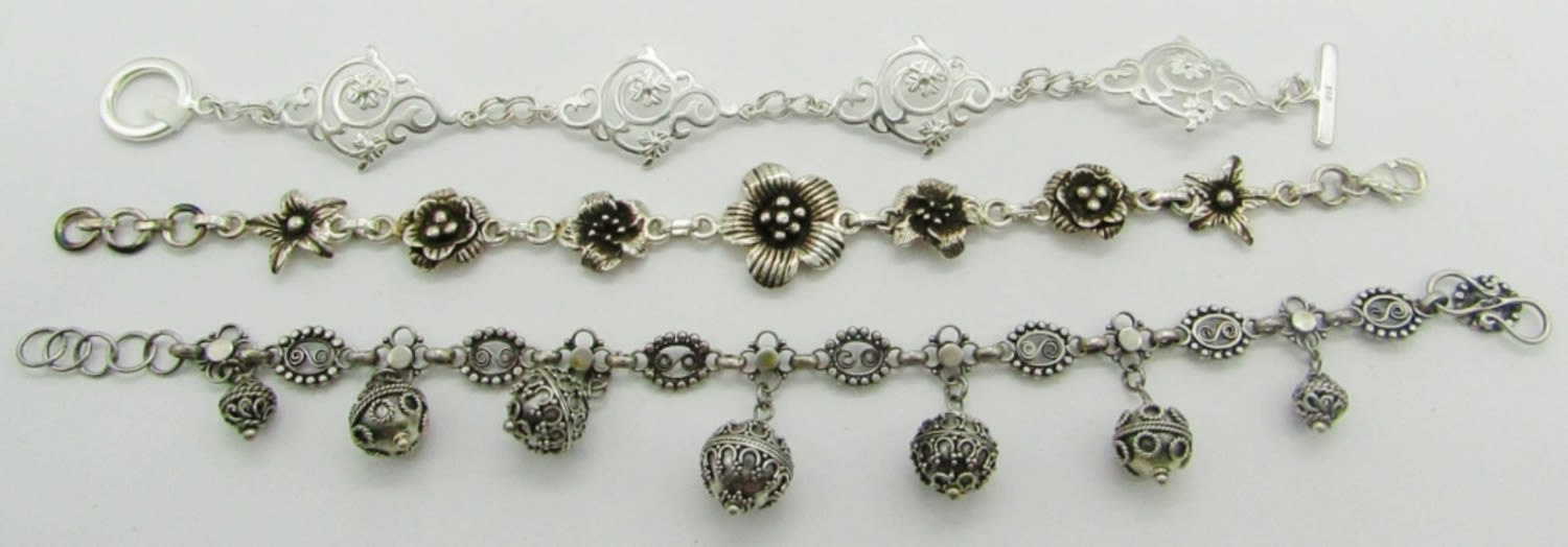 925 Flowers; 925 Art Deco Hanging Silver Balls; 925 Children of Lir Bracelet; 25.5 dwt.