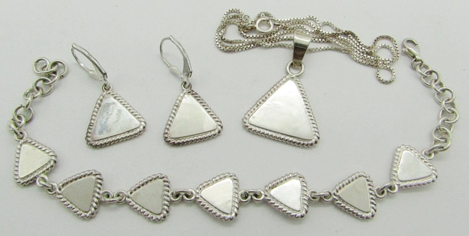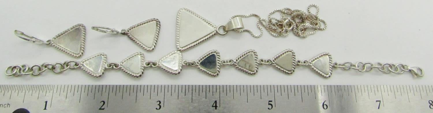 Marked 925; Triangle Charm Pendant Necklace 18″; Triangle Link Bracelet 8″; 20 dwt.