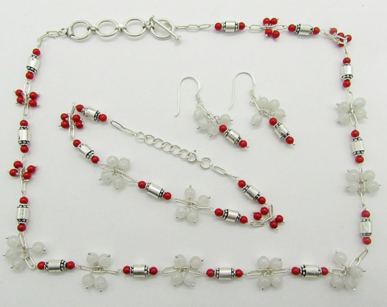 19″ Necklace, 8″ Bracelet, 1″ Earrings; Opalescent, Coral, and Sterling Beads!; 20.9 dwt.
