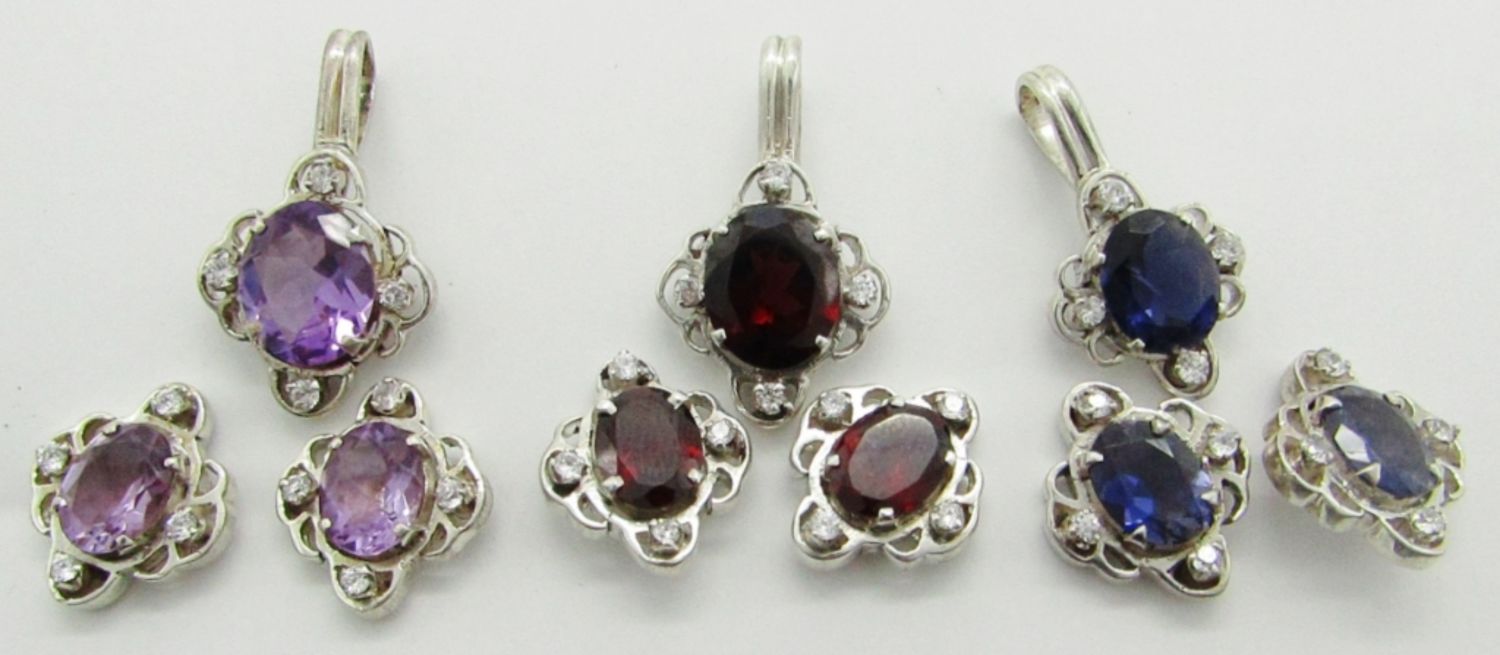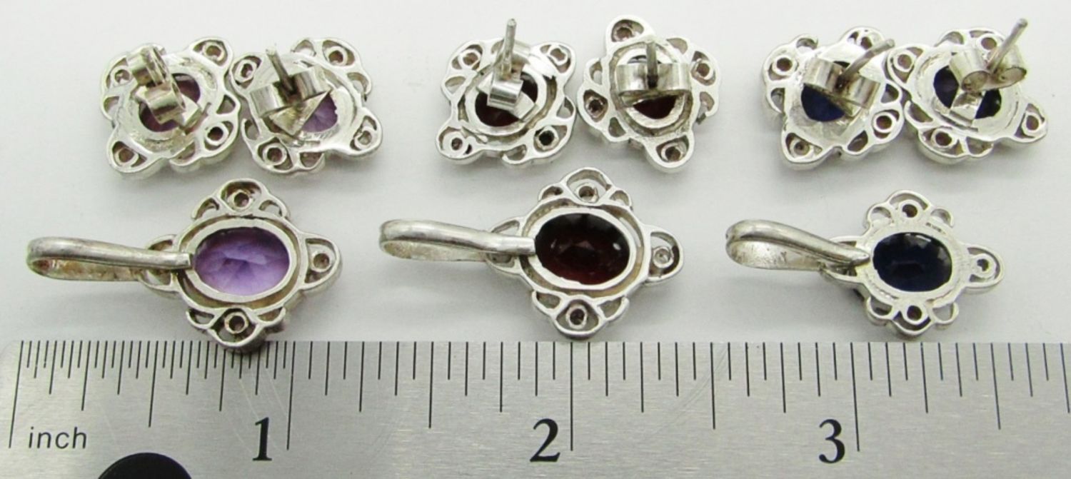 Purple Sapphire, Amythest, and Garnet with Sterling Silver Pierced Earrings & Necklace Pendants; 16.5 dwt.