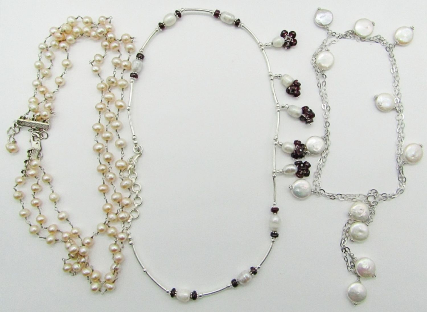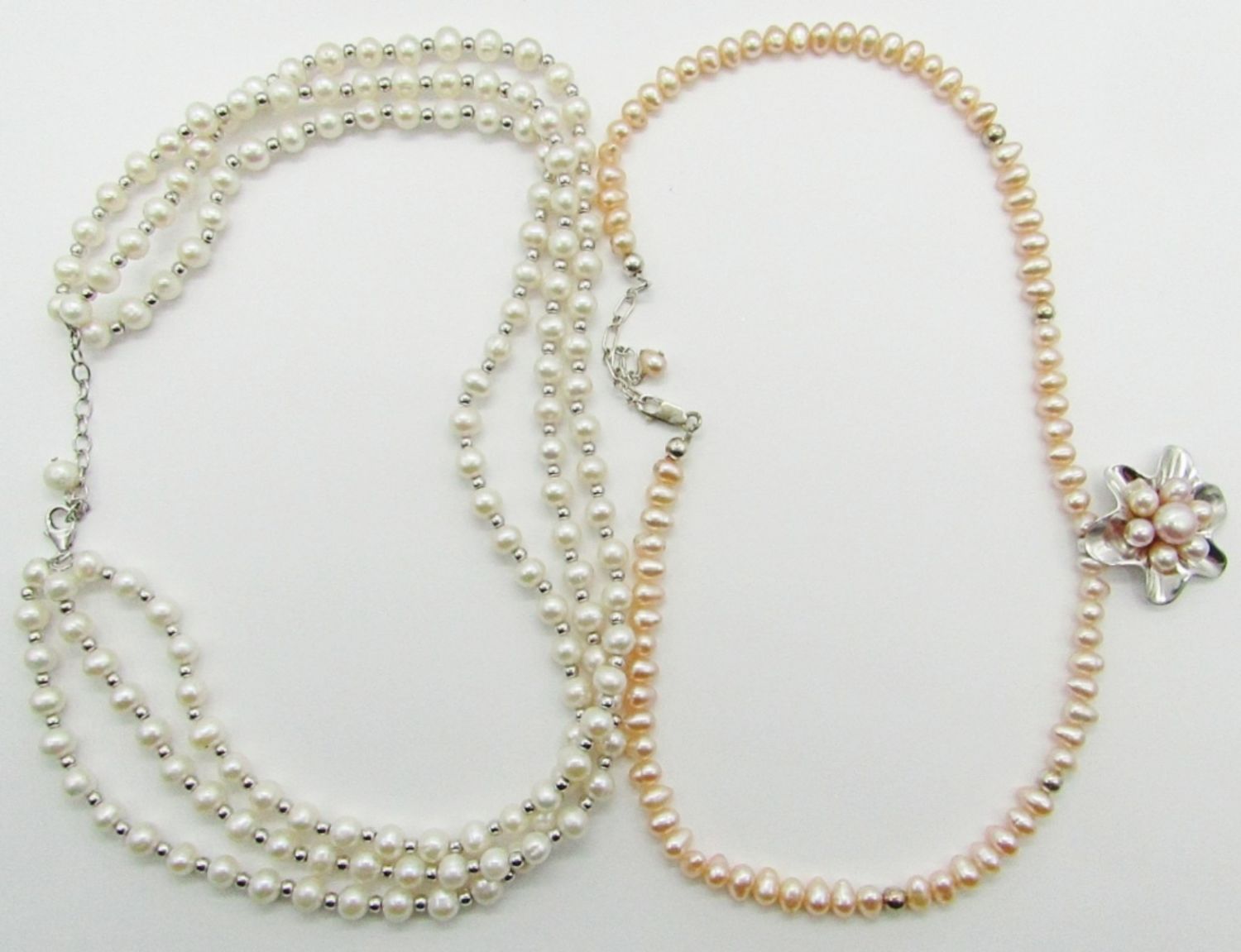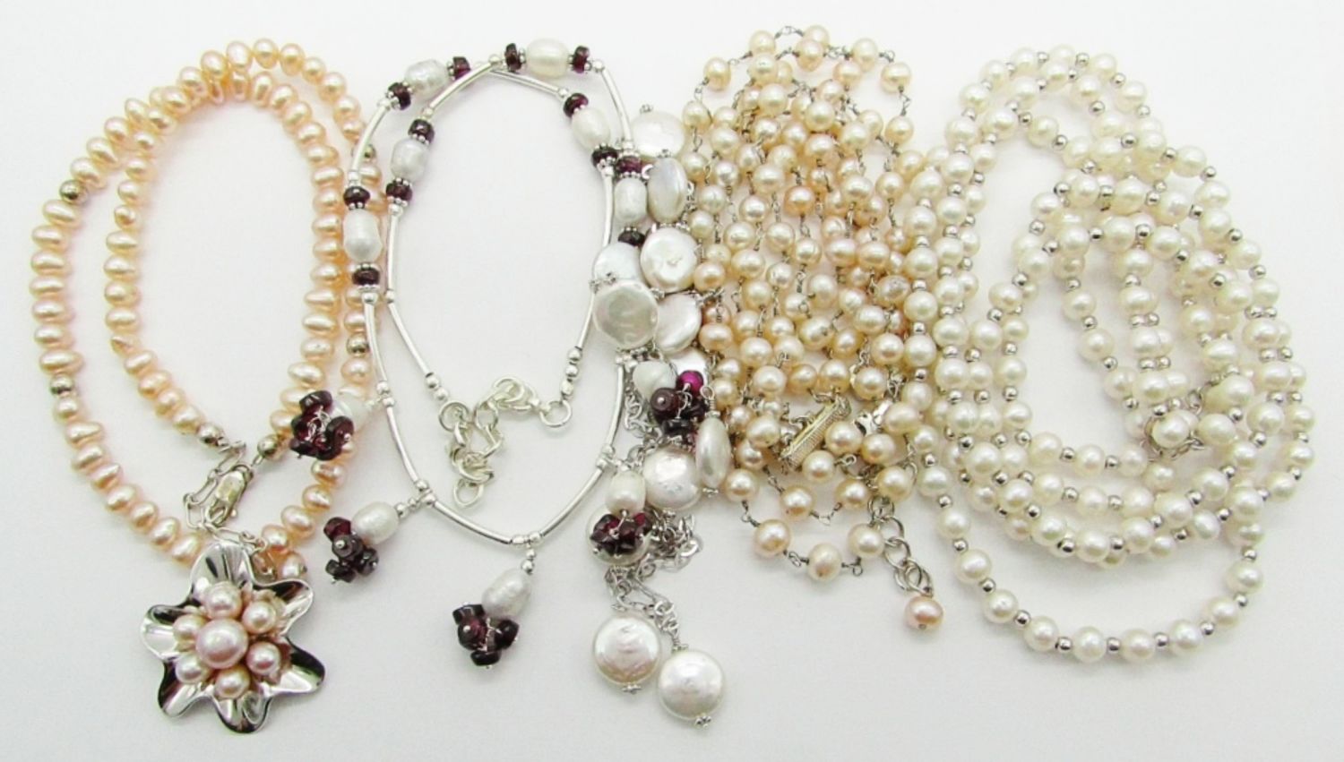 19″ Marked 925 Sterling, Pearl, Red Stone; 26″ Marked 925 Sterling and Pearlescent Beads; 20″ Marked 925 Sterling, Pink Pearl, Flower Pendant; 18″ Marked 925 Sterling, Pearls; 18″ Marked 925 Sterling, Pearl Triple Strand.