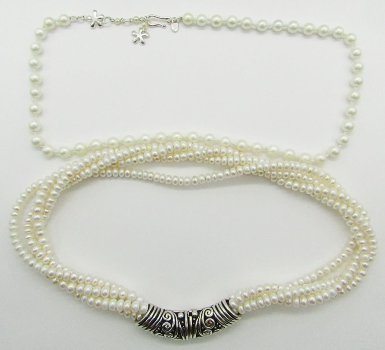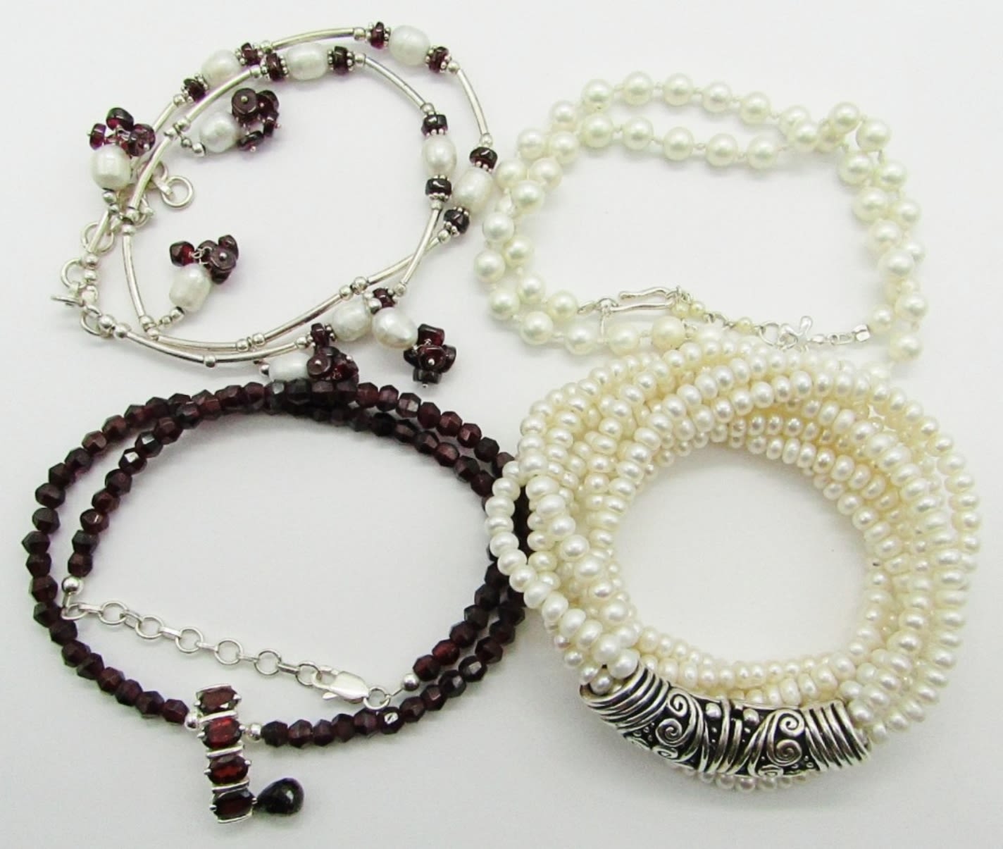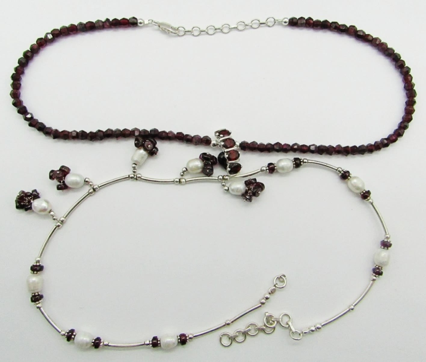 16″ Marked 925 Sterling, Garnet; 15.5″ Marked 925 MEX Multi Strand Sterling, Pearl; 18″ Marked 925 Sterling, Pearl; 18″ Sterling, Pearl, Garnet.