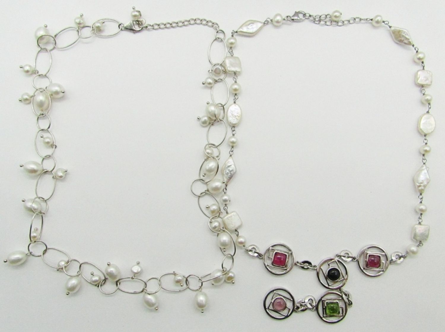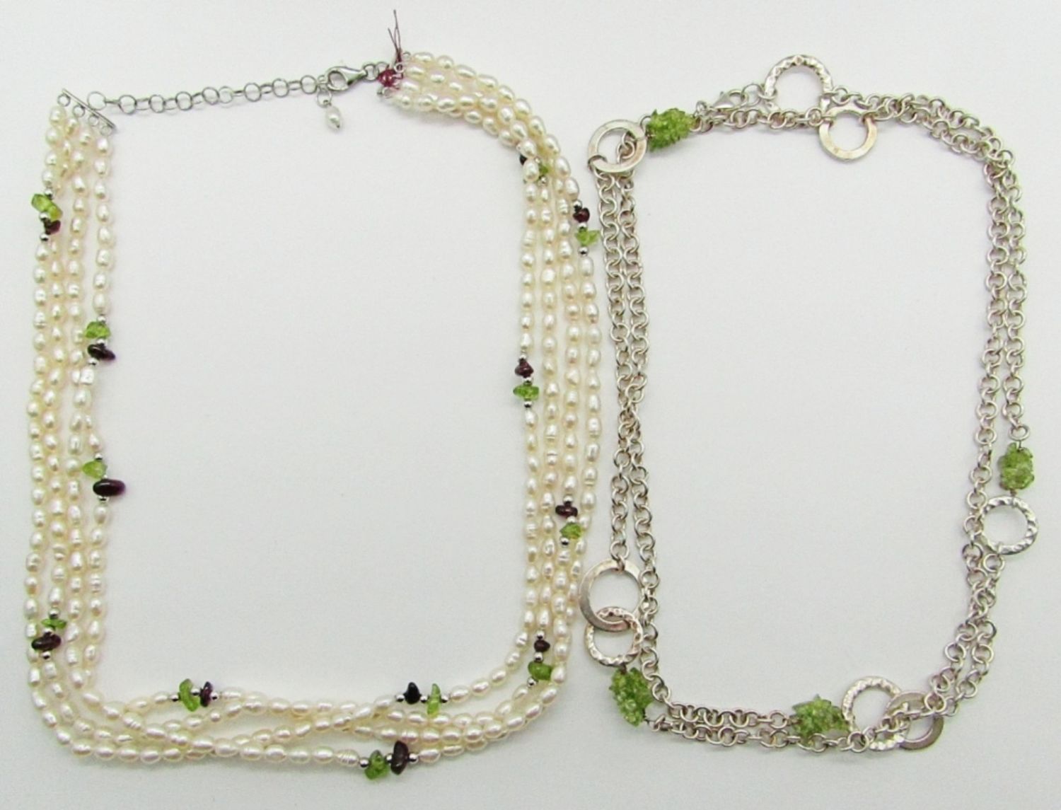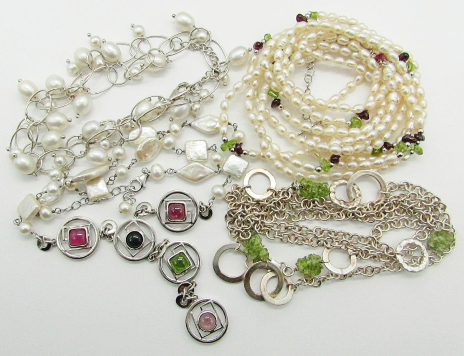 17″ Marked 925 Multi Strand Pearl, Sterling, Bead; 18″ Marked 925 Sterling, Pearl, 3.5″ Dangle Pendant; 18″ Marked 925 Sterling, Pearl; 37″ Marked 925 Sterling, Green Cluster Beads.